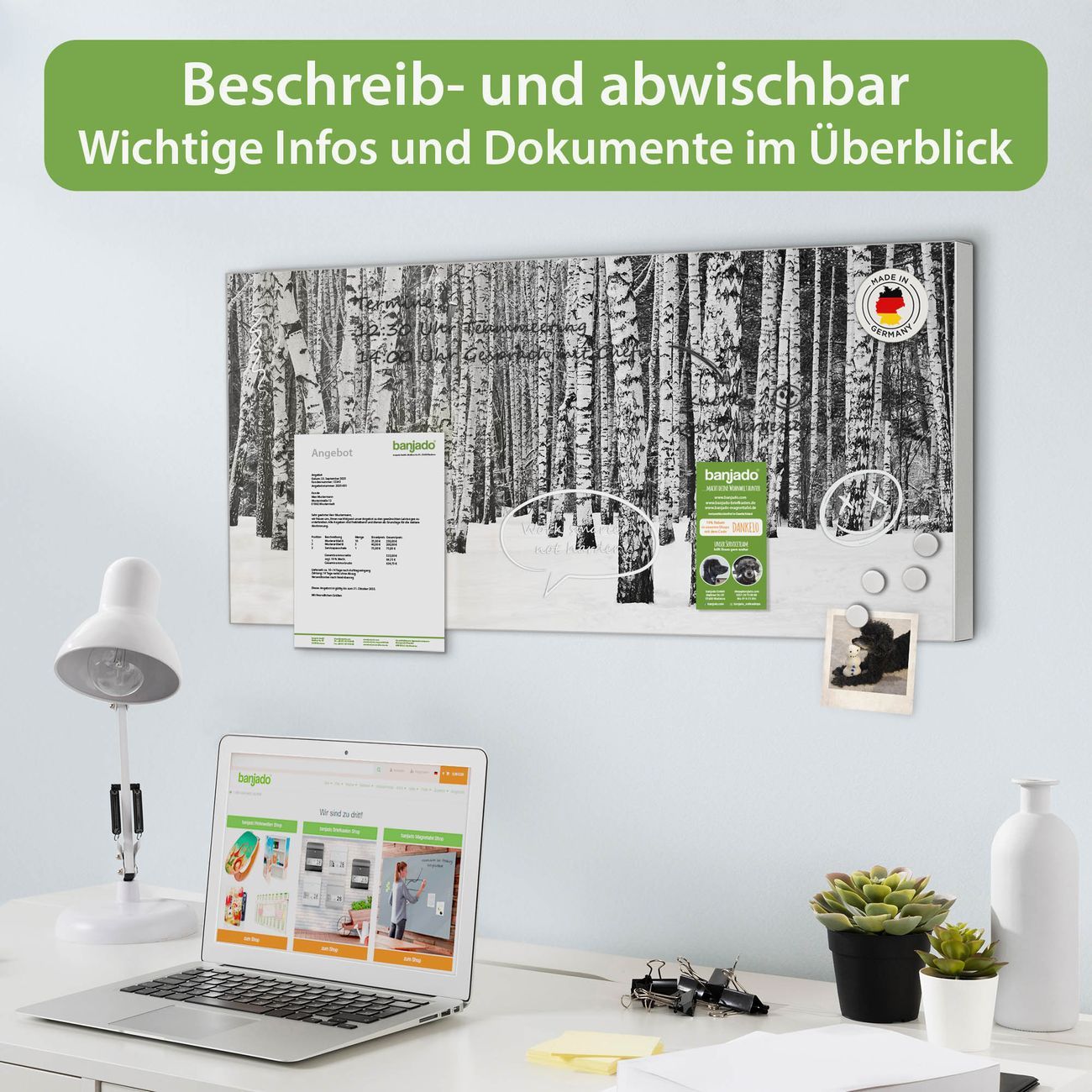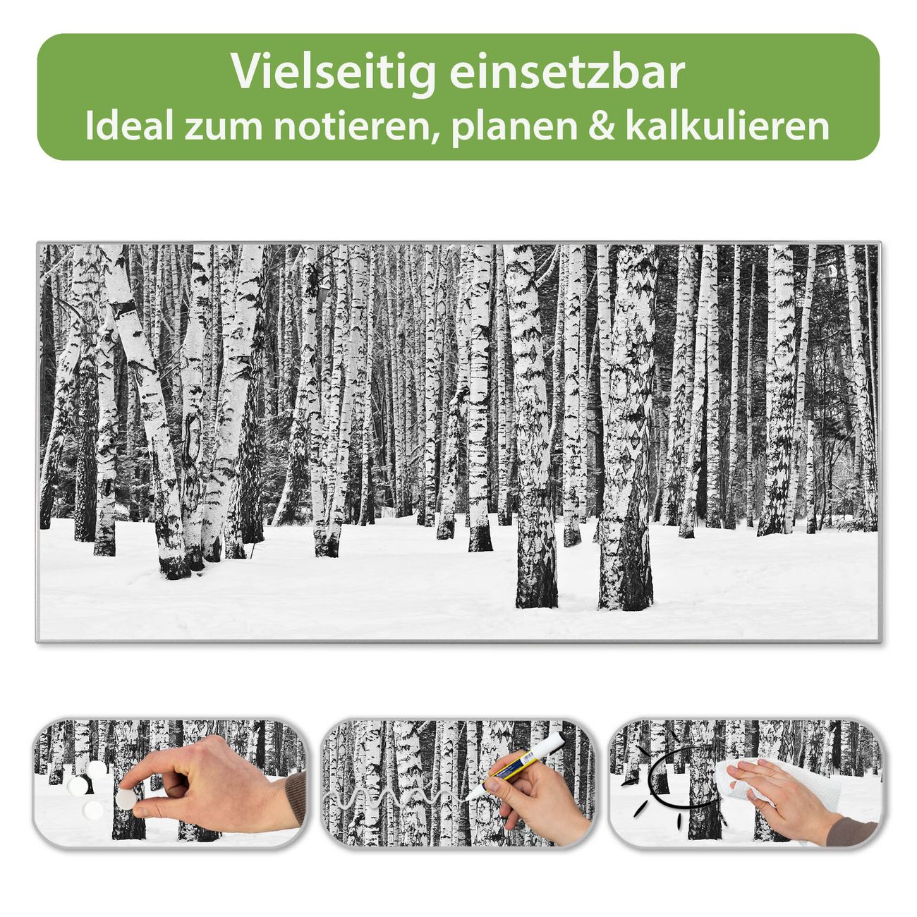 FUNKTION: Die banjado Magnettafel 78x37 cm im Design Motiv Winterlicher Birkenwald vereint Funktionalität und modernes Wohndesign auf stilvolle Weise. Diese hochwertige Magnetwand aus Metall hilft Ihnen dabei, Notizen, Fotos, Termine, Einkaufslisten oder Rezepte übersichtlich zu organisieren. Als praktisches Memoboard sorgt sie für Struktur im Alltag und setzt gleichzeitig einen dekorativen Akzent an Ihrer Wand. DESIGN: Die Metalltafel besteht aus robustem, lackiertem Stahl und ist mit allen handelsüblichen Magneten nutzbar. Besonders praktisch ist die beschreibbare Oberfläche. Sie können die Magnettafel ganz einfach mit Kreidestiften beschriften und die Inhalte bei Bedarf mit einem feuchten Tuch wieder entfernen. So eignet sich das Memoboard ideal für Wochenpläne, Menüpläne, To Do Listen oder kreative Botschaften. DETAILS: Mit ihrem großzügigen Querformat von 78x37 cm bietet die Magnettafel ausreichend Platz für Ihre Organisation. Das Motiv Motiv Winterlicher Birkenwald bringt eine warme, natürliche Optik in Küche, Flur, Büro oder Homeoffice und wirkt auch ohne Magnete oder Beschriftung wie ein modernes Wandbild. NUTZEN: Auf der Rückseite befinden sich vorgefertigte Löcher für eine schnelle und unkomplizierte Wandmontage. Jede banjado Magnettafel wird in Deutschland gefertigt und steht für Qualität, Langlebigkeit und liebevolle Verarbeitung. Dieses beschreibbare Memoboard ist die perfekte Kombination aus Metalltafel, Designobjekt und praktischer Magnetwand für Ihren Alltag. BANJADO: Wir sind ein kleines Team aus dem Herzen von Sachsen. Wir fertigen alle Artikel von Hand für Sie an, Sie erhalten keine preiswerte Importware. Auf Wunsch können Sie auch Ihr eigenes Foto auf die Magnettafel aufbringen, schreiben Sie uns an. Herzlichst, Ihr banjado-Team