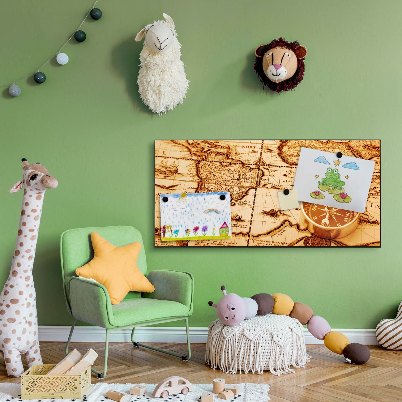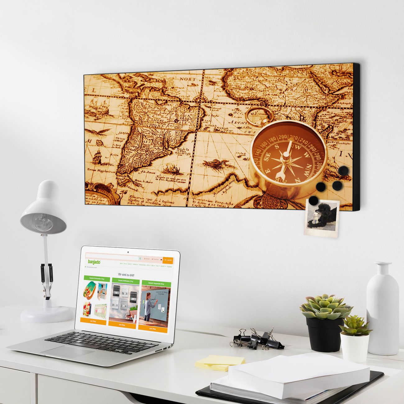 FUNKTION:  Die banjado Magnettafel mit Motiv World Map Motiv bringt Ordnung in Ihr Zettelchaos. Fotos, Termine, Notizen oder Rezepte lassen Sich hier stilvoll mit Magneten ordnen, Sie behalten alles im Blick. An der Design Magnetwand halten alle handesüblichen Magnete. DESIGN:  Die Metall Pinnwand mit dem Motiv Motiv World Map ist ein eleganter Begleiter im Alltag. Mit dieser Magnettafel haben Sie auch ohne Notizen und Magnete ein schönes Dekoelement. Das Format bietet Ihnen ausreichend Platz um alle wichtigen Informationen im Blick zu behalten. DETAILS: Die magnetische Pinnwand besteht aus silber-grau, weiß oder schwarz lackiertem Stahl. Sie hat eine Größe von 78cm x 37cm. Es befinden sich auf der Rückseite vorgefertigte Löcher die eine schnelle und unkomplizierte Anbringung ermöglichen. Das Motiv ist mit einem seidenmatten Laminat versehen und schützt so zusätzlich vor Kratzern. NUTZEN:  Sie können diese Magnettafel wunderbar als Wandbild nutzen, es halten alle handelsüblichen Magneten daran. Das Memoboard ist mit einem feuchten Lappen oder Schwamm abwischbar. Sie finden bei uns eine große Auswahl an passenden Magneten. BANJADO:  Wir sind ein kleines Team aus dem Herzen von Sachsen. Wir fertigen alle Artikel von Hand für Sie an, Sie erhalten keine preiswerte Importware. Auf Wunsch können Sie auch Ihr eigenes Foto auf die Magnettafel aufbringen, schreiben Sie uns an. Herzlichst, Ihr banjado-Team
