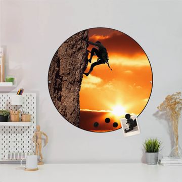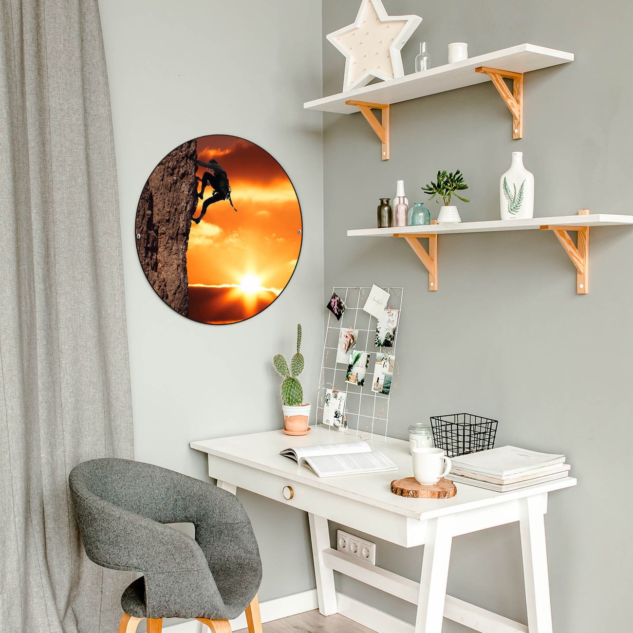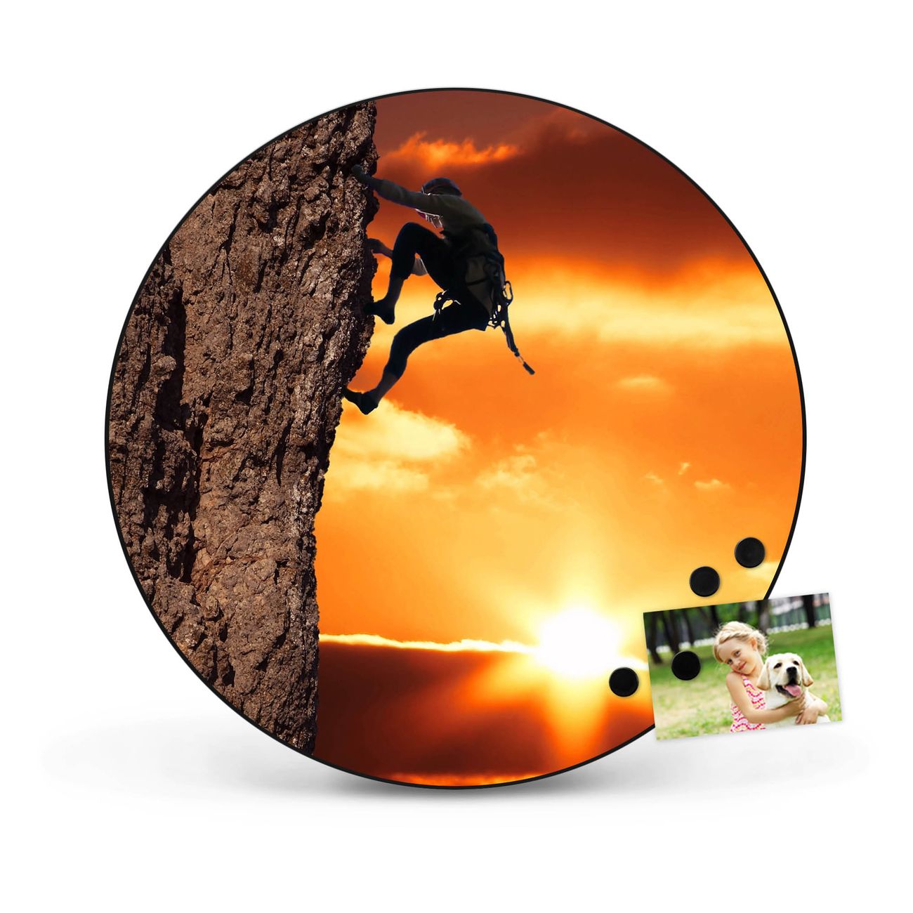 FUNKTION / DESIGN Die banjado Magnettafel mit dem Motiv Motiv Bergsteiger bringt Ordnung in Ihr Zettelchaos. Fotos, Termine, Notizen oder Rezepte lassen Sich hier stilvoll mit Magneten ordnen, Sie behalten alles im Blick. Die Design Magnetwand ist beschreibbar und wieder abwischbar. Mit dieser Pinnwand haben Sie auch ohne Notizen und Magneten ein schönes Dekoelement. Das Format bietet Ihnen ausreichend Platz um alle wichtigen Informationen im Blick zu behalten. DETAILS / NUTZEN Die magnetische Metall Pinnwand besteht aus schwarz lackiertem Stahl. Sie hat einen Durchmesser von 47cm. Es befinden sich an den Seiten zwei vorgefertigte Löcher die eine schnelle und unkomplizierte Anbringung ermöglichen. Das Motiv ist mit einem seidenmatten Laminat versehen und schützt so zusätzlich vor Kratzern. Es halten alle handelsüblichen Magneten daran. Wir sind ein kleines Team aus dem Herzen von Sachsen. Wir fertigen alle Artikel von Hand für Sie an, Sie erhalten keine preiswerte Importware. Auf Wunsch können Sie auch Ihr eigenes Foto auf die Magnettafel aufbringen, schreiben Sie uns an.