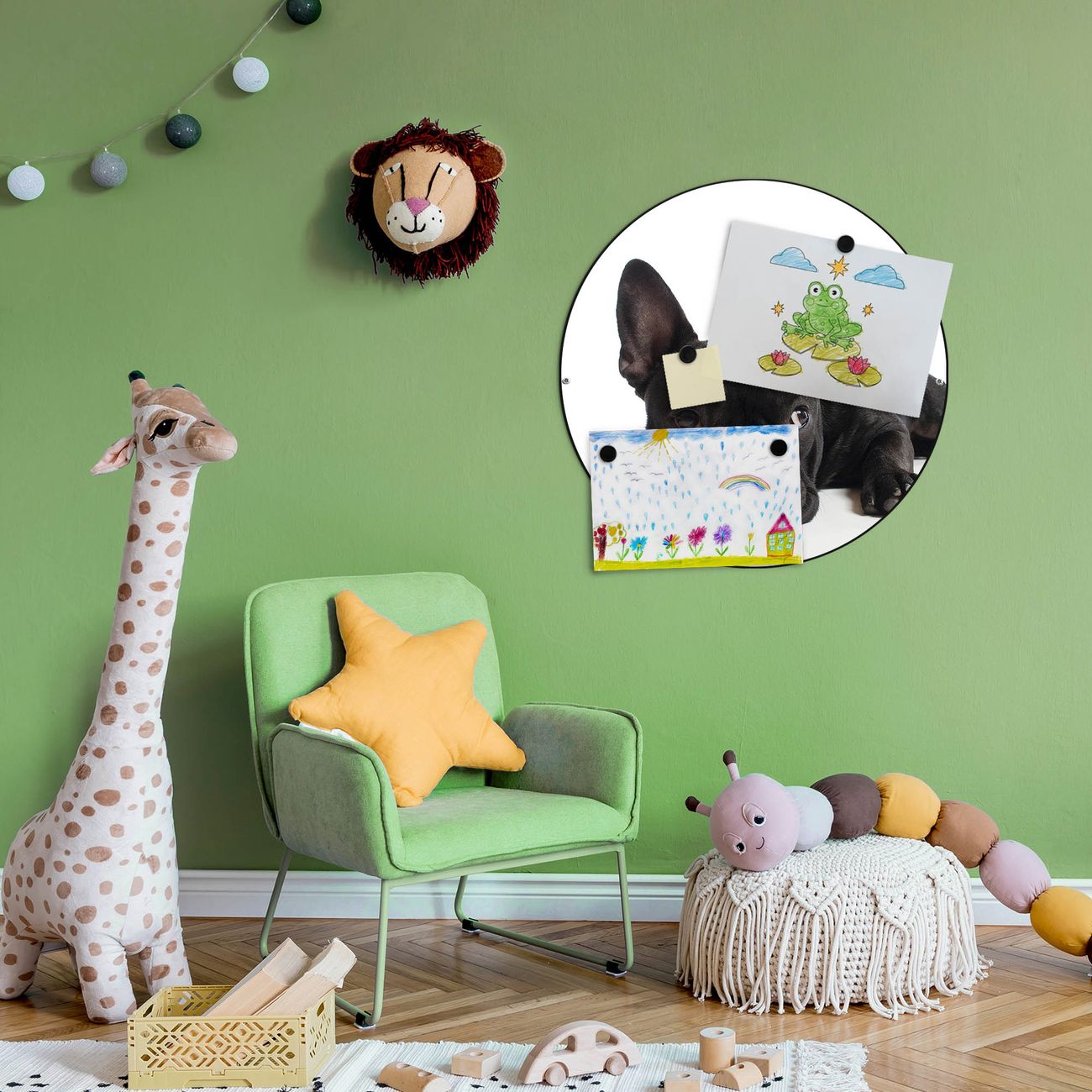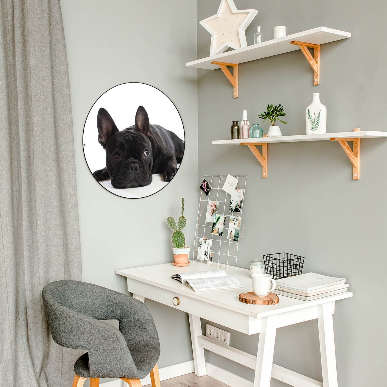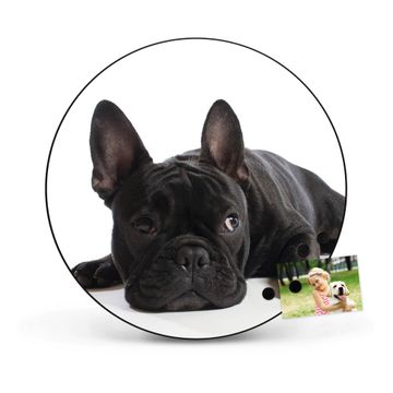 FUNKTION / DESIGN Die banjado Magnettafel mit dem Motiv Motiv Bulldogge bringt Ordnung in Ihr Zettelchaos. Fotos, Termine, Notizen oder Rezepte lassen Sich hier stilvoll mit Magneten ordnen, Sie behalten alles im Blick. Die Design Magnetwand ist beschreibbar und wieder abwischbar. Mit dieser Pinnwand haben Sie auch ohne Notizen und Magneten ein schönes Dekoelement. Das Format bietet Ihnen ausreichend Platz um alle wichtigen Informationen im Blick zu behalten. DETAILS / NUTZEN Die magnetische Metall Pinnwand besteht aus schwarz lackiertem Stahl. Sie hat einen Durchmesser von 47cm. Es befinden sich an den Seiten zwei vorgefertigte Löcher die eine schnelle und unkomplizierte Anbringung ermöglichen. Das Motiv ist mit einem seidenmatten Laminat versehen und schützt so zusätzlich vor Kratzern. Es halten alle handelsüblichen Magneten daran. Wir sind ein kleines Team aus dem Herzen von Sachsen. Wir fertigen alle Artikel von Hand für Sie an, Sie erhalten keine preiswerte Importware. Auf Wunsch können Sie auch Ihr eigenes Foto auf die Magnettafel aufbringen, schreiben Sie uns an.