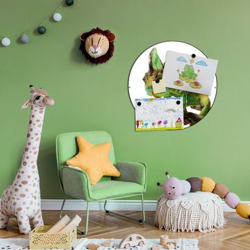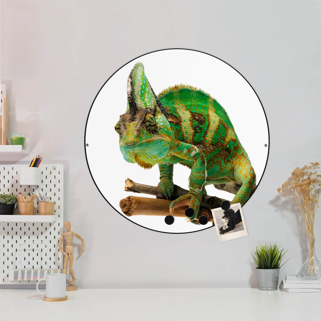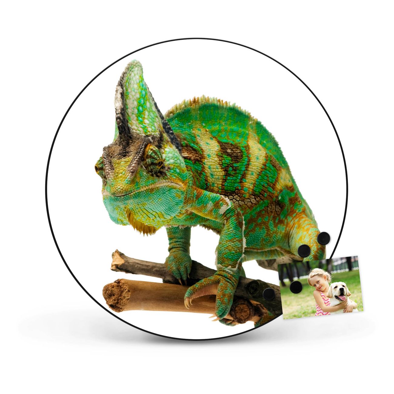 FUNKTION / DESIGN Die banjado Magnettafel mit dem Motiv Motiv Chamäleon bringt Ordnung in Ihr Zettelchaos. Fotos, Termine, Notizen oder Rezepte lassen Sich hier stilvoll mit Magneten ordnen, Sie behalten alles im Blick. Die Design Magnetwand ist beschreibbar und wieder abwischbar. Mit dieser Pinnwand haben Sie auch ohne Notizen und Magneten ein schönes Dekoelement. Das Format bietet Ihnen ausreichend Platz um alle wichtigen Informationen im Blick zu behalten. DETAILS / NUTZEN Die magnetische Metall Pinnwand besteht aus schwarz lackiertem Stahl. Sie hat einen Durchmesser von 47cm. Es befinden sich an den Seiten zwei vorgefertigte Löcher die eine schnelle und unkomplizierte Anbringung ermöglichen. Das Motiv ist mit einem seidenmatten Laminat versehen und schützt so zusätzlich vor Kratzern. Es halten alle handelsüblichen Magneten daran. Wir sind ein kleines Team aus dem Herzen von Sachsen. Wir fertigen alle Artikel von Hand für Sie an, Sie erhalten keine preiswerte Importware. Auf Wunsch können Sie auch Ihr eigenes Foto auf die Magnettafel aufbringen, schreiben Sie uns an.