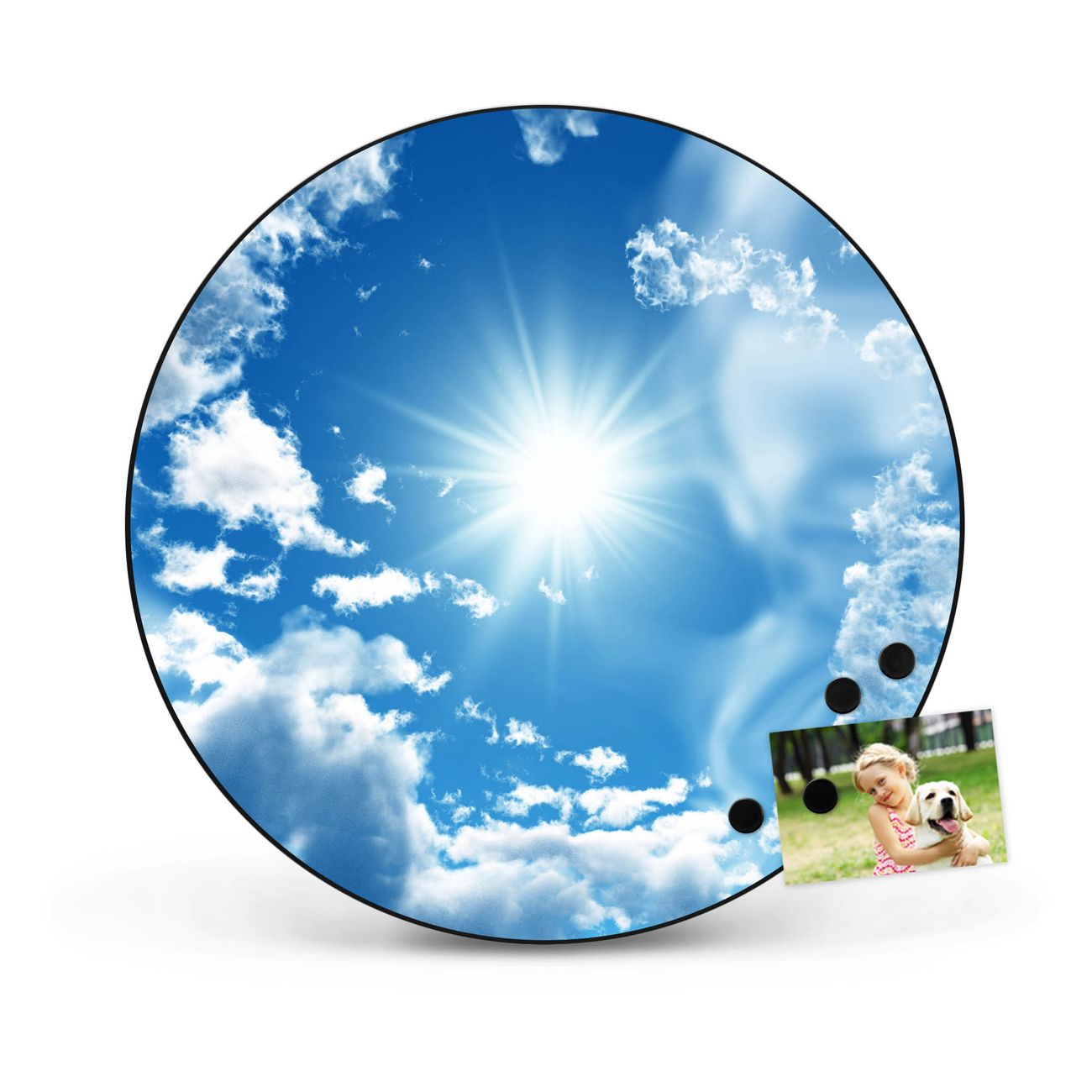 FUNKTION / DESIGN Die banjado Magnettafel mit dem Motiv Motiv Clouds bringt Ordnung in Ihr Zettelchaos. Fotos, Termine, Notizen oder Rezepte lassen Sich hier stilvoll mit Magneten ordnen, Sie behalten alles im Blick. Die Design Magnetwand ist beschreibbar und wieder abwischbar. Mit dieser Pinnwand haben Sie auch ohne Notizen und Magneten ein schönes Dekoelement. Das Format bietet Ihnen ausreichend Platz um alle wichtigen Informationen im Blick zu behalten. DETAILS / NUTZEN Die magnetische Metall Pinnwand besteht aus schwarz lackiertem Stahl. Sie hat einen Durchmesser von 47cm. Es befinden sich an den Seiten zwei vorgefertigte Löcher die eine schnelle und unkomplizierte Anbringung ermöglichen. Das Motiv ist mit einem seidenmatten Laminat versehen und schützt so zusätzlich vor Kratzern. Es halten alle handelsüblichen Magneten daran. Wir sind ein kleines Team aus dem Herzen von Sachsen. Wir fertigen alle Artikel von Hand für Sie an, Sie erhalten keine preiswerte Importware. Auf Wunsch können Sie auch Ihr eigenes Foto auf die Magnettafel aufbringen, schreiben Sie uns an.