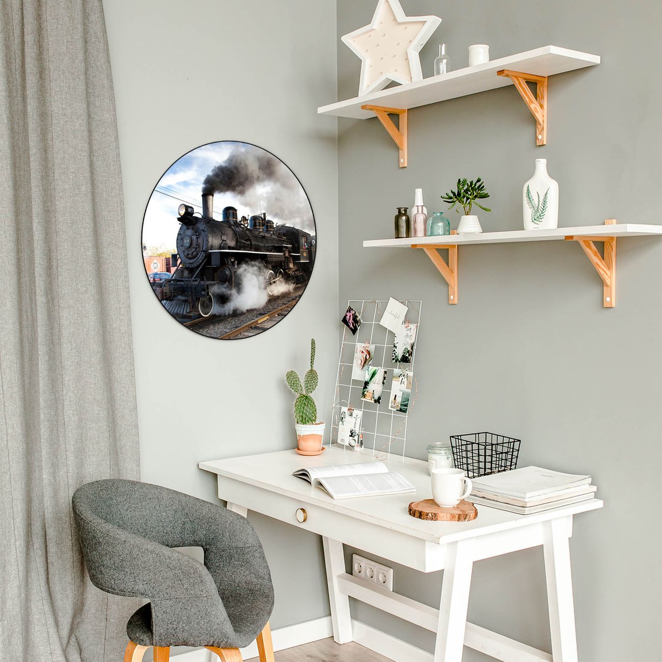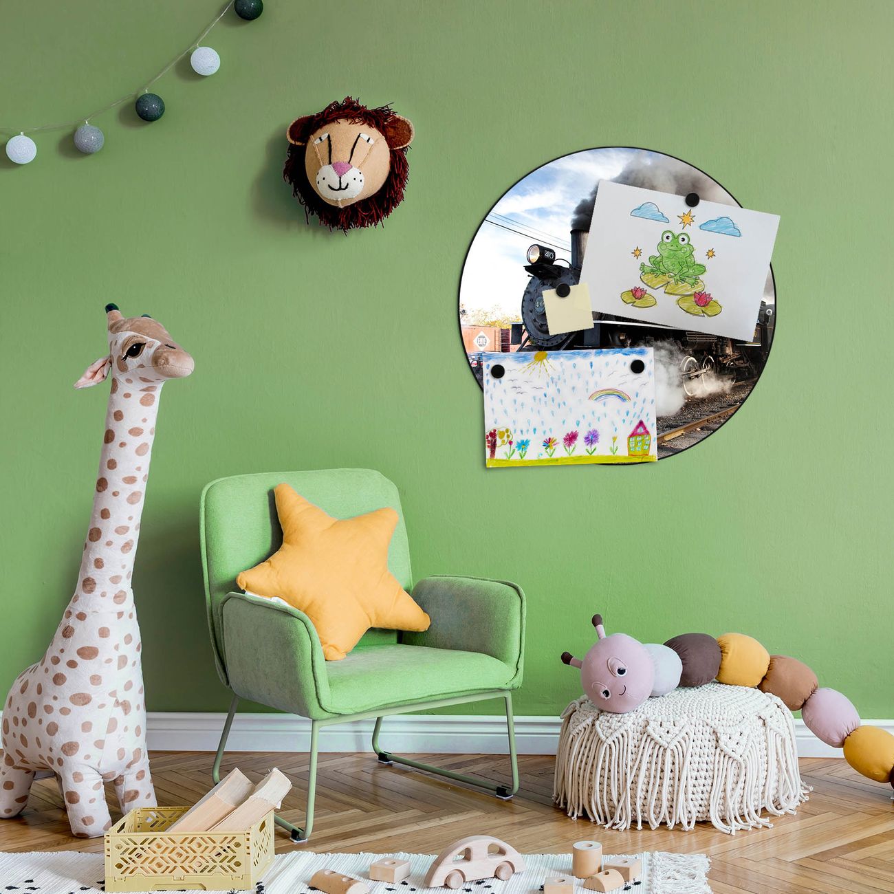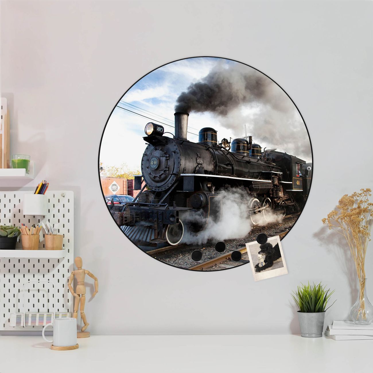 FUNKTION / DESIGN Die banjado Magnettafel mit dem Motiv Motiv Dampflok bringt Ordnung in Ihr Zettelchaos. Fotos, Termine, Notizen oder Rezepte lassen Sich hier stilvoll mit Magneten ordnen, Sie behalten alles im Blick. Die Design Magnetwand ist beschreibbar und wieder abwischbar. Mit dieser Pinnwand haben Sie auch ohne Notizen und Magneten ein schönes Dekoelement. Das Format bietet Ihnen ausreichend Platz um alle wichtigen Informationen im Blick zu behalten. DETAILS / NUTZEN Die magnetische Metall Pinnwand besteht aus schwarz lackiertem Stahl. Sie hat einen Durchmesser von 47cm. Es befinden sich an den Seiten zwei vorgefertigte Löcher die eine schnelle und unkomplizierte Anbringung ermöglichen. Das Motiv ist mit einem seidenmatten Laminat versehen und schützt so zusätzlich vor Kratzern. Es halten alle handelsüblichen Magneten daran. Wir sind ein kleines Team aus dem Herzen von Sachsen. Wir fertigen alle Artikel von Hand für Sie an, Sie erhalten keine preiswerte Importware. Auf Wunsch können Sie auch Ihr eigenes Foto auf die Magnettafel aufbringen, schreiben Sie uns an.