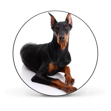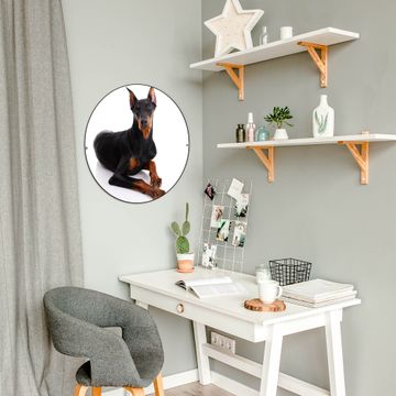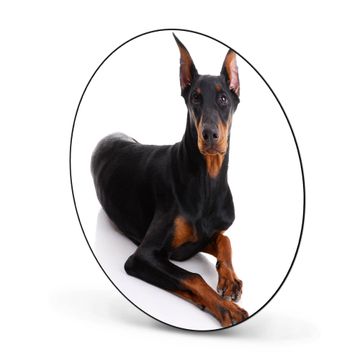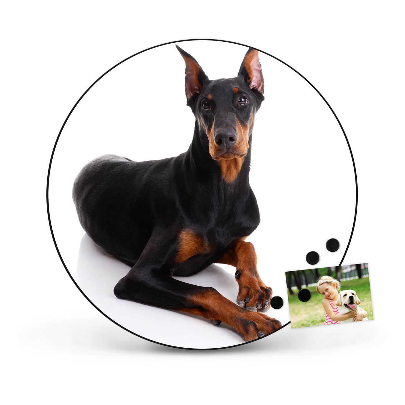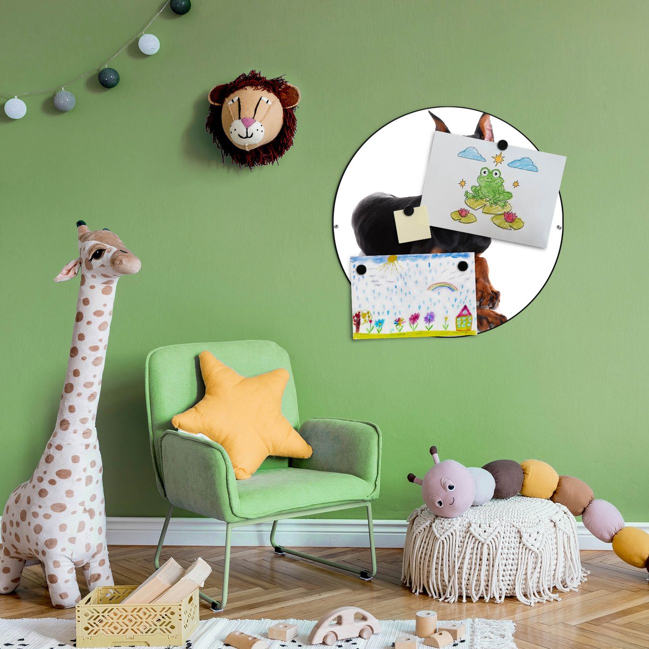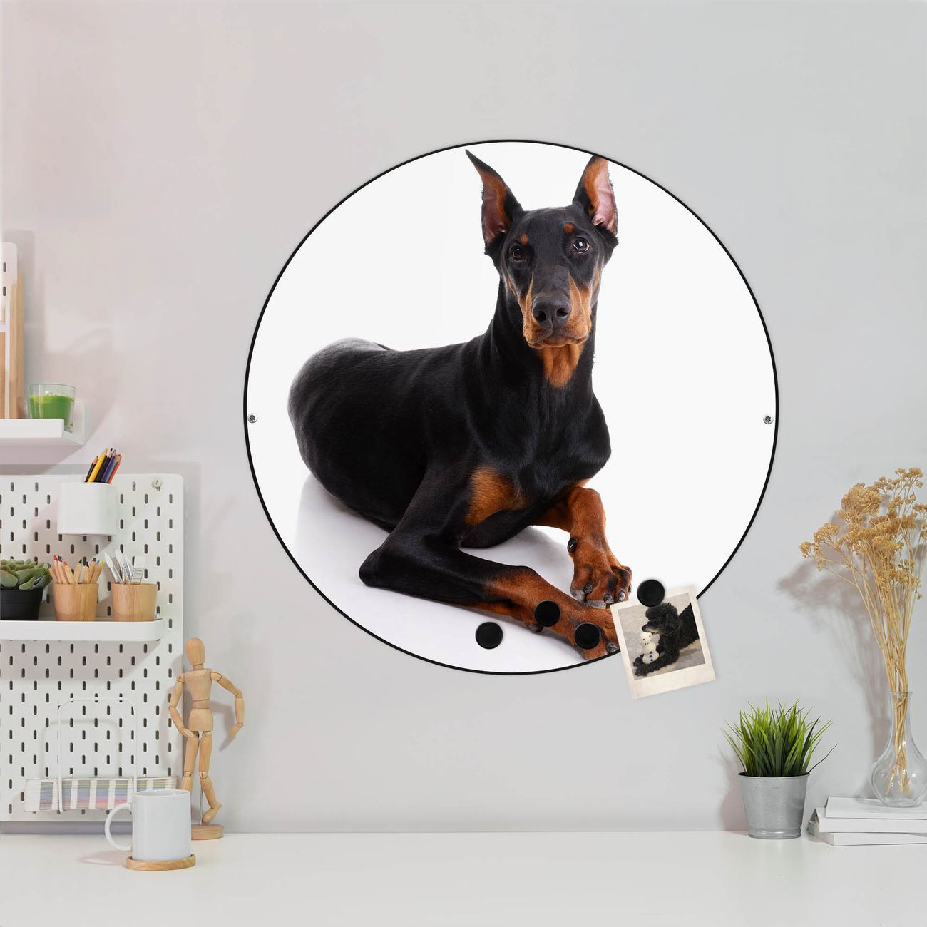 FUNKTION / DESIGN Die banjado Magnettafel mit dem Motiv Motiv Dobermann bringt Ordnung in Ihr Zettelchaos. Fotos, Termine, Notizen oder Rezepte lassen Sich hier stilvoll mit Magneten ordnen, Sie behalten alles im Blick. Die Design Magnetwand ist beschreibbar und wieder abwischbar. Mit dieser Pinnwand haben Sie auch ohne Notizen und Magneten ein schönes Dekoelement. Das Format bietet Ihnen ausreichend Platz um alle wichtigen Informationen im Blick zu behalten. DETAILS / NUTZEN Die magnetische Metall Pinnwand besteht aus schwarz lackiertem Stahl. Sie hat einen Durchmesser von 47cm. Es befinden sich an den Seiten zwei vorgefertigte Löcher die eine schnelle und unkomplizierte Anbringung ermöglichen. Das Motiv ist mit einem seidenmatten Laminat versehen und schützt so zusätzlich vor Kratzern. Es halten alle handelsüblichen Magneten daran. Wir sind ein kleines Team aus dem Herzen von Sachsen. Wir fertigen alle Artikel von Hand für Sie an, Sie erhalten keine preiswerte Importware. Auf Wunsch können Sie auch Ihr eigenes Foto auf die Magnettafel aufbringen, schreiben Sie uns an.