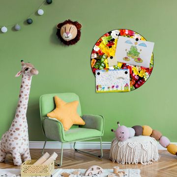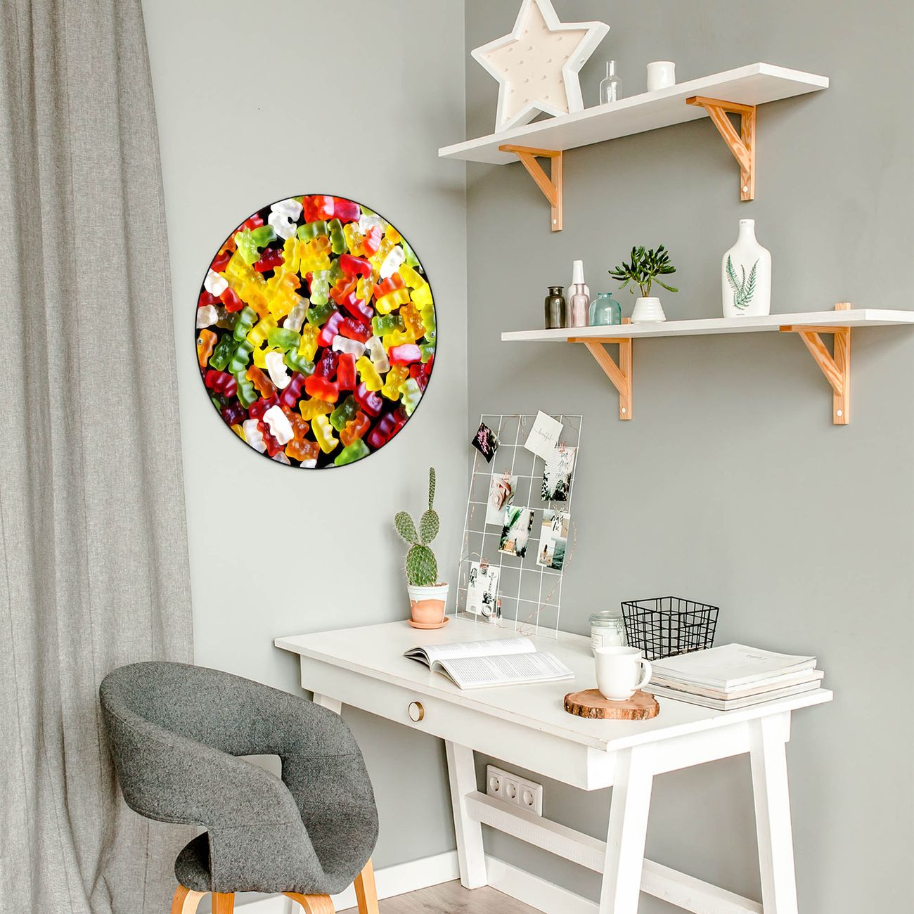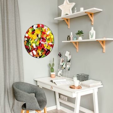 FUNKTION / DESIGN Die banjado Magnettafel mit dem Motiv Motiv Gummibaerchen bringt Ordnung in Ihr Zettelchaos. Fotos, Termine, Notizen oder Rezepte lassen Sich hier stilvoll mit Magneten ordnen, Sie behalten alles im Blick. Die Design Magnetwand ist beschreibbar und wieder abwischbar. Mit dieser Pinnwand haben Sie auch ohne Notizen und Magneten ein schönes Dekoelement. Das Format bietet Ihnen ausreichend Platz um alle wichtigen Informationen im Blick zu behalten. DETAILS / NUTZEN Die magnetische Metall Pinnwand besteht aus schwarz lackiertem Stahl. Sie hat einen Durchmesser von 47cm. Es befinden sich an den Seiten zwei vorgefertigte Löcher die eine schnelle und unkomplizierte Anbringung ermöglichen. Das Motiv ist mit einem seidenmatten Laminat versehen und schützt so zusätzlich vor Kratzern. Es halten alle handelsüblichen Magneten daran. Wir sind ein kleines Team aus dem Herzen von Sachsen. Wir fertigen alle Artikel von Hand für Sie an, Sie erhalten keine preiswerte Importware. Auf Wunsch können Sie auch Ihr eigenes Foto auf die Magnettafel aufbringen, schreiben Sie uns an.
