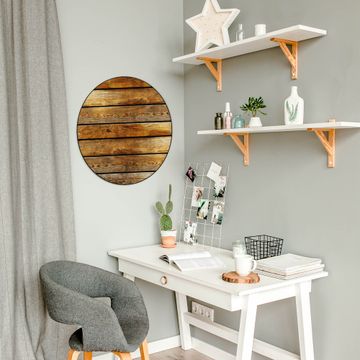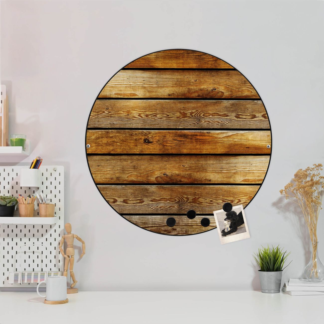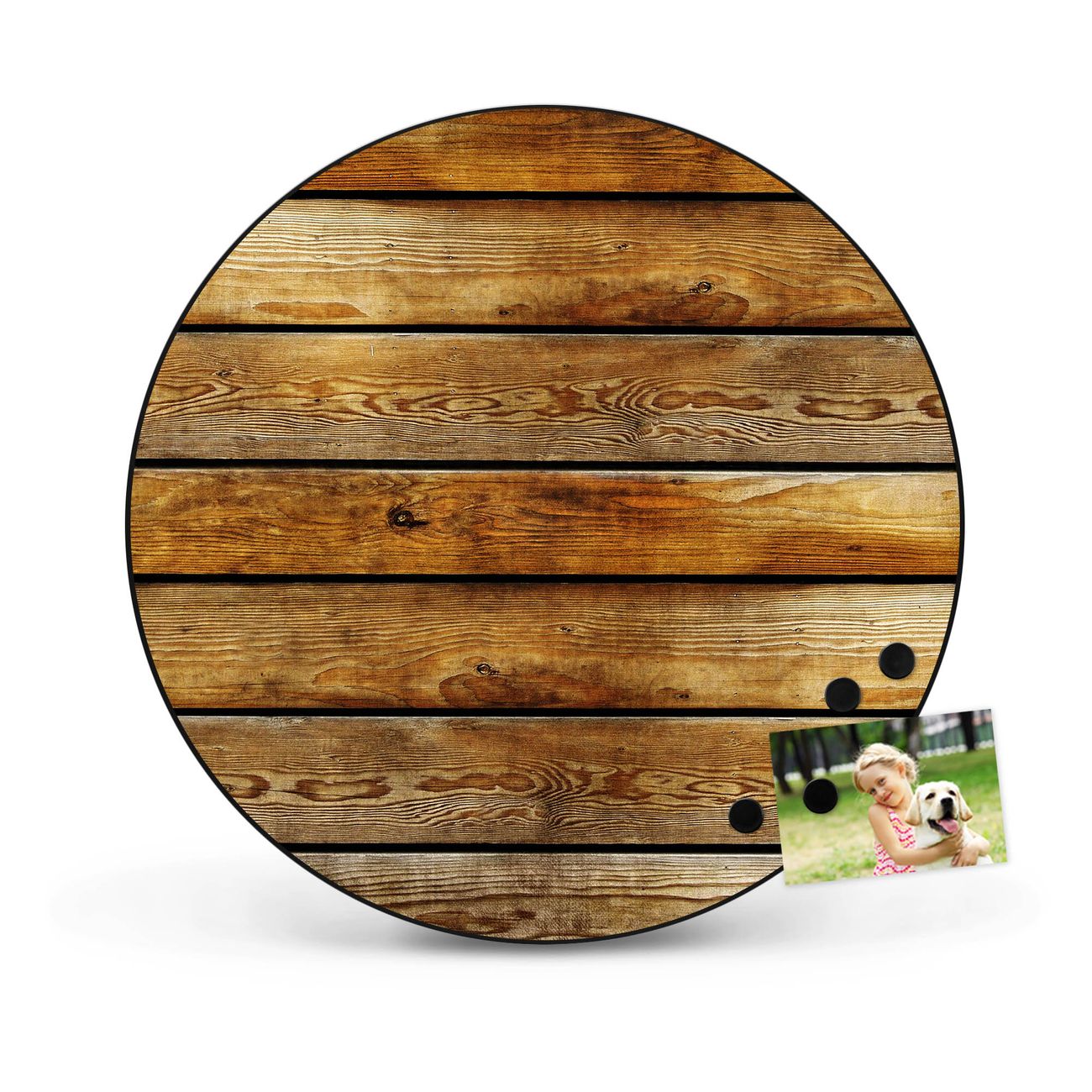FUNKTION / DESIGN Die banjado Magnettafel mit dem Motiv Motiv Holzbretter bringt Ordnung in Ihr Zettelchaos. Fotos, Termine, Notizen oder Rezepte lassen Sich hier stilvoll mit Magneten ordnen, Sie behalten alles im Blick. Die Design Magnetwand ist beschreibbar und wieder abwischbar. Mit dieser Pinnwand haben Sie auch ohne Notizen und Magneten ein schönes Dekoelement. Das Format bietet Ihnen ausreichend Platz um alle wichtigen Informationen im Blick zu behalten. DETAILS / NUTZEN Die magnetische Metall Pinnwand besteht aus schwarz lackiertem Stahl. Sie hat einen Durchmesser von 47cm. Es befinden sich an den Seiten zwei vorgefertigte Löcher die eine schnelle und unkomplizierte Anbringung ermöglichen. Das Motiv ist mit einem seidenmatten Laminat versehen und schützt so zusätzlich vor Kratzern. Es halten alle handelsüblichen Magneten daran. Wir sind ein kleines Team aus dem Herzen von Sachsen. Wir fertigen alle Artikel von Hand für Sie an, Sie erhalten keine preiswerte Importware. Auf Wunsch können Sie auch Ihr eigenes Foto auf die Magnettafel aufbringen, schreiben Sie uns an.