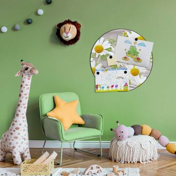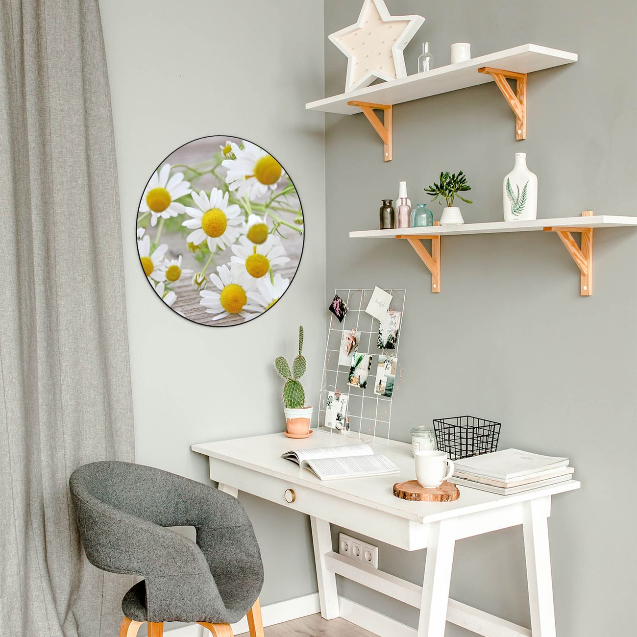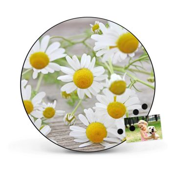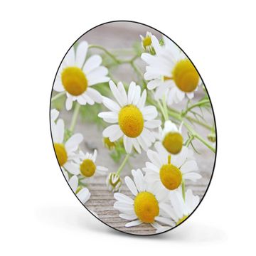 FUNKTION / DESIGN Die banjado Magnettafel mit dem Motiv Motiv Kamillenblüten bringt Ordnung in Ihr Zettelchaos. Fotos, Termine, Notizen oder Rezepte lassen Sich hier stilvoll mit Magneten ordnen, Sie behalten alles im Blick. Die Design Magnetwand ist beschreibbar und wieder abwischbar. Mit dieser Pinnwand haben Sie auch ohne Notizen und Magneten ein schönes Dekoelement. Das Format bietet Ihnen ausreichend Platz um alle wichtigen Informationen im Blick zu behalten. DETAILS / NUTZEN Die magnetische Metall Pinnwand besteht aus schwarz lackiertem Stahl. Sie hat einen Durchmesser von 47cm. Es befinden sich an den Seiten zwei vorgefertigte Löcher die eine schnelle und unkomplizierte Anbringung ermöglichen. Das Motiv ist mit einem seidenmatten Laminat versehen und schützt so zusätzlich vor Kratzern. Es halten alle handelsüblichen Magneten daran. Wir sind ein kleines Team aus dem Herzen von Sachsen. Wir fertigen alle Artikel von Hand für Sie an, Sie erhalten keine preiswerte Importware. Auf Wunsch können Sie auch Ihr eigenes Foto auf die Magnettafel aufbringen, schreiben Sie uns an.