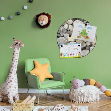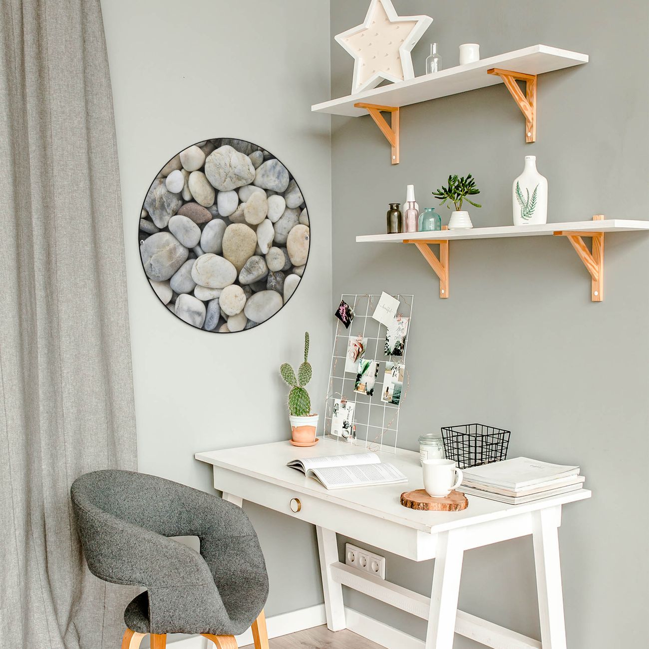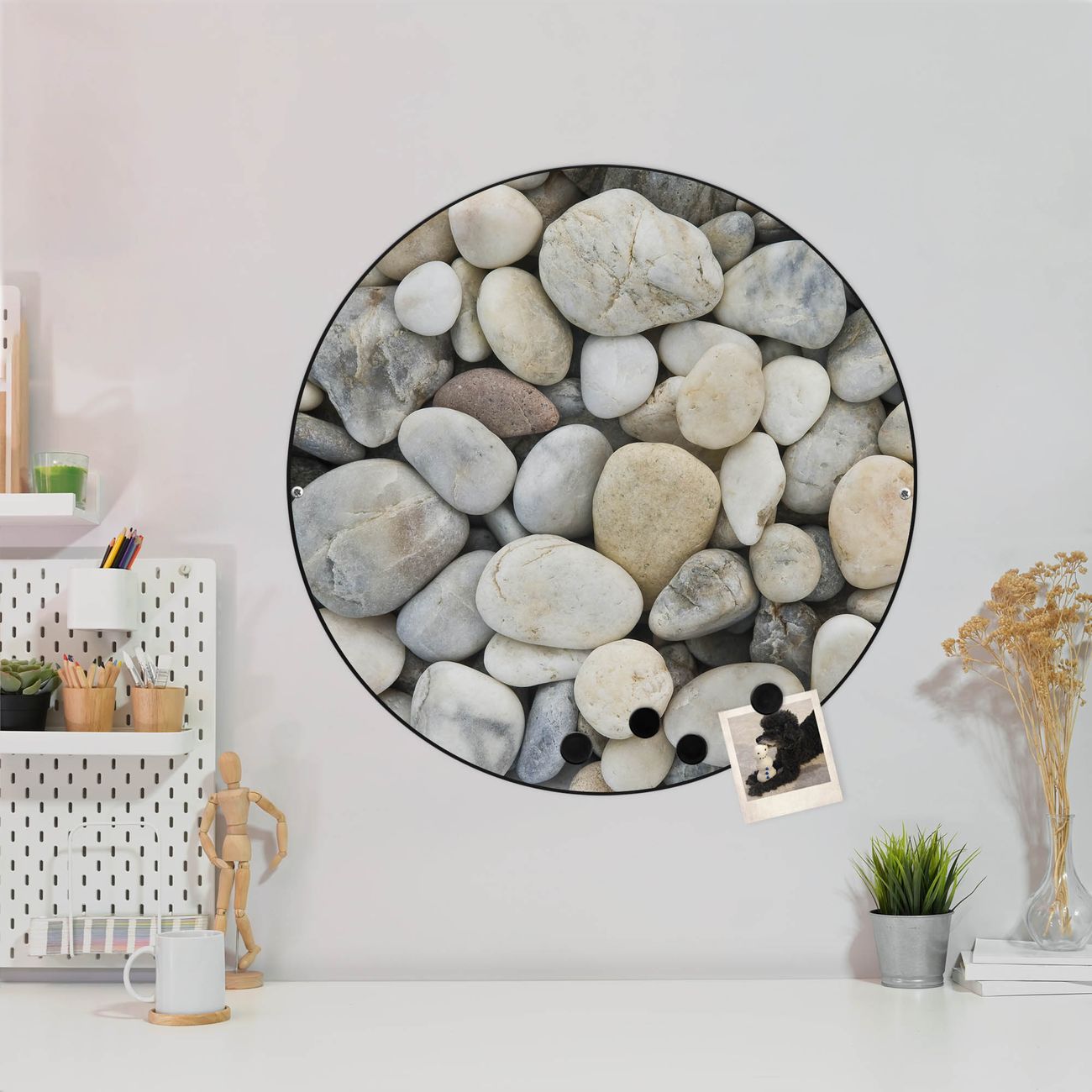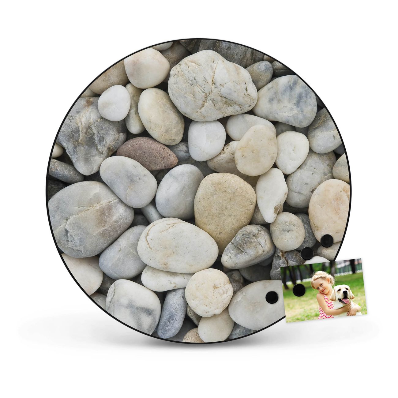 FUNKTION / DESIGN Die banjado Magnettafel mit dem Motiv Motiv Kieselsteine bringt Ordnung in Ihr Zettelchaos. Fotos, Termine, Notizen oder Rezepte lassen Sich hier stilvoll mit Magneten ordnen, Sie behalten alles im Blick. Die Design Magnetwand ist beschreibbar und wieder abwischbar. Mit dieser Pinnwand haben Sie auch ohne Notizen und Magneten ein schönes Dekoelement. Das Format bietet Ihnen ausreichend Platz um alle wichtigen Informationen im Blick zu behalten. DETAILS / NUTZEN Die magnetische Metall Pinnwand besteht aus schwarz lackiertem Stahl. Sie hat einen Durchmesser von 47cm. Es befinden sich an den Seiten zwei vorgefertigte Löcher die eine schnelle und unkomplizierte Anbringung ermöglichen. Das Motiv ist mit einem seidenmatten Laminat versehen und schützt so zusätzlich vor Kratzern. Es halten alle handelsüblichen Magneten daran. Wir sind ein kleines Team aus dem Herzen von Sachsen. Wir fertigen alle Artikel von Hand für Sie an, Sie erhalten keine preiswerte Importware. Auf Wunsch können Sie auch Ihr eigenes Foto auf die Magnettafel aufbringen, schreiben Sie uns an.