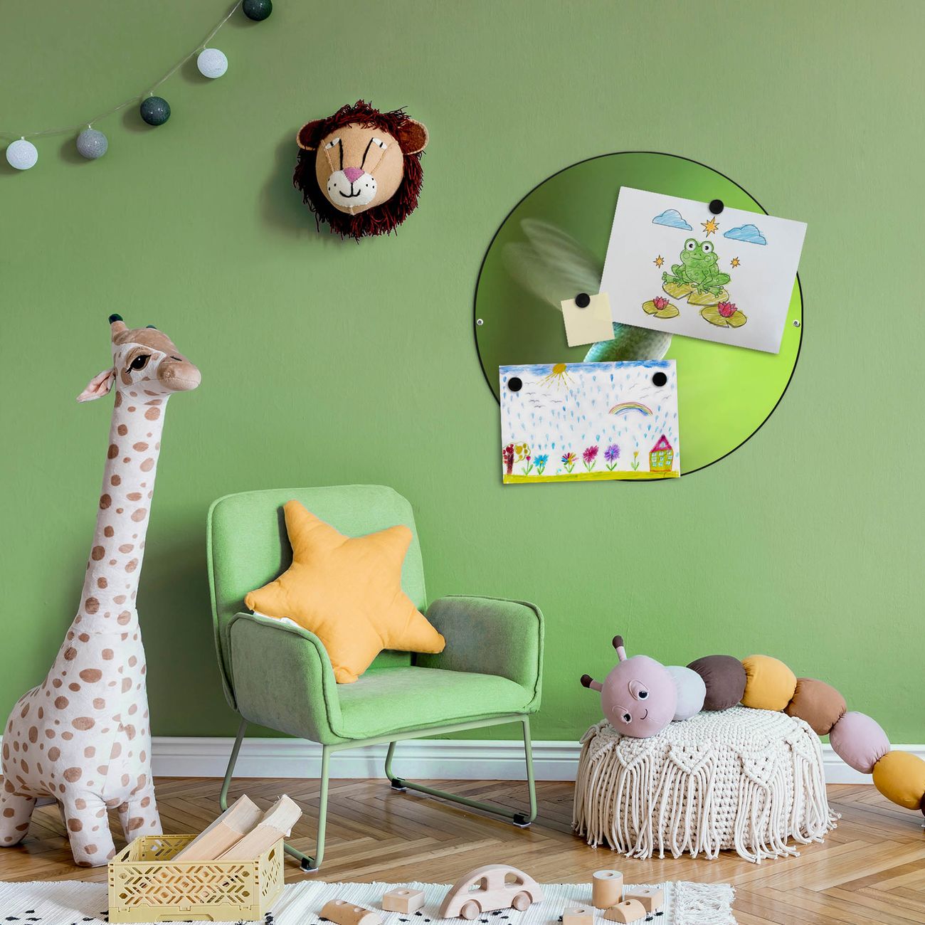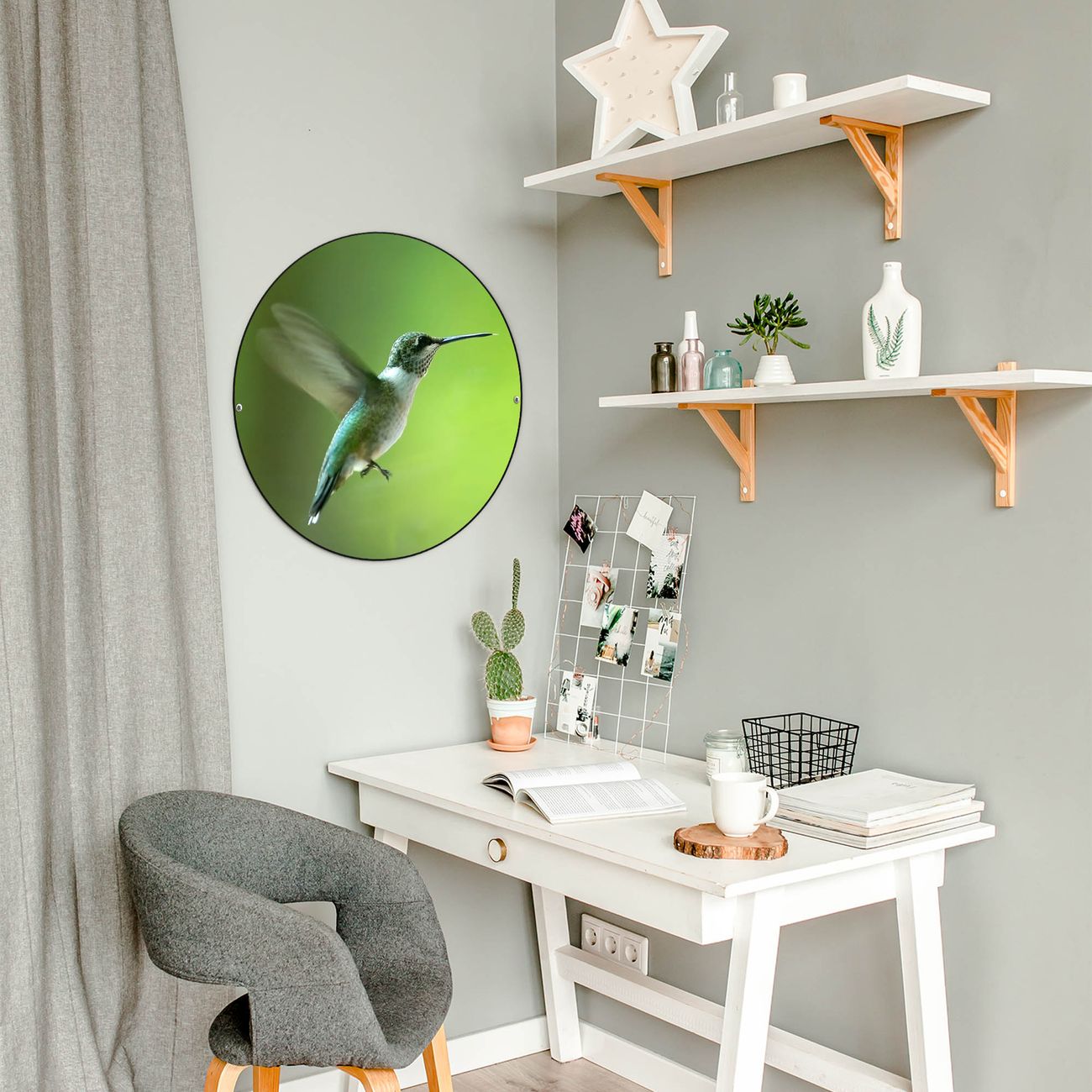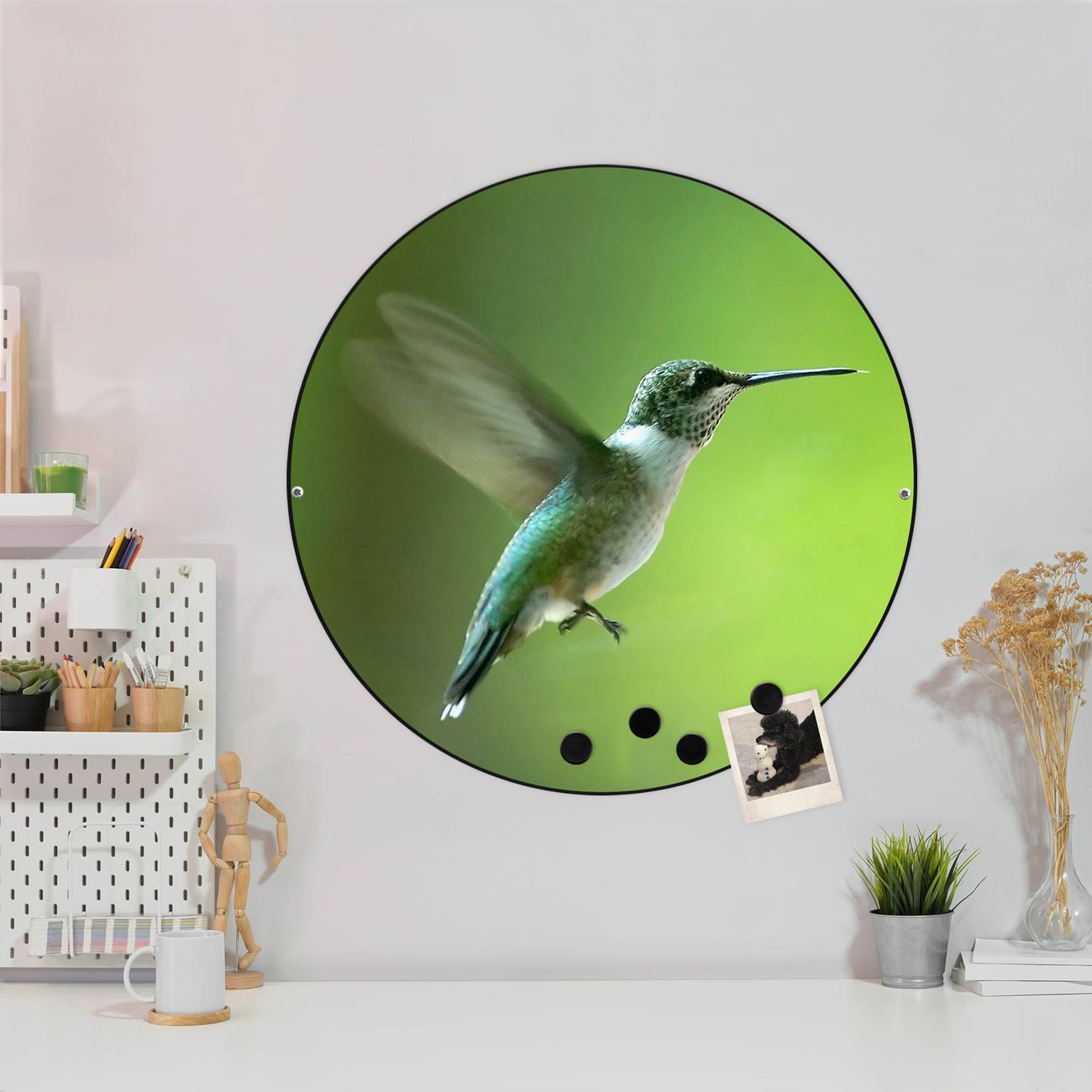 FUNKTION / DESIGN Die banjado Magnettafel mit dem Motiv Motiv Kolibri bringt Ordnung in Ihr Zettelchaos. Fotos, Termine, Notizen oder Rezepte lassen Sich hier stilvoll mit Magneten ordnen, Sie behalten alles im Blick. Die Design Magnetwand ist beschreibbar und wieder abwischbar. Mit dieser Pinnwand haben Sie auch ohne Notizen und Magneten ein schönes Dekoelement. Das Format bietet Ihnen ausreichend Platz um alle wichtigen Informationen im Blick zu behalten. DETAILS / NUTZEN Die magnetische Metall Pinnwand besteht aus schwarz lackiertem Stahl. Sie hat einen Durchmesser von 47cm. Es befinden sich an den Seiten zwei vorgefertigte Löcher die eine schnelle und unkomplizierte Anbringung ermöglichen. Das Motiv ist mit einem seidenmatten Laminat versehen und schützt so zusätzlich vor Kratzern. Es halten alle handelsüblichen Magneten daran. Wir sind ein kleines Team aus dem Herzen von Sachsen. Wir fertigen alle Artikel von Hand für Sie an, Sie erhalten keine preiswerte Importware. Auf Wunsch können Sie auch Ihr eigenes Foto auf die Magnettafel aufbringen, schreiben Sie uns an.