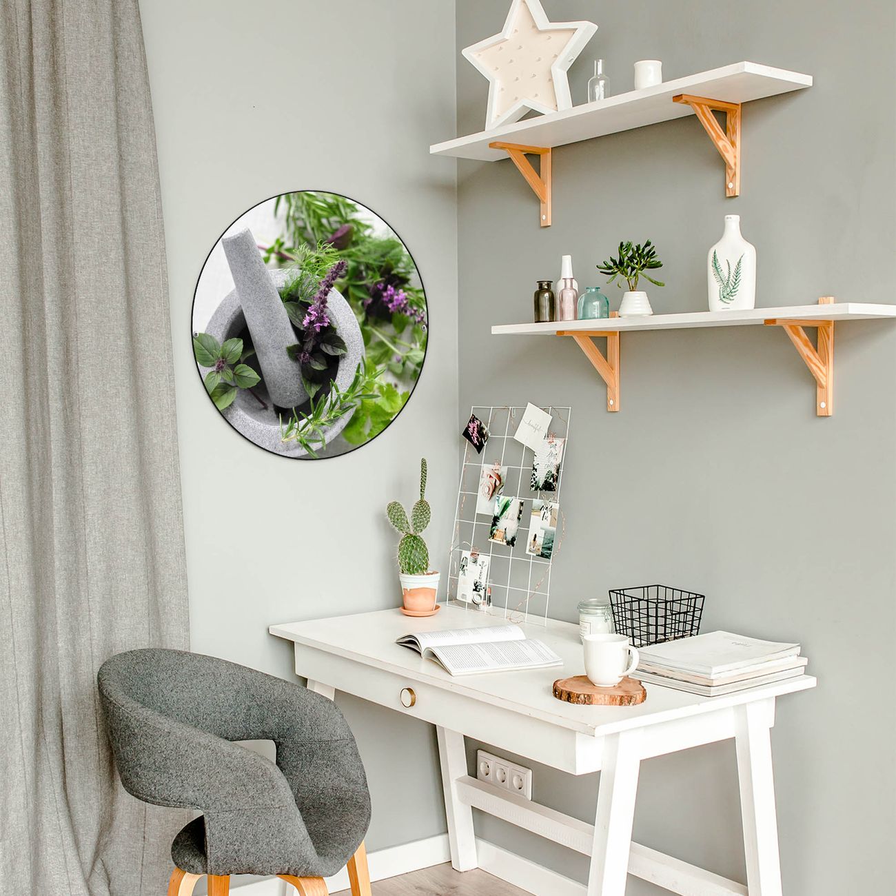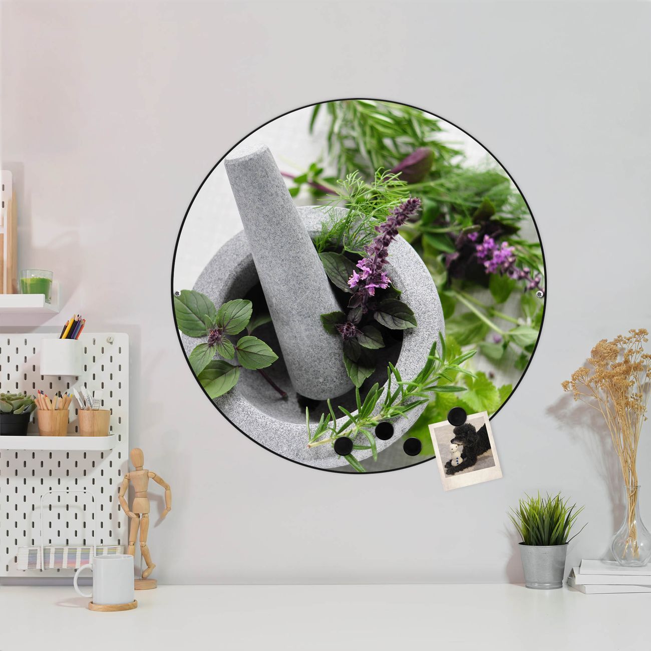 FUNKTION / DESIGN Die banjado Magnettafel mit dem Motiv Motiv Kräuter bringt Ordnung in Ihr Zettelchaos. Fotos, Termine, Notizen oder Rezepte lassen Sich hier stilvoll mit Magneten ordnen, Sie behalten alles im Blick. Die Design Magnetwand ist beschreibbar und wieder abwischbar. Mit dieser Pinnwand haben Sie auch ohne Notizen und Magneten ein schönes Dekoelement. Das Format bietet Ihnen ausreichend Platz um alle wichtigen Informationen im Blick zu behalten. DETAILS / NUTZEN Die magnetische Metall Pinnwand besteht aus schwarz lackiertem Stahl. Sie hat einen Durchmesser von 47cm. Es befinden sich an den Seiten zwei vorgefertigte Löcher die eine schnelle und unkomplizierte Anbringung ermöglichen. Das Motiv ist mit einem seidenmatten Laminat versehen und schützt so zusätzlich vor Kratzern. Es halten alle handelsüblichen Magneten daran. Wir sind ein kleines Team aus dem Herzen von Sachsen. Wir fertigen alle Artikel von Hand für Sie an, Sie erhalten keine preiswerte Importware. Auf Wunsch können Sie auch Ihr eigenes Foto auf die Magnettafel aufbringen, schreiben Sie uns an.