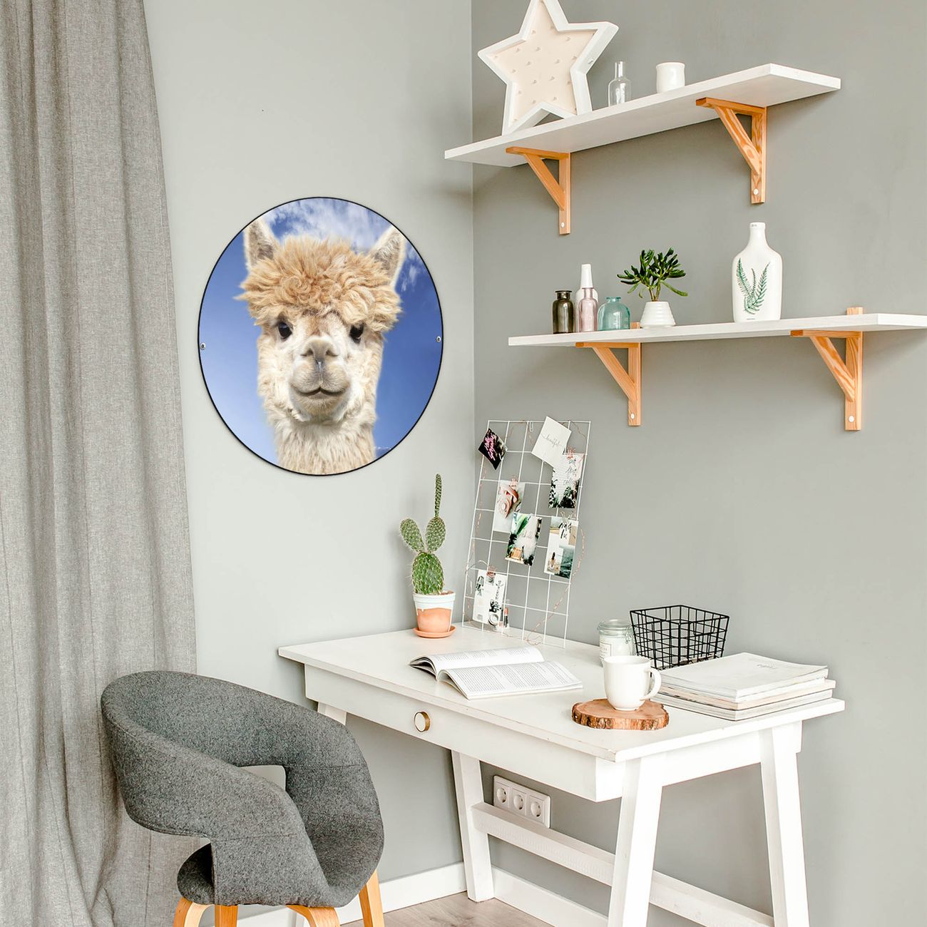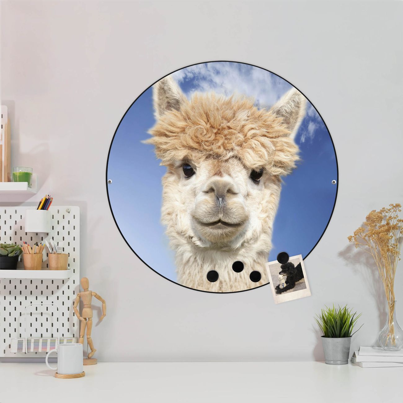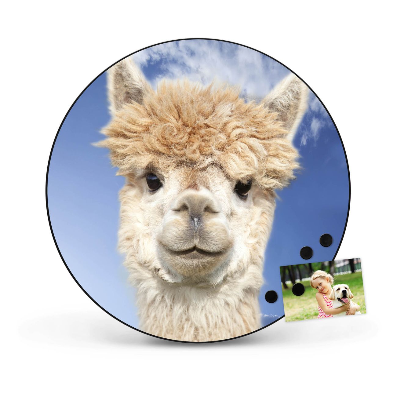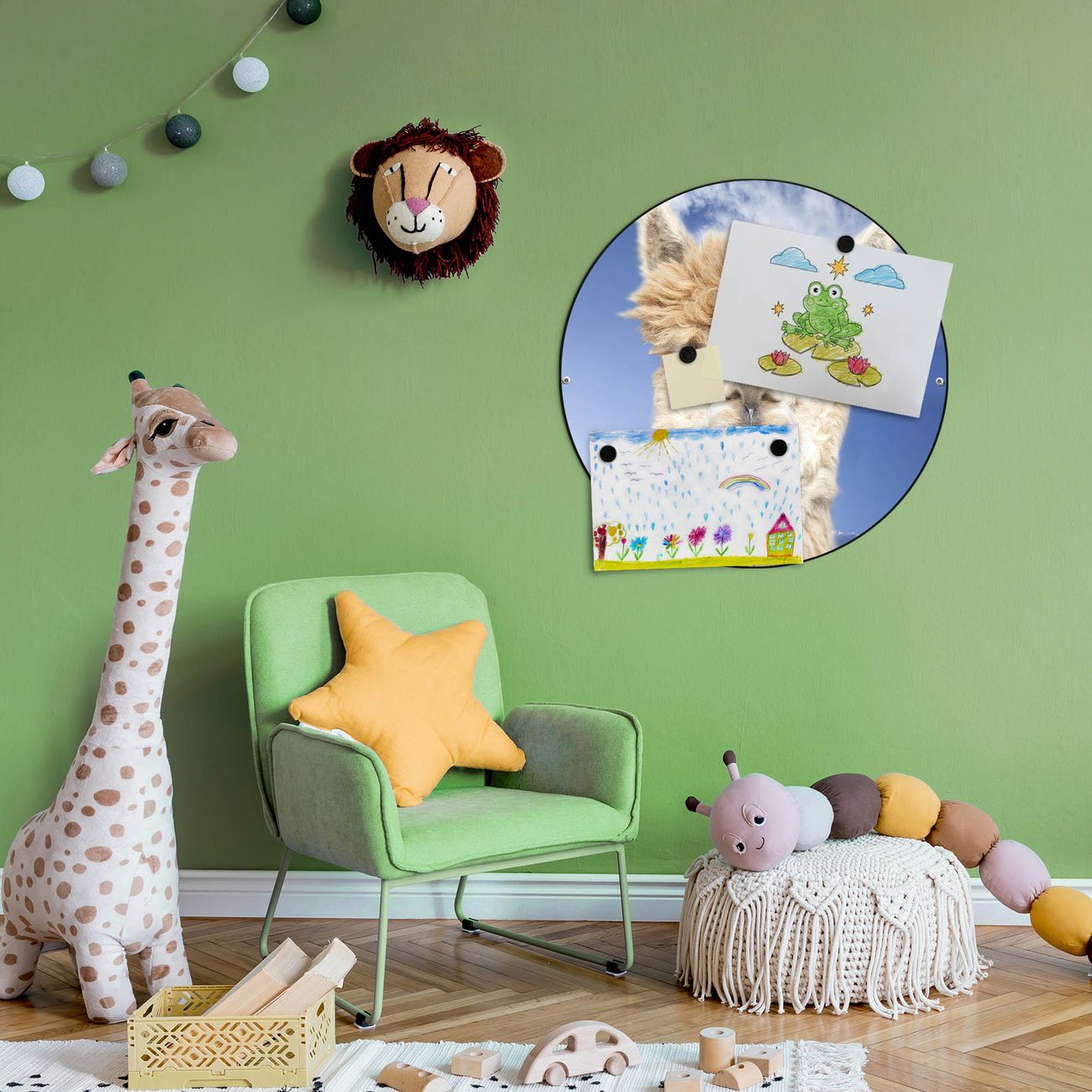 FUNKTION / DESIGN Die banjado Magnettafel mit dem Motiv Motiv Lama bringt Ordnung in Ihr Zettelchaos. Fotos, Termine, Notizen oder Rezepte lassen Sich hier stilvoll mit Magneten ordnen, Sie behalten alles im Blick. Die Design Magnetwand ist beschreibbar und wieder abwischbar. Mit dieser Pinnwand haben Sie auch ohne Notizen und Magneten ein schönes Dekoelement. Das Format bietet Ihnen ausreichend Platz um alle wichtigen Informationen im Blick zu behalten. DETAILS / NUTZEN Die magnetische Metall Pinnwand besteht aus schwarz lackiertem Stahl. Sie hat einen Durchmesser von 47cm. Es befinden sich an den Seiten zwei vorgefertigte Löcher die eine schnelle und unkomplizierte Anbringung ermöglichen. Das Motiv ist mit einem seidenmatten Laminat versehen und schützt so zusätzlich vor Kratzern. Es halten alle handelsüblichen Magneten daran. Wir sind ein kleines Team aus dem Herzen von Sachsen. Wir fertigen alle Artikel von Hand für Sie an, Sie erhalten keine preiswerte Importware. Auf Wunsch können Sie auch Ihr eigenes Foto auf die Magnettafel aufbringen, schreiben Sie uns an.