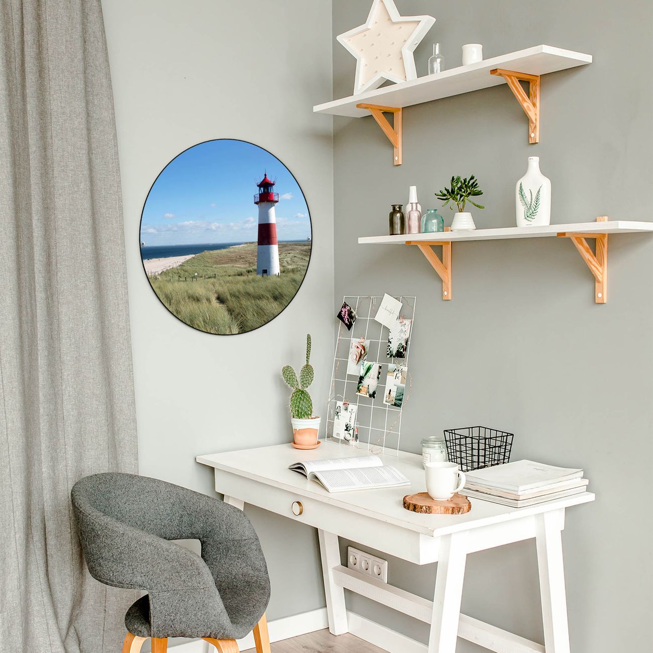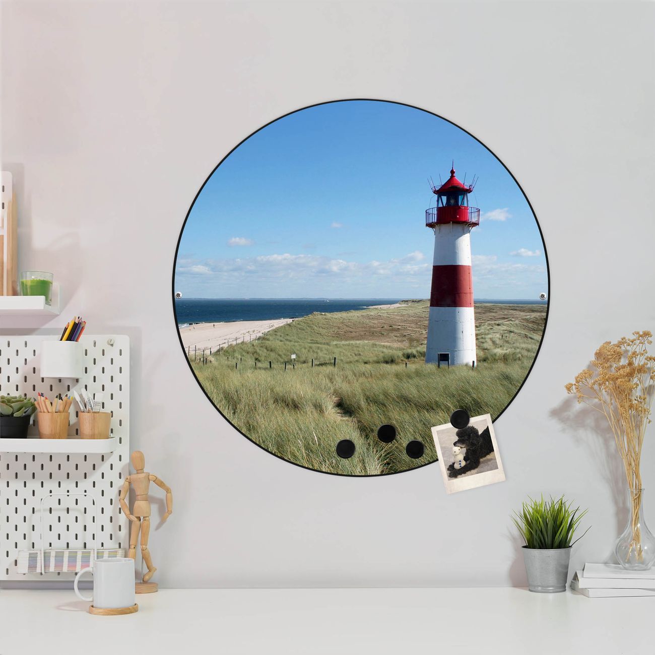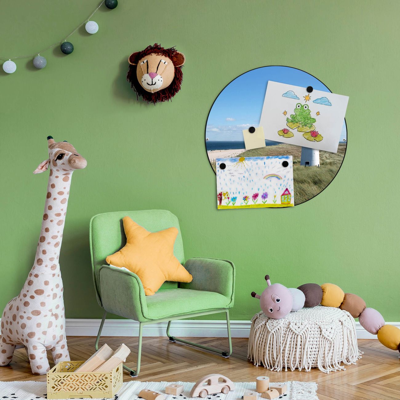 FUNKTION / DESIGN Die banjado Magnettafel mit dem Motiv Motiv Leuchtturm bringt Ordnung in Ihr Zettelchaos. Fotos, Termine, Notizen oder Rezepte lassen Sich hier stilvoll mit Magneten ordnen, Sie behalten alles im Blick. Die Design Magnetwand ist beschreibbar und wieder abwischbar. Mit dieser Pinnwand haben Sie auch ohne Notizen und Magneten ein schönes Dekoelement. Das Format bietet Ihnen ausreichend Platz um alle wichtigen Informationen im Blick zu behalten. DETAILS / NUTZEN Die magnetische Metall Pinnwand besteht aus schwarz lackiertem Stahl. Sie hat einen Durchmesser von 47cm. Es befinden sich an den Seiten zwei vorgefertigte Löcher die eine schnelle und unkomplizierte Anbringung ermöglichen. Das Motiv ist mit einem seidenmatten Laminat versehen und schützt so zusätzlich vor Kratzern. Es halten alle handelsüblichen Magneten daran. Wir sind ein kleines Team aus dem Herzen von Sachsen. Wir fertigen alle Artikel von Hand für Sie an, Sie erhalten keine preiswerte Importware. Auf Wunsch können Sie auch Ihr eigenes Foto auf die Magnettafel aufbringen, schreiben Sie uns an.