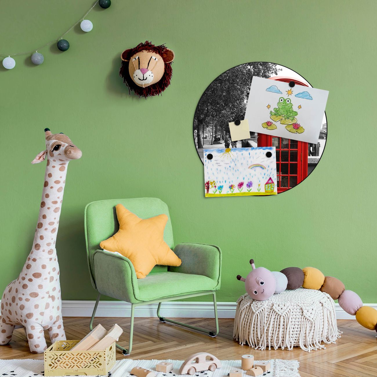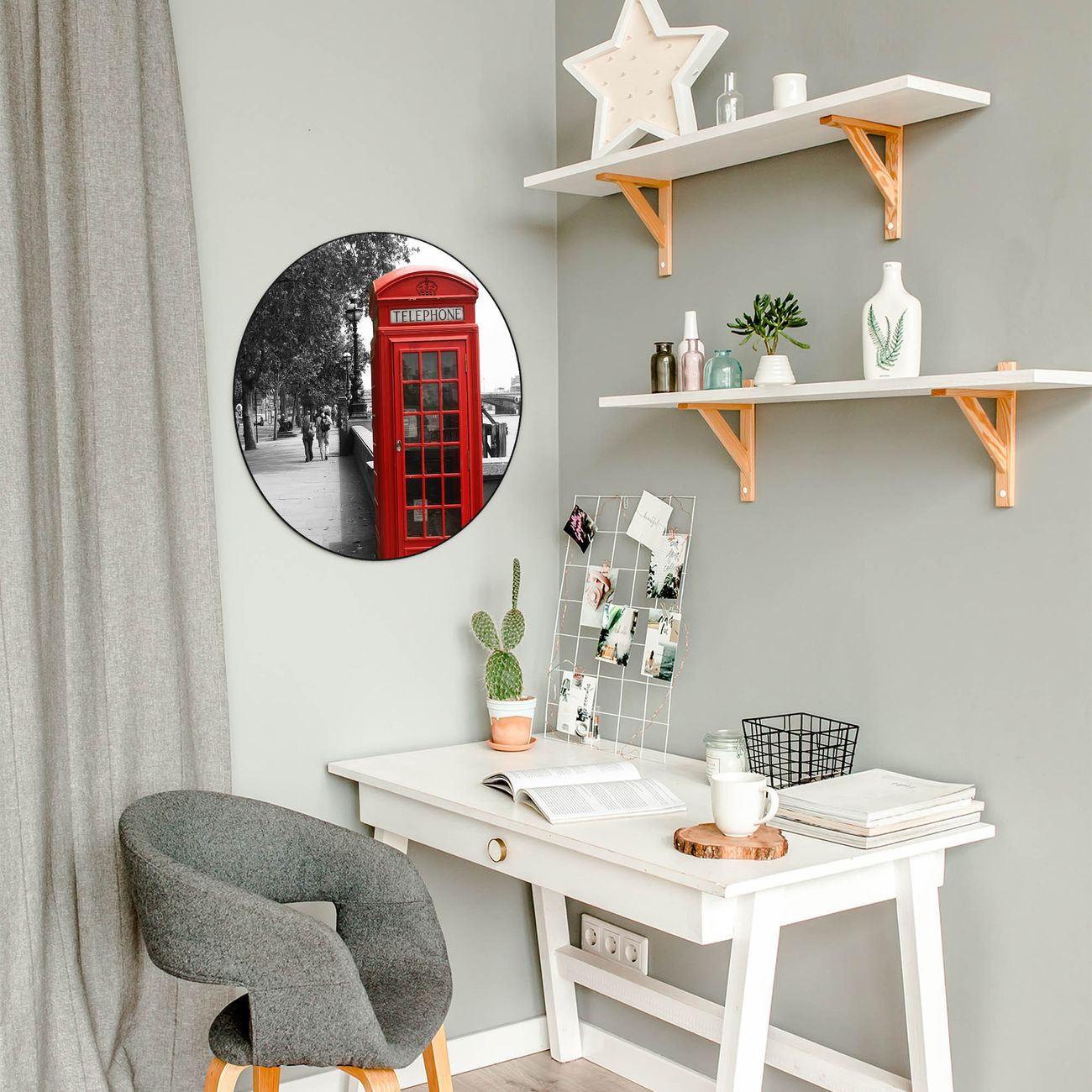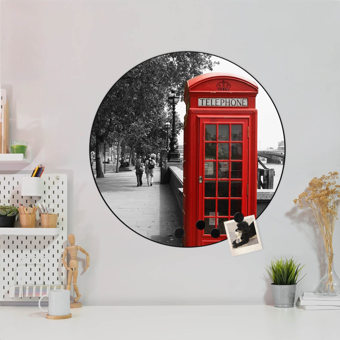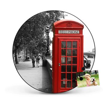FUNKTION / DESIGN Die banjado Magnettafel mit dem Motiv Motiv London Red Telephone bringt Ordnung in Ihr Zettelchaos. Fotos, Termine, Notizen oder Rezepte lassen Sich hier stilvoll mit Magneten ordnen, Sie behalten alles im Blick. Die Design Magnetwand ist beschreibbar und wieder abwischbar. Mit dieser Pinnwand haben Sie auch ohne Notizen und Magneten ein schönes Dekoelement. Das Format bietet Ihnen ausreichend Platz um alle wichtigen Informationen im Blick zu behalten. DETAILS / NUTZEN Die magnetische Metall Pinnwand besteht aus schwarz lackiertem Stahl. Sie hat einen Durchmesser von 47cm. Es befinden sich an den Seiten zwei vorgefertigte Löcher die eine schnelle und unkomplizierte Anbringung ermöglichen. Das Motiv ist mit einem seidenmatten Laminat versehen und schützt so zusätzlich vor Kratzern. Es halten alle handelsüblichen Magneten daran. Wir sind ein kleines Team aus dem Herzen von Sachsen. Wir fertigen alle Artikel von Hand für Sie an, Sie erhalten keine preiswerte Importware. Auf Wunsch können Sie auch Ihr eigenes Foto auf die Magnettafel aufbringen, schreiben Sie uns an.