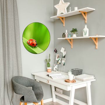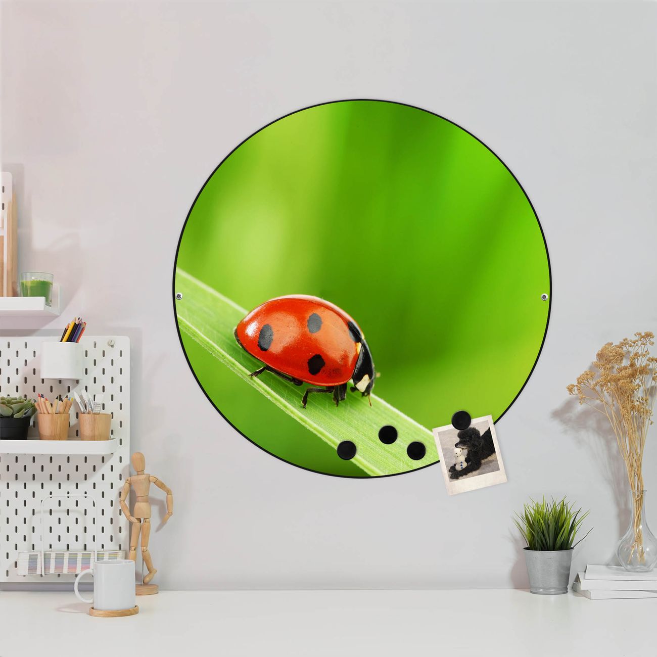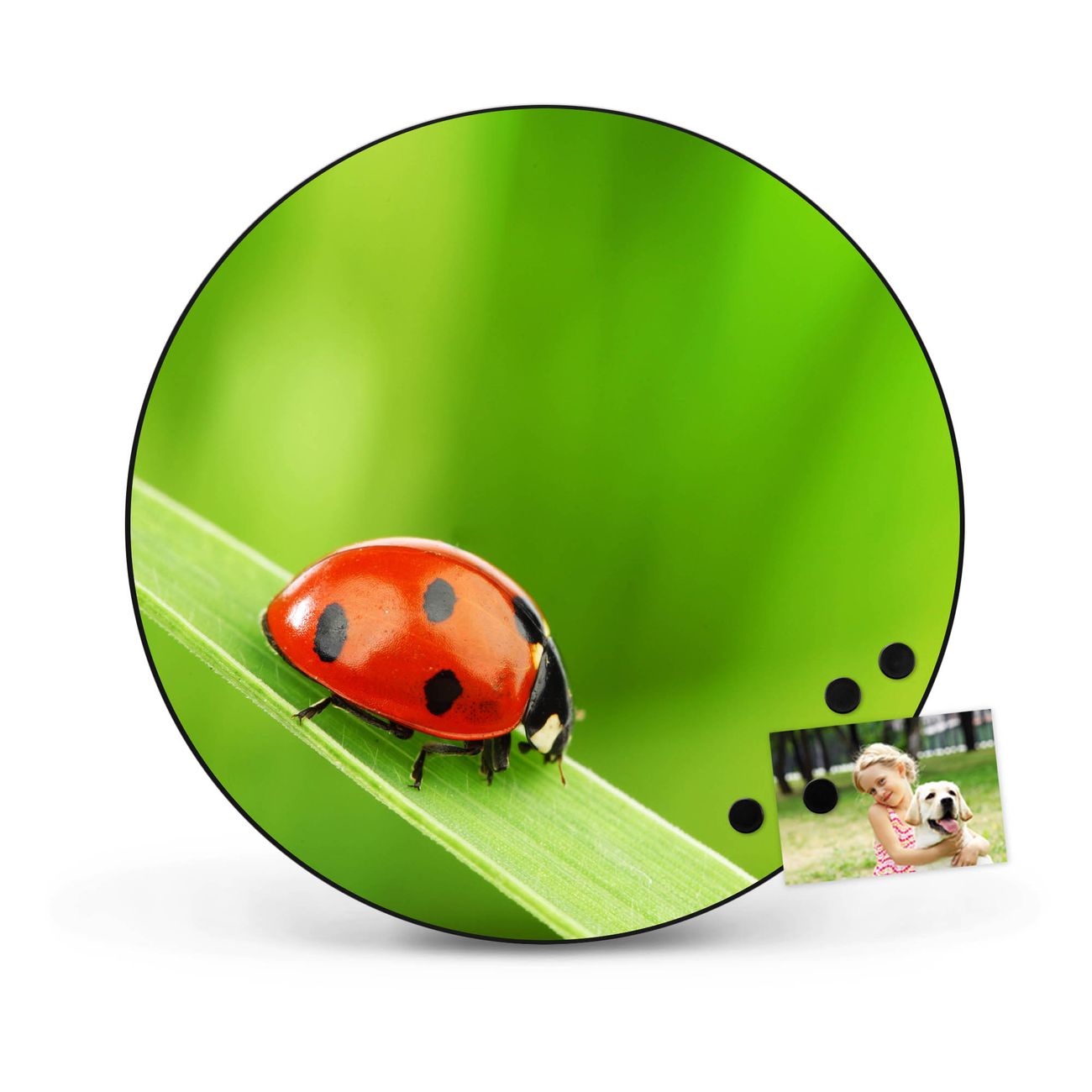 FUNKTION / DESIGN Die banjado Magnettafel mit dem Motiv Motiv Marienkäfer bringt Ordnung in Ihr Zettelchaos. Fotos, Termine, Notizen oder Rezepte lassen Sich hier stilvoll mit Magneten ordnen, Sie behalten alles im Blick. Die Design Magnetwand ist beschreibbar und wieder abwischbar. Mit dieser Pinnwand haben Sie auch ohne Notizen und Magneten ein schönes Dekoelement. Das Format bietet Ihnen ausreichend Platz um alle wichtigen Informationen im Blick zu behalten. DETAILS / NUTZEN Die magnetische Metall Pinnwand besteht aus schwarz lackiertem Stahl. Sie hat einen Durchmesser von 47cm. Es befinden sich an den Seiten zwei vorgefertigte Löcher die eine schnelle und unkomplizierte Anbringung ermöglichen. Das Motiv ist mit einem seidenmatten Laminat versehen und schützt so zusätzlich vor Kratzern. Es halten alle handelsüblichen Magneten daran. Wir sind ein kleines Team aus dem Herzen von Sachsen. Wir fertigen alle Artikel von Hand für Sie an, Sie erhalten keine preiswerte Importware. Auf Wunsch können Sie auch Ihr eigenes Foto auf die Magnettafel aufbringen, schreiben Sie uns an.