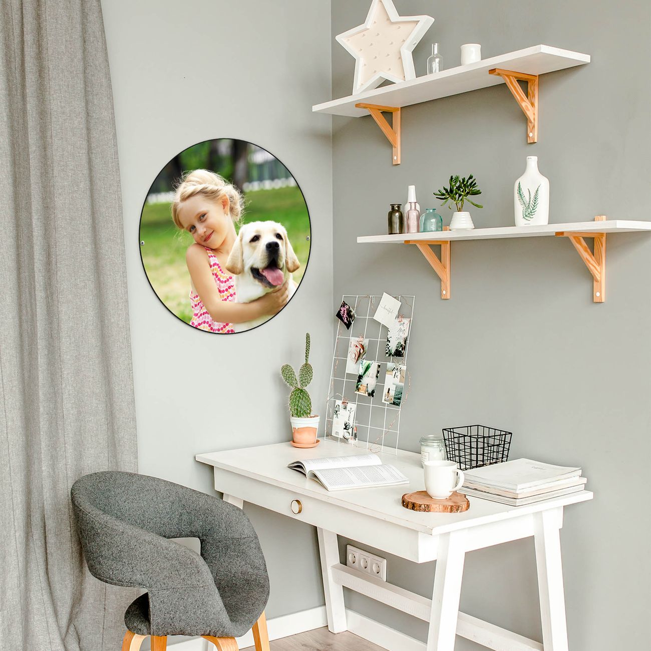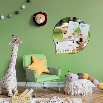 FUNKTION / DESIGN Die banjado Magnettafel mit dem Motiv Motiv Wunschmotiv bringt Ordnung in Ihr Zettelchaos. Fotos, Termine, Notizen oder Rezepte lassen Sich hier stilvoll mit Magneten ordnen, Sie behalten alles im Blick. Die Design Magnetwand ist beschreibbar und wieder abwischbar. Mit dieser Pinnwand haben Sie auch ohne Notizen und Magneten ein schönes Dekoelement. Das Format bietet Ihnen ausreichend Platz um alle wichtigen Informationen im Blick zu behalten. DETAILS / NUTZEN Die magnetische Metall Pinnwand besteht aus schwarz lackiertem Stahl. Sie hat einen Durchmesser von 47cm. Es befinden sich an den Seiten zwei vorgefertigte Löcher die eine schnelle und unkomplizierte Anbringung ermöglichen. Das Motiv ist mit einem seidenmatten Laminat versehen und schützt so zusätzlich vor Kratzern. Es halten alle handelsüblichen Magneten daran. Wir sind ein kleines Team aus dem Herzen von Sachsen. Wir fertigen alle Artikel von Hand für Sie an, Sie erhalten keine preiswerte Importware. Auf Wunsch können Sie auch Ihr eigenes Foto auf die Magnettafel aufbringen, schreiben Sie uns an.
