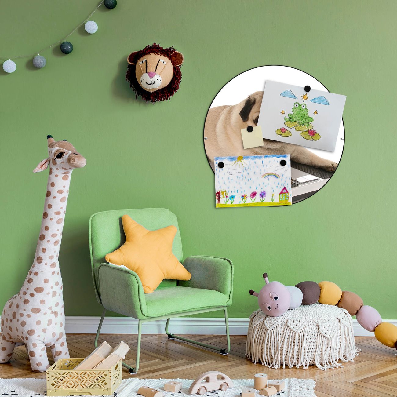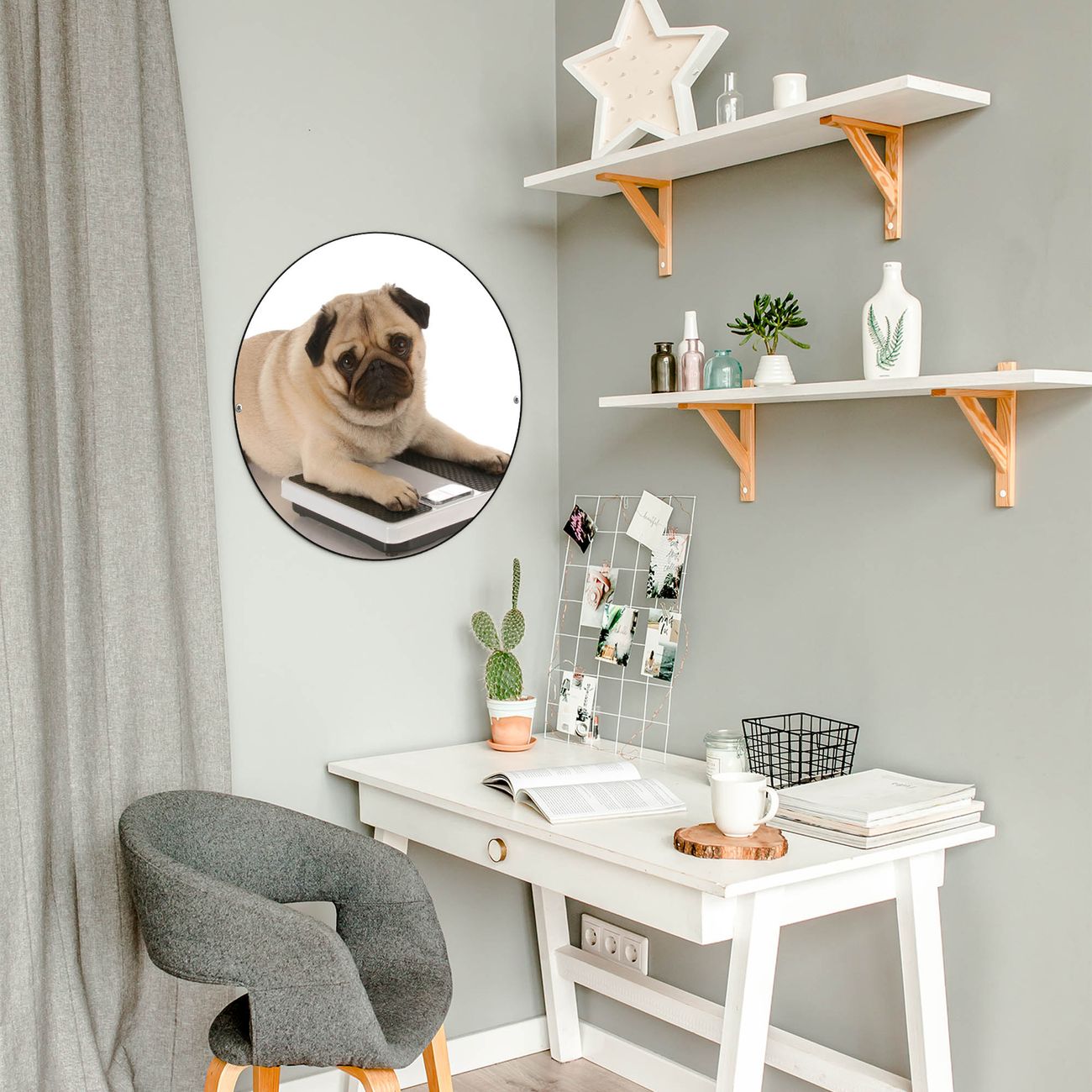 FUNKTION / DESIGN Die banjado Magnettafel mit dem Motiv Motiv Mops bringt Ordnung in Ihr Zettelchaos. Fotos, Termine, Notizen oder Rezepte lassen Sich hier stilvoll mit Magneten ordnen, Sie behalten alles im Blick. Die Design Magnetwand ist beschreibbar und wieder abwischbar. Mit dieser Pinnwand haben Sie auch ohne Notizen und Magneten ein schönes Dekoelement. Das Format bietet Ihnen ausreichend Platz um alle wichtigen Informationen im Blick zu behalten. DETAILS / NUTZEN Die magnetische Metall Pinnwand besteht aus schwarz lackiertem Stahl. Sie hat einen Durchmesser von 47cm. Es befinden sich an den Seiten zwei vorgefertigte Löcher die eine schnelle und unkomplizierte Anbringung ermöglichen. Das Motiv ist mit einem seidenmatten Laminat versehen und schützt so zusätzlich vor Kratzern. Es halten alle handelsüblichen Magneten daran. Wir sind ein kleines Team aus dem Herzen von Sachsen. Wir fertigen alle Artikel von Hand für Sie an, Sie erhalten keine preiswerte Importware. Auf Wunsch können Sie auch Ihr eigenes Foto auf die Magnettafel aufbringen, schreiben Sie uns an.