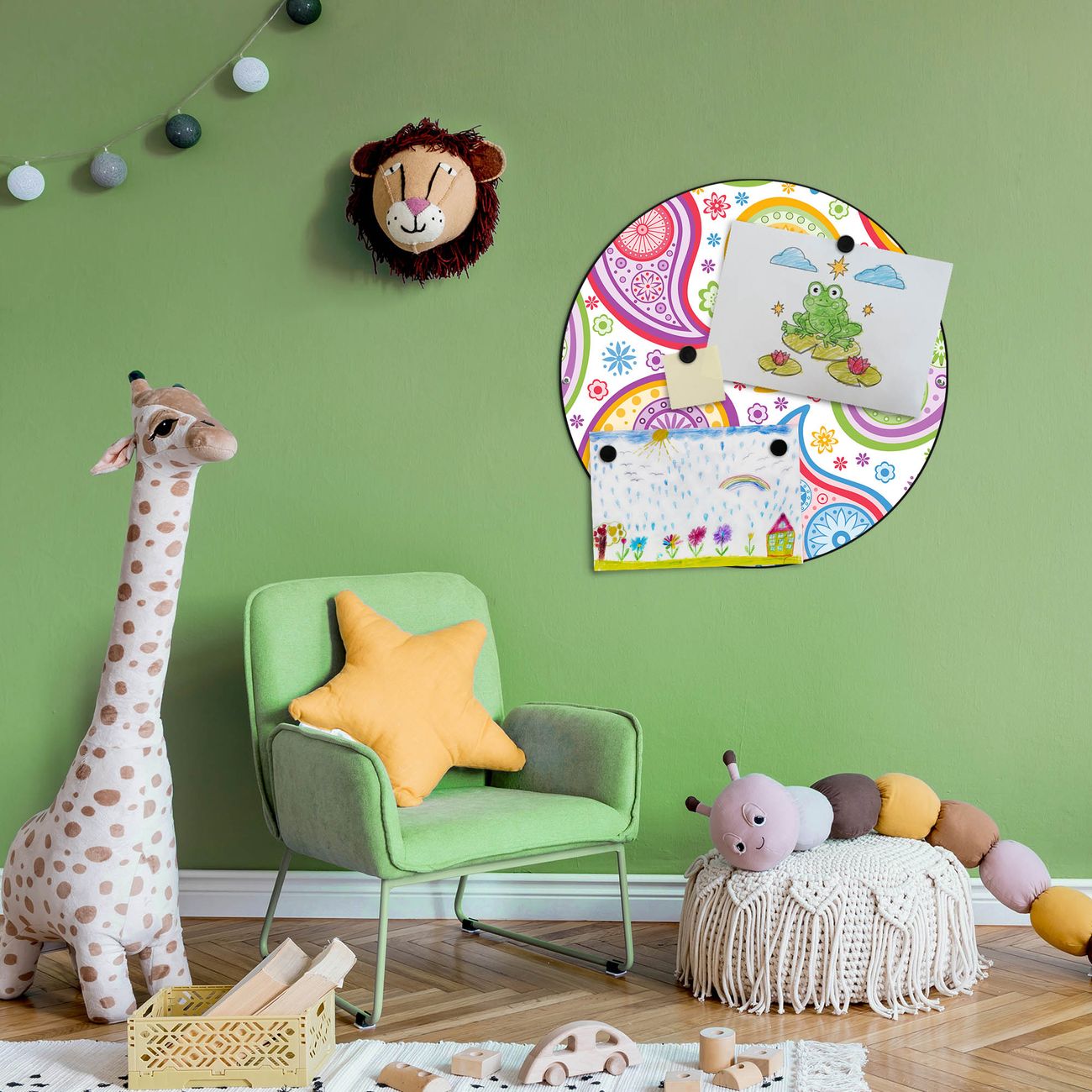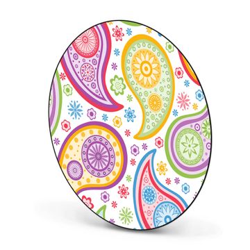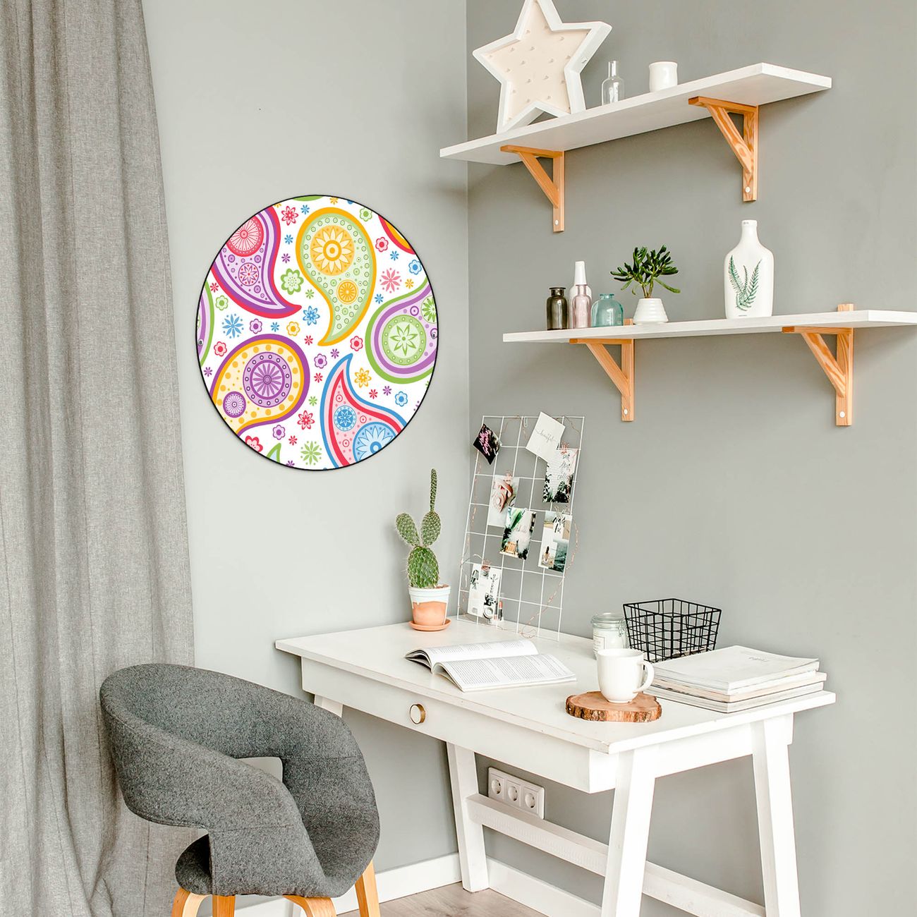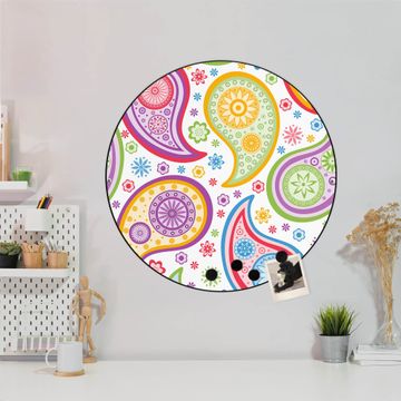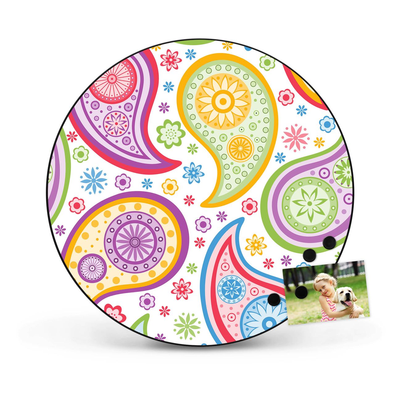 FUNKTION / DESIGN Die banjado Magnettafel mit dem Motiv Motiv Paisley bunt bringt Ordnung in Ihr Zettelchaos. Fotos, Termine, Notizen oder Rezepte lassen Sich hier stilvoll mit Magneten ordnen, Sie behalten alles im Blick. Die Design Magnetwand ist beschreibbar und wieder abwischbar. Mit dieser Pinnwand haben Sie auch ohne Notizen und Magneten ein schönes Dekoelement. Das Format bietet Ihnen ausreichend Platz um alle wichtigen Informationen im Blick zu behalten. DETAILS / NUTZEN Die magnetische Metall Pinnwand besteht aus schwarz lackiertem Stahl. Sie hat einen Durchmesser von 47cm. Es befinden sich an den Seiten zwei vorgefertigte Löcher die eine schnelle und unkomplizierte Anbringung ermöglichen. Das Motiv ist mit einem seidenmatten Laminat versehen und schützt so zusätzlich vor Kratzern. Es halten alle handelsüblichen Magneten daran. Wir sind ein kleines Team aus dem Herzen von Sachsen. Wir fertigen alle Artikel von Hand für Sie an, Sie erhalten keine preiswerte Importware. Auf Wunsch können Sie auch Ihr eigenes Foto auf die Magnettafel aufbringen, schreiben Sie uns an.