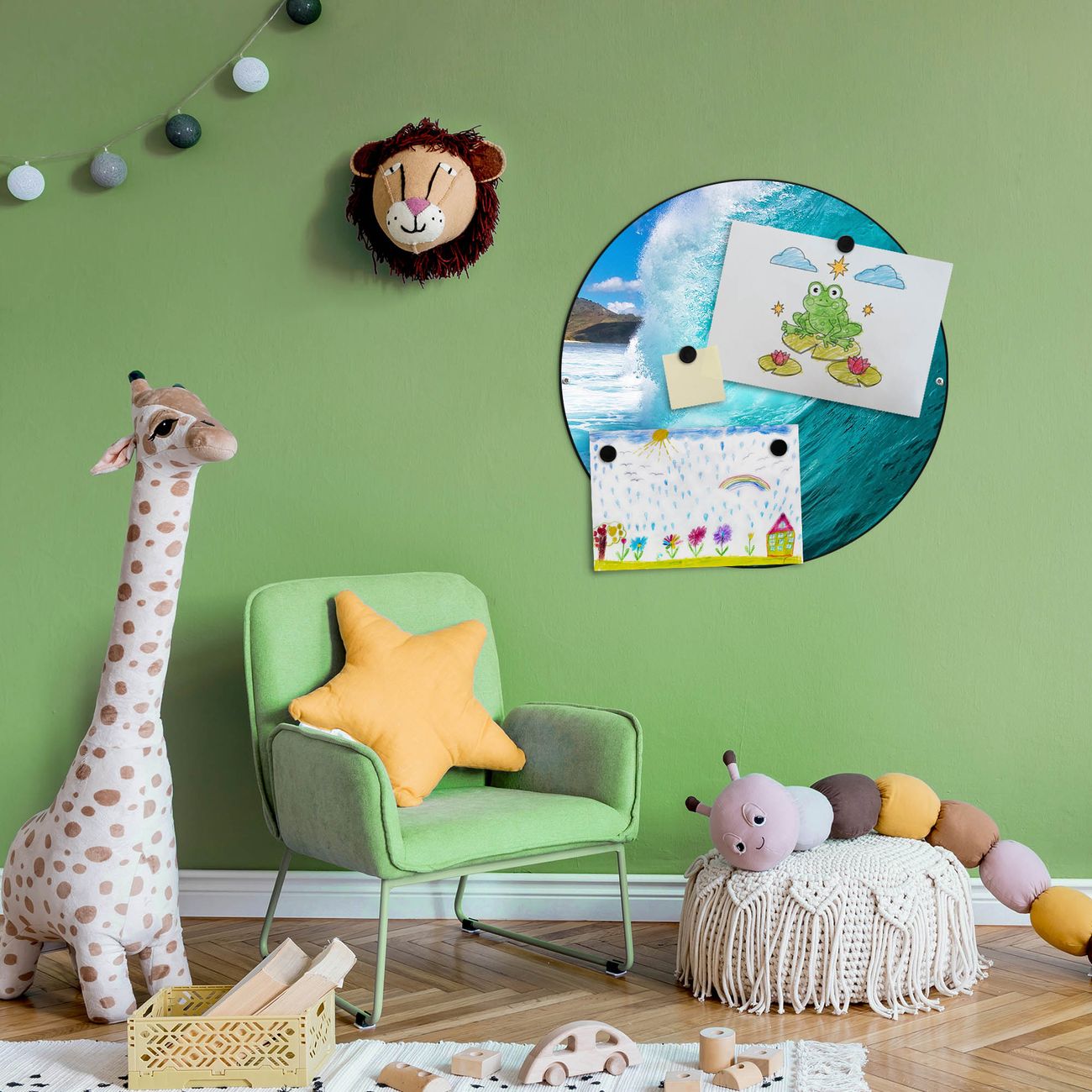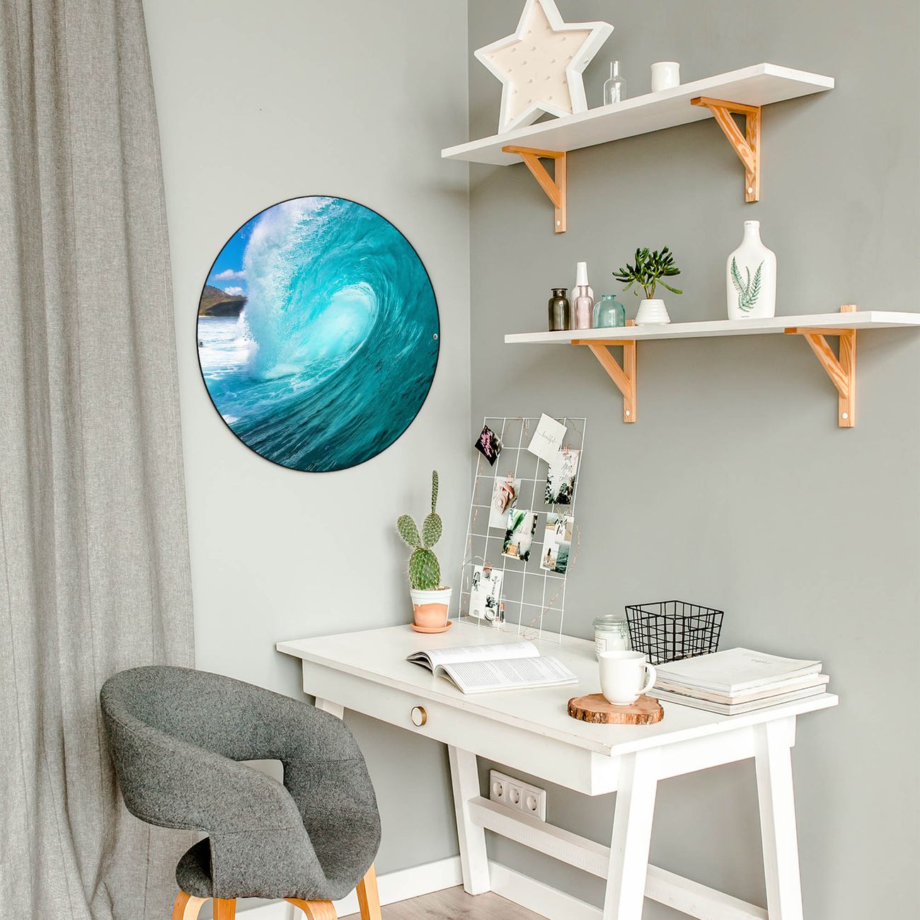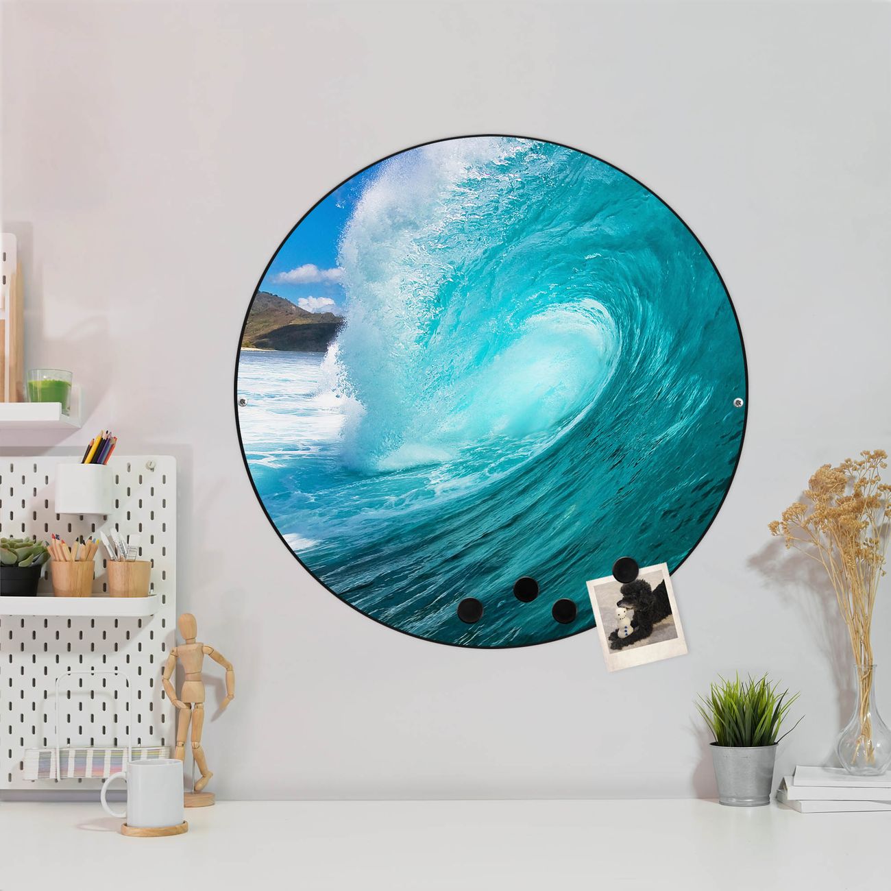 FUNKTION / DESIGN Die banjado Magnettafel mit dem Motiv Motiv Perfekte Welle bringt Ordnung in Ihr Zettelchaos. Fotos, Termine, Notizen oder Rezepte lassen Sich hier stilvoll mit Magneten ordnen, Sie behalten alles im Blick. Die Design Magnetwand ist beschreibbar und wieder abwischbar. Mit dieser Pinnwand haben Sie auch ohne Notizen und Magneten ein schönes Dekoelement. Das Format bietet Ihnen ausreichend Platz um alle wichtigen Informationen im Blick zu behalten. DETAILS / NUTZEN Die magnetische Metall Pinnwand besteht aus schwarz lackiertem Stahl. Sie hat einen Durchmesser von 47cm. Es befinden sich an den Seiten zwei vorgefertigte Löcher die eine schnelle und unkomplizierte Anbringung ermöglichen. Das Motiv ist mit einem seidenmatten Laminat versehen und schützt so zusätzlich vor Kratzern. Es halten alle handelsüblichen Magneten daran. Wir sind ein kleines Team aus dem Herzen von Sachsen. Wir fertigen alle Artikel von Hand für Sie an, Sie erhalten keine preiswerte Importware. Auf Wunsch können Sie auch Ihr eigenes Foto auf die Magnettafel aufbringen, schreiben Sie uns an.