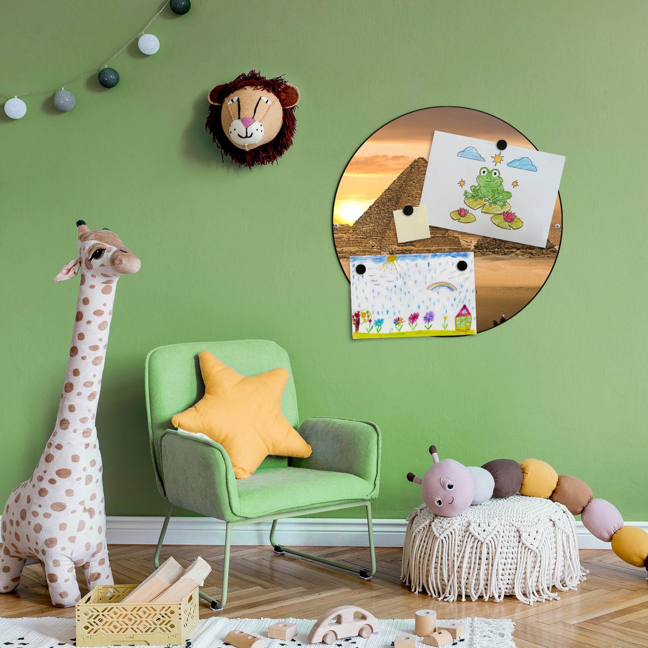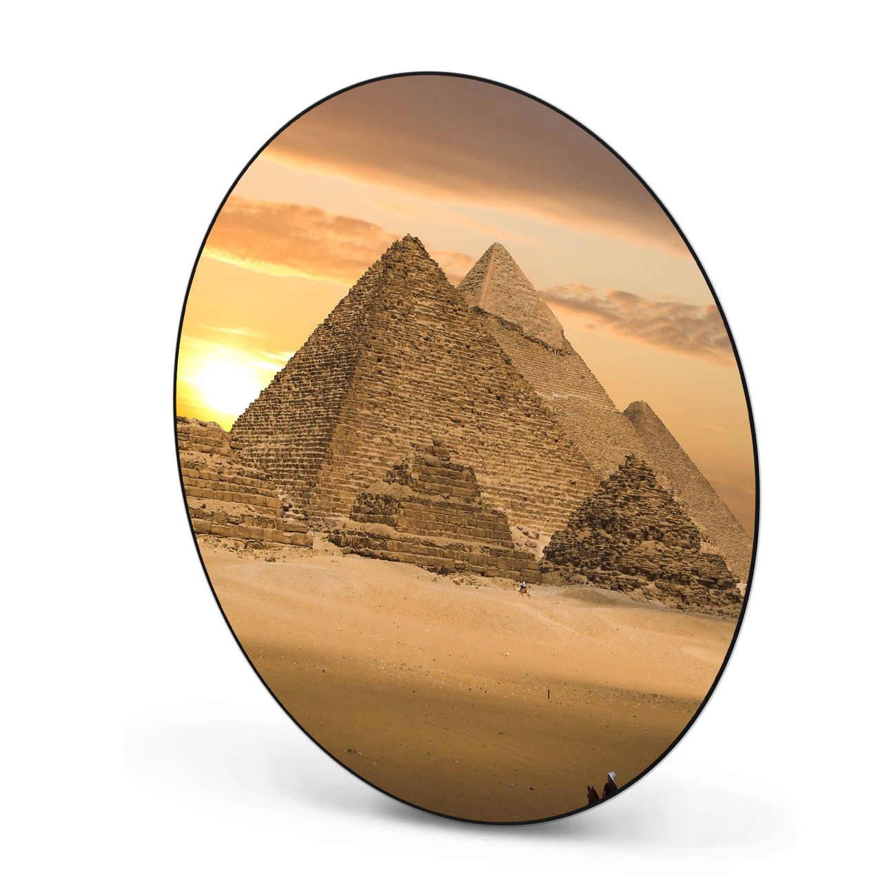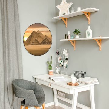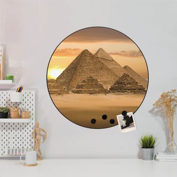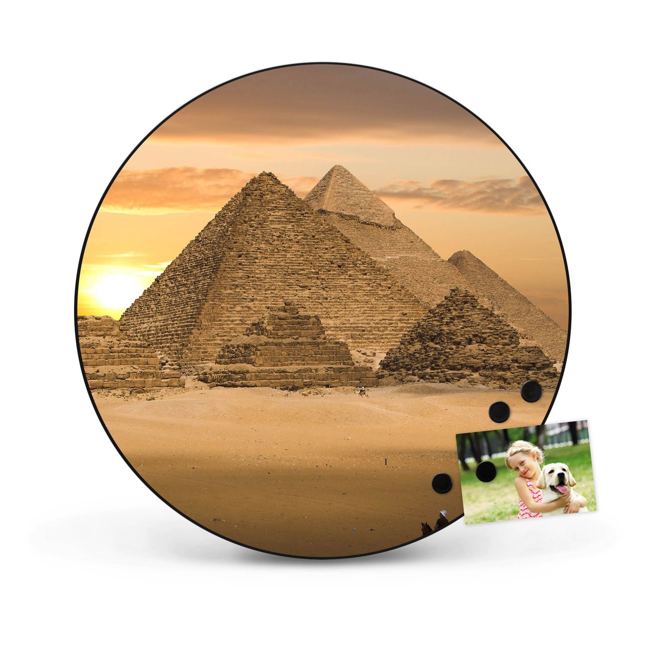 FUNKTION / DESIGN Die banjado Magnettafel mit dem Motiv Motiv Pyramiden bringt Ordnung in Ihr Zettelchaos. Fotos, Termine, Notizen oder Rezepte lassen Sich hier stilvoll mit Magneten ordnen, Sie behalten alles im Blick. Die Design Magnetwand ist beschreibbar und wieder abwischbar. Mit dieser Pinnwand haben Sie auch ohne Notizen und Magneten ein schönes Dekoelement. Das Format bietet Ihnen ausreichend Platz um alle wichtigen Informationen im Blick zu behalten. DETAILS / NUTZEN Die magnetische Metall Pinnwand besteht aus schwarz lackiertem Stahl. Sie hat einen Durchmesser von 47cm. Es befinden sich an den Seiten zwei vorgefertigte Löcher die eine schnelle und unkomplizierte Anbringung ermöglichen. Das Motiv ist mit einem seidenmatten Laminat versehen und schützt so zusätzlich vor Kratzern. Es halten alle handelsüblichen Magneten daran. Wir sind ein kleines Team aus dem Herzen von Sachsen. Wir fertigen alle Artikel von Hand für Sie an, Sie erhalten keine preiswerte Importware. Auf Wunsch können Sie auch Ihr eigenes Foto auf die Magnettafel aufbringen, schreiben Sie uns an.