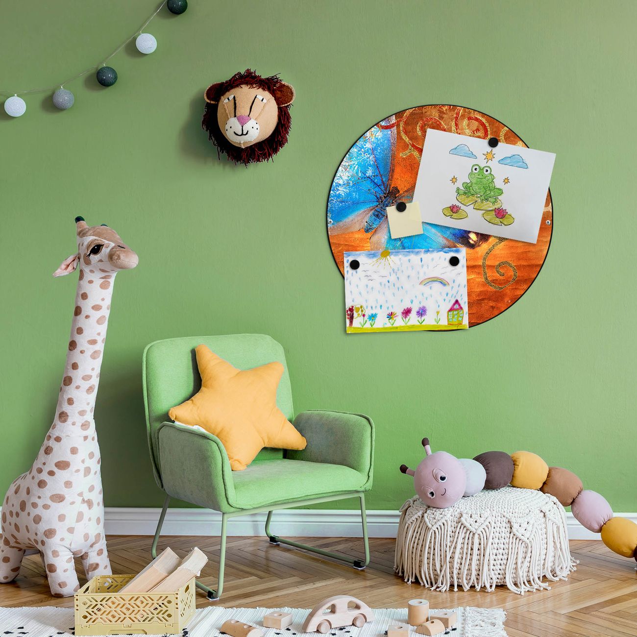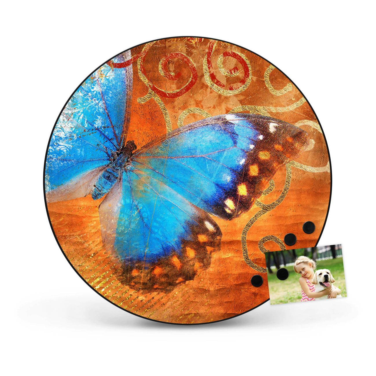 FUNKTION / DESIGN Die banjado Magnettafel mit dem Motiv Motiv Schmetterling bringt Ordnung in Ihr Zettelchaos. Fotos, Termine, Notizen oder Rezepte lassen Sich hier stilvoll mit Magneten ordnen, Sie behalten alles im Blick. Die Design Magnetwand ist beschreibbar und wieder abwischbar. Mit dieser Pinnwand haben Sie auch ohne Notizen und Magneten ein schönes Dekoelement. Das Format bietet Ihnen ausreichend Platz um alle wichtigen Informationen im Blick zu behalten. DETAILS / NUTZEN Die magnetische Metall Pinnwand besteht aus schwarz lackiertem Stahl. Sie hat einen Durchmesser von 47cm. Es befinden sich an den Seiten zwei vorgefertigte Löcher die eine schnelle und unkomplizierte Anbringung ermöglichen. Das Motiv ist mit einem seidenmatten Laminat versehen und schützt so zusätzlich vor Kratzern. Es halten alle handelsüblichen Magneten daran. Wir sind ein kleines Team aus dem Herzen von Sachsen. Wir fertigen alle Artikel von Hand für Sie an, Sie erhalten keine preiswerte Importware. Auf Wunsch können Sie auch Ihr eigenes Foto auf die Magnettafel aufbringen, schreiben Sie uns an.
