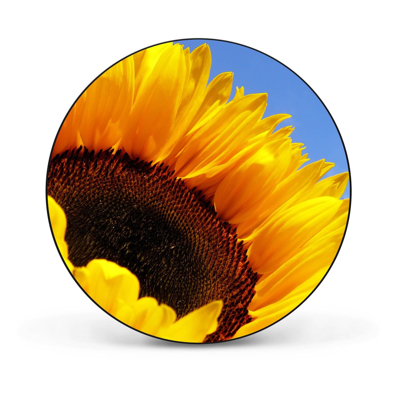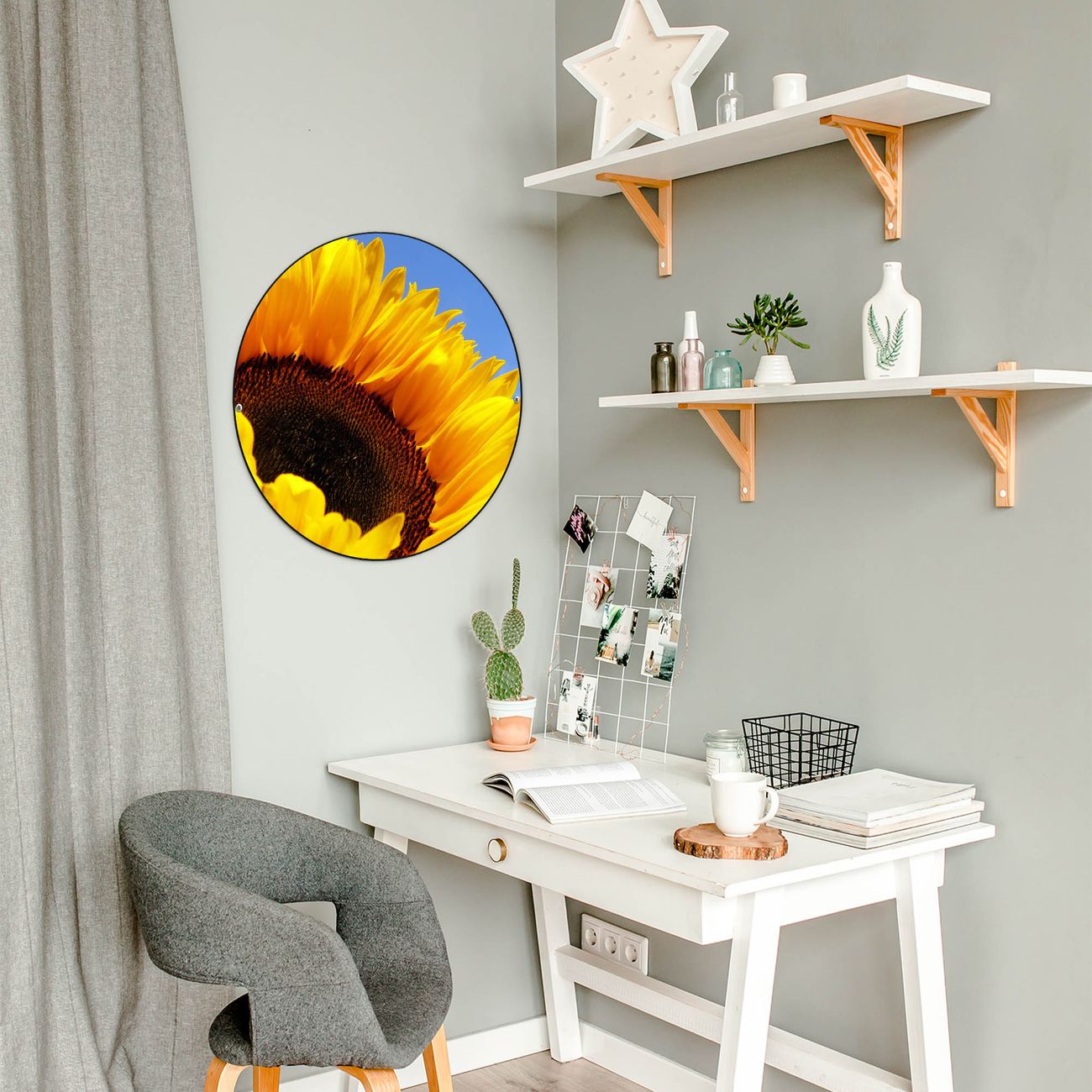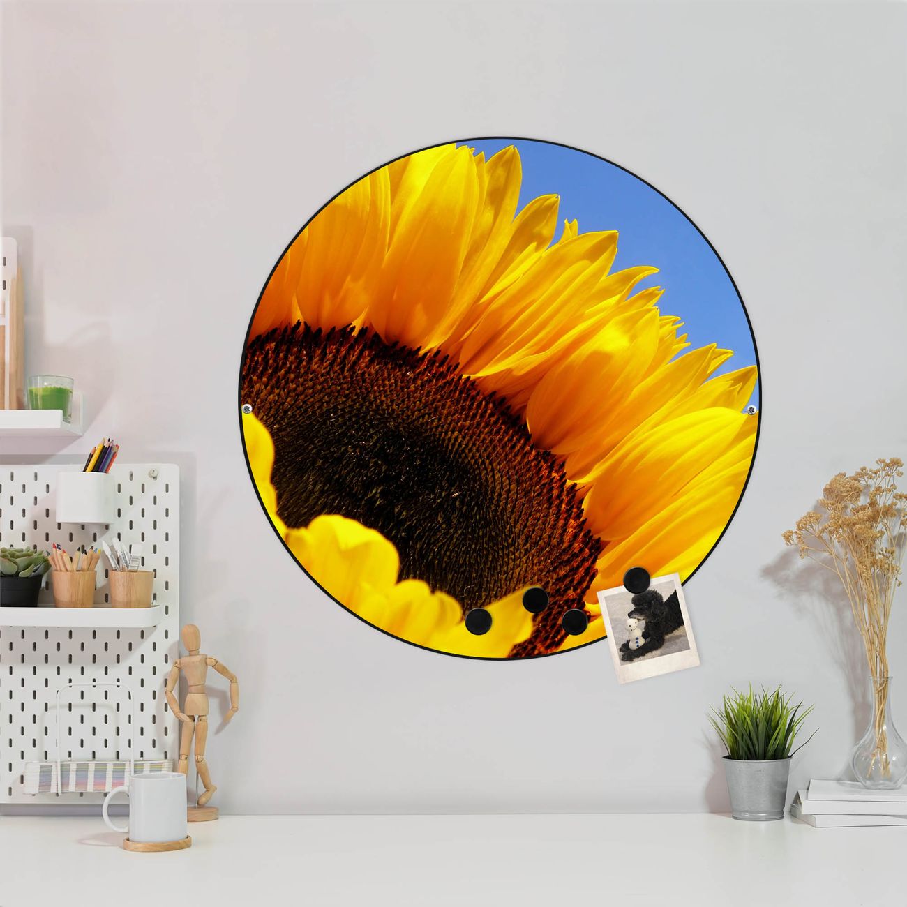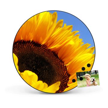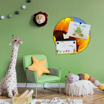 FUNKTION / DESIGN Die banjado Magnettafel mit dem Motiv Motiv Sonnenblume bringt Ordnung in Ihr Zettelchaos. Fotos, Termine, Notizen oder Rezepte lassen Sich hier stilvoll mit Magneten ordnen, Sie behalten alles im Blick. Die Design Magnetwand ist beschreibbar und wieder abwischbar. Mit dieser Pinnwand haben Sie auch ohne Notizen und Magneten ein schönes Dekoelement. Das Format bietet Ihnen ausreichend Platz um alle wichtigen Informationen im Blick zu behalten. DETAILS / NUTZEN Die magnetische Metall Pinnwand besteht aus schwarz lackiertem Stahl. Sie hat einen Durchmesser von 47cm. Es befinden sich an den Seiten zwei vorgefertigte Löcher die eine schnelle und unkomplizierte Anbringung ermöglichen. Das Motiv ist mit einem seidenmatten Laminat versehen und schützt so zusätzlich vor Kratzern. Es halten alle handelsüblichen Magneten daran. Wir sind ein kleines Team aus dem Herzen von Sachsen. Wir fertigen alle Artikel von Hand für Sie an, Sie erhalten keine preiswerte Importware. Auf Wunsch können Sie auch Ihr eigenes Foto auf die Magnettafel aufbringen, schreiben Sie uns an.