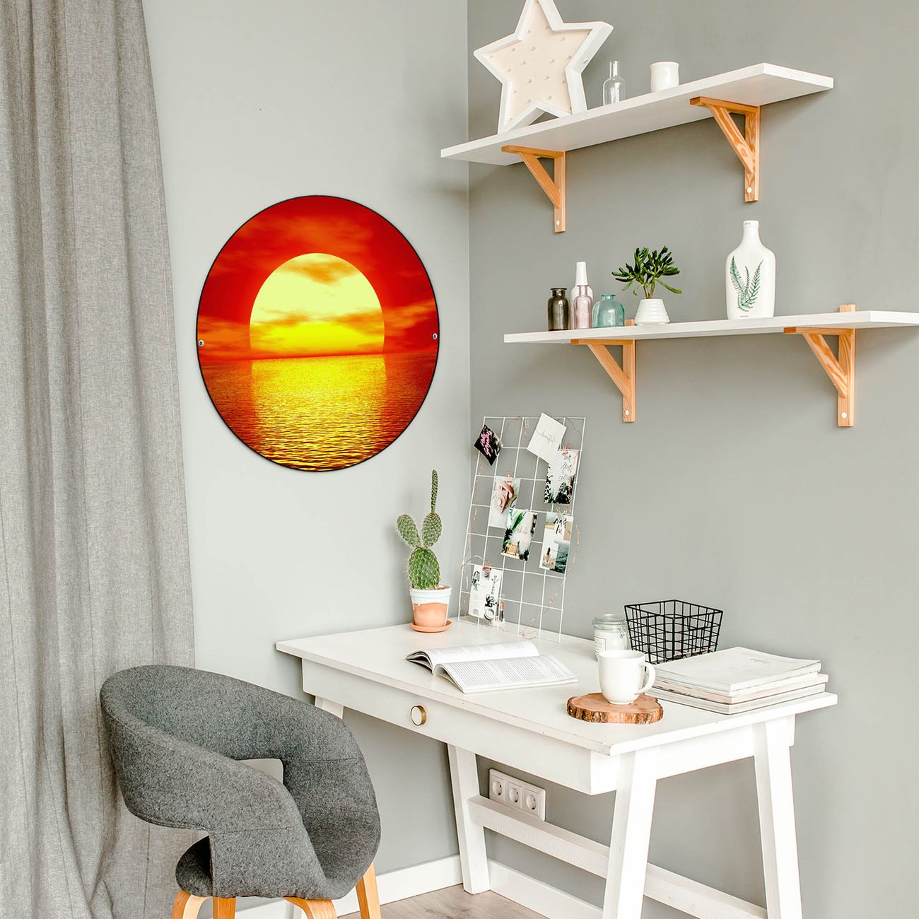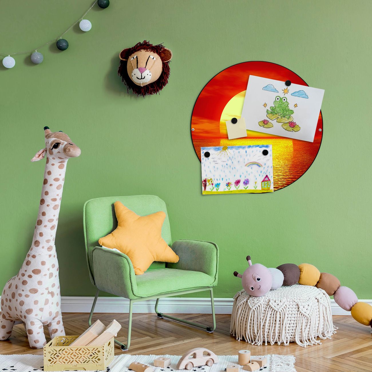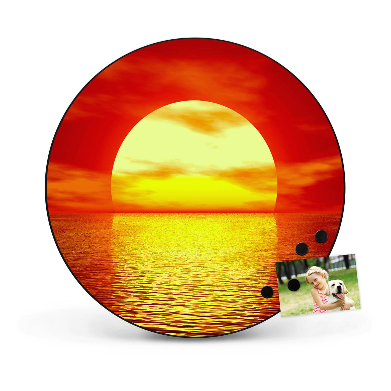 FUNKTION / DESIGN Die banjado Magnettafel mit dem Motiv Motiv Sonnenuntergang bringt Ordnung in Ihr Zettelchaos. Fotos, Termine, Notizen oder Rezepte lassen Sich hier stilvoll mit Magneten ordnen, Sie behalten alles im Blick. Die Design Magnetwand ist beschreibbar und wieder abwischbar. Mit dieser Pinnwand haben Sie auch ohne Notizen und Magneten ein schönes Dekoelement. Das Format bietet Ihnen ausreichend Platz um alle wichtigen Informationen im Blick zu behalten. DETAILS / NUTZEN Die magnetische Metall Pinnwand besteht aus schwarz lackiertem Stahl. Sie hat einen Durchmesser von 47cm. Es befinden sich an den Seiten zwei vorgefertigte Löcher die eine schnelle und unkomplizierte Anbringung ermöglichen. Das Motiv ist mit einem seidenmatten Laminat versehen und schützt so zusätzlich vor Kratzern. Es halten alle handelsüblichen Magneten daran. Wir sind ein kleines Team aus dem Herzen von Sachsen. Wir fertigen alle Artikel von Hand für Sie an, Sie erhalten keine preiswerte Importware. Auf Wunsch können Sie auch Ihr eigenes Foto auf die Magnettafel aufbringen, schreiben Sie uns an.