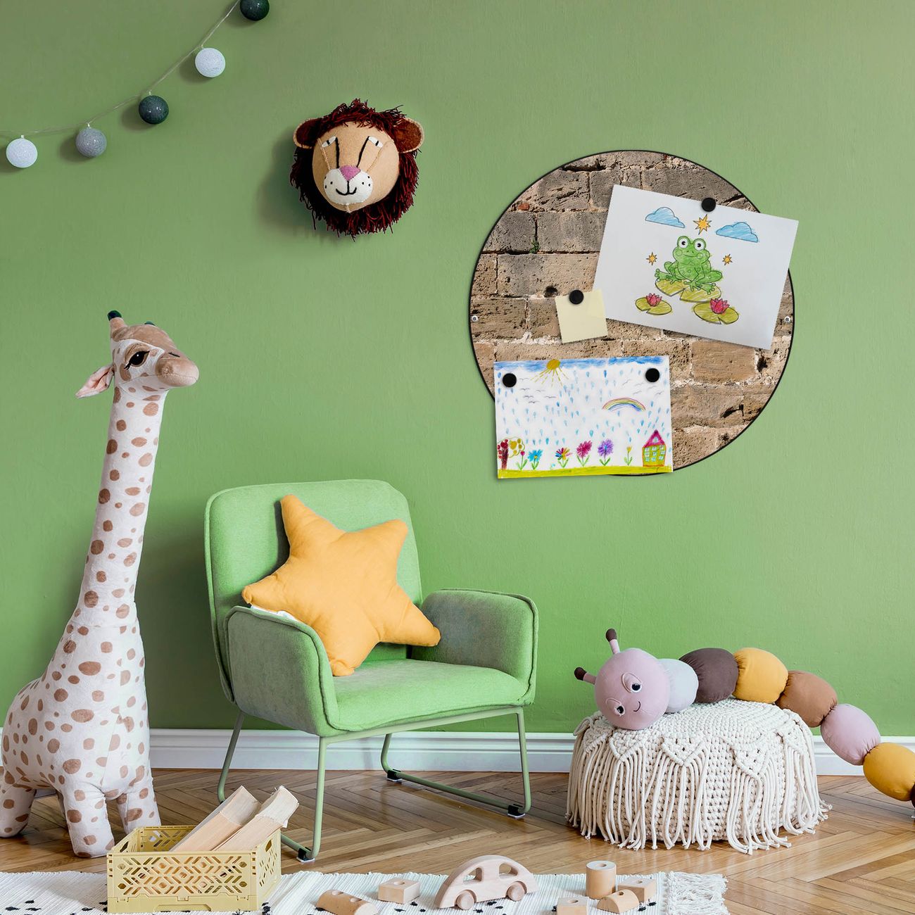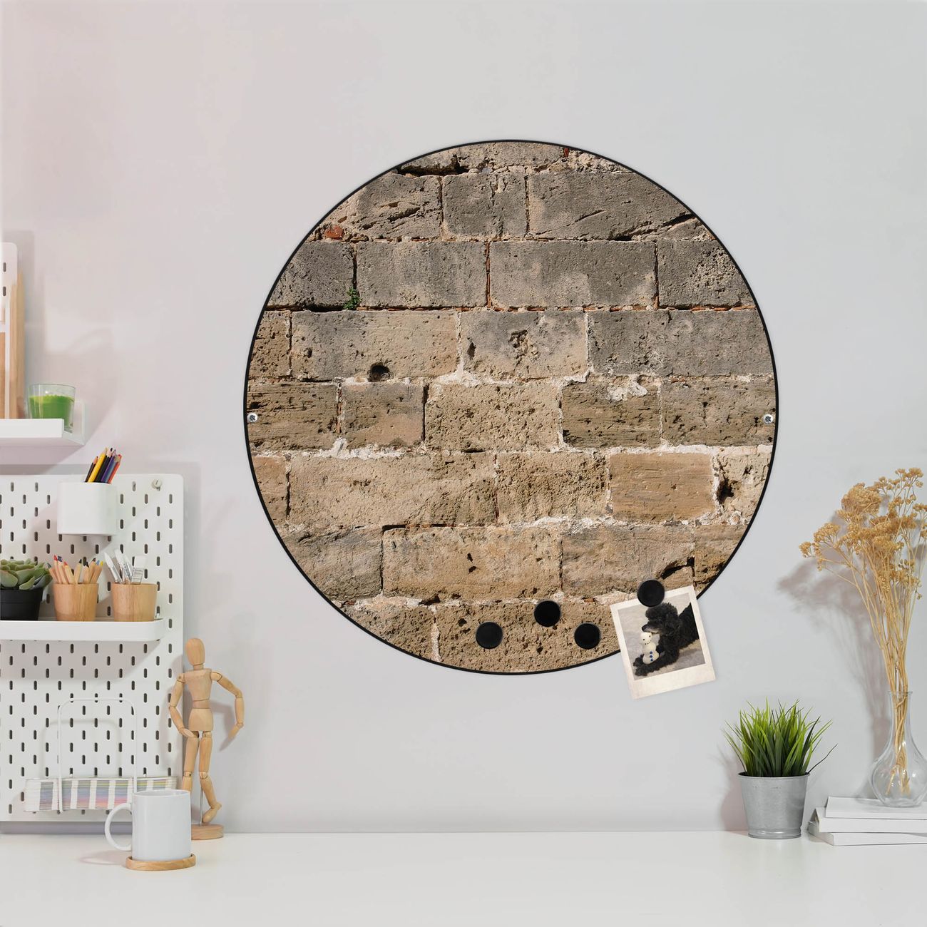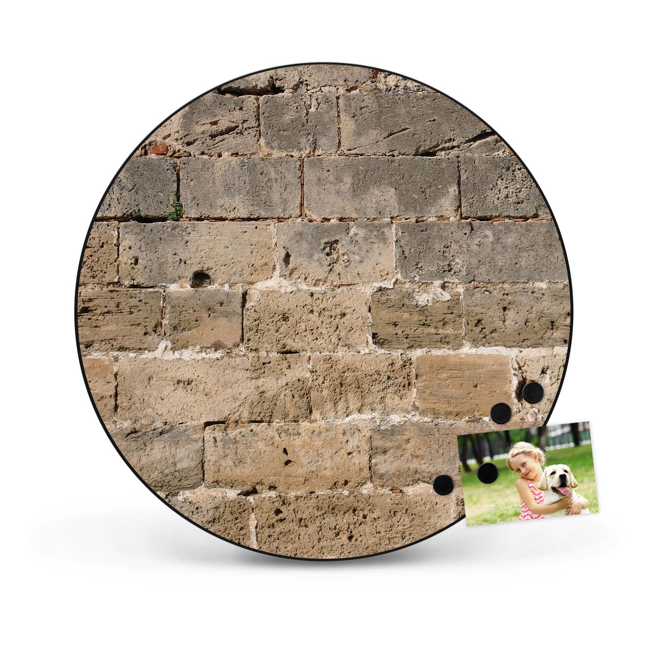 FUNKTION / DESIGN Die banjado Magnettafel mit dem Motiv Motiv Steinwand Antik bringt Ordnung in Ihr Zettelchaos. Fotos, Termine, Notizen oder Rezepte lassen Sich hier stilvoll mit Magneten ordnen, Sie behalten alles im Blick. Die Design Magnetwand ist beschreibbar und wieder abwischbar. Mit dieser Pinnwand haben Sie auch ohne Notizen und Magneten ein schönes Dekoelement. Das Format bietet Ihnen ausreichend Platz um alle wichtigen Informationen im Blick zu behalten. DETAILS / NUTZEN Die magnetische Metall Pinnwand besteht aus schwarz lackiertem Stahl. Sie hat einen Durchmesser von 47cm. Es befinden sich an den Seiten zwei vorgefertigte Löcher die eine schnelle und unkomplizierte Anbringung ermöglichen. Das Motiv ist mit einem seidenmatten Laminat versehen und schützt so zusätzlich vor Kratzern. Es halten alle handelsüblichen Magneten daran. Wir sind ein kleines Team aus dem Herzen von Sachsen. Wir fertigen alle Artikel von Hand für Sie an, Sie erhalten keine preiswerte Importware. Auf Wunsch können Sie auch Ihr eigenes Foto auf die Magnettafel aufbringen, schreiben Sie uns an.