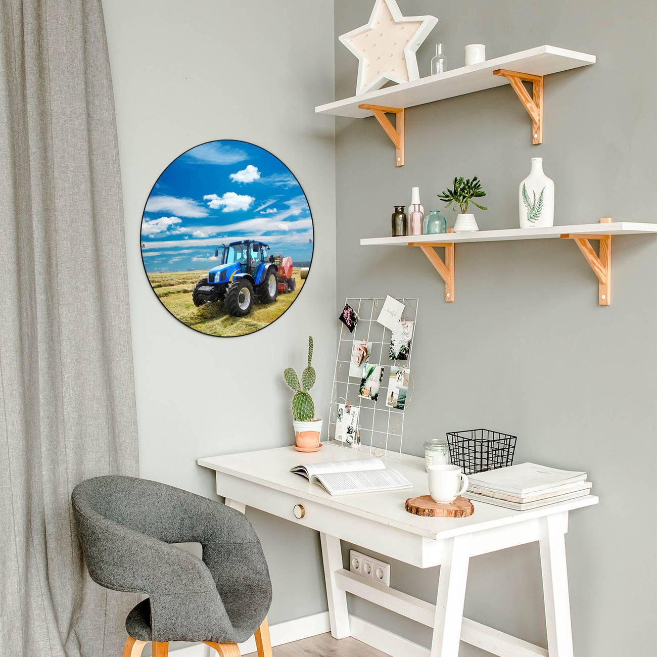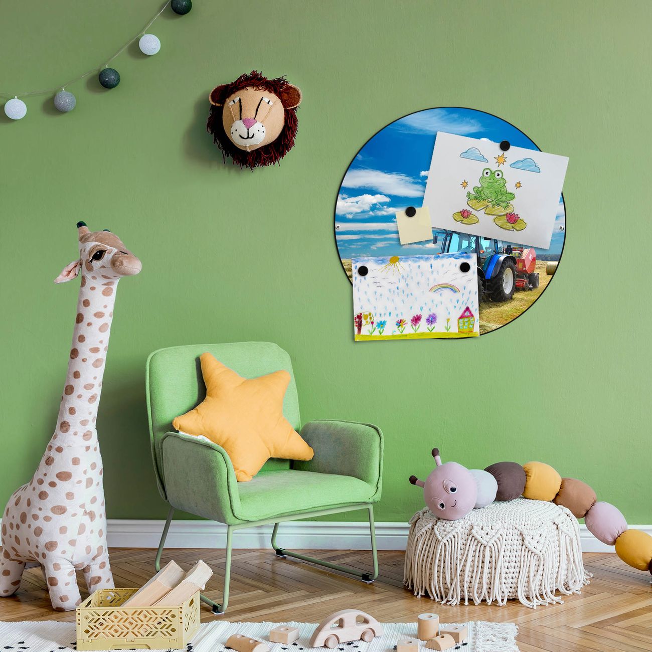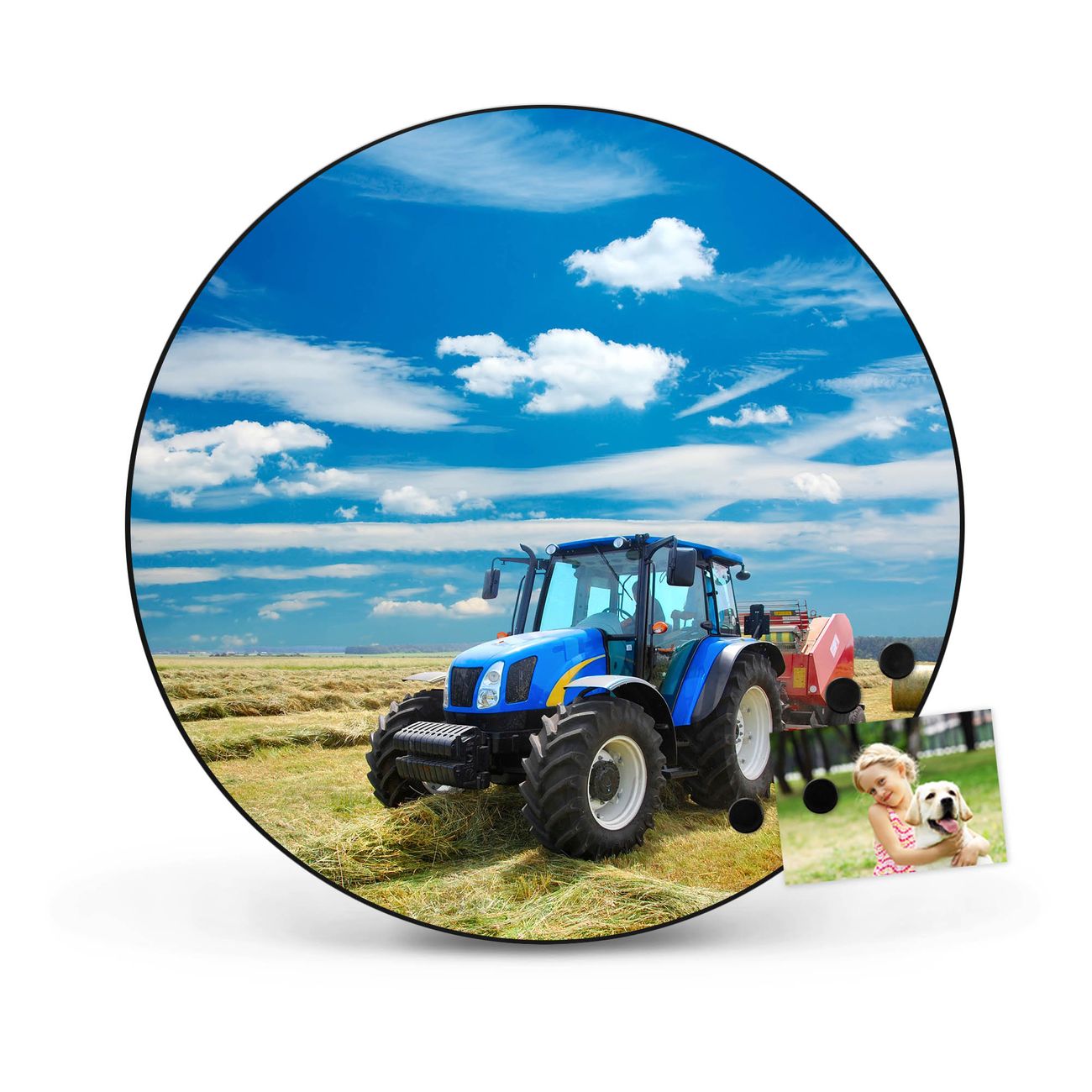 FUNKTION / DESIGN Die banjado Magnettafel mit dem Motiv Motiv Traktor bringt Ordnung in Ihr Zettelchaos. Fotos, Termine, Notizen oder Rezepte lassen Sich hier stilvoll mit Magneten ordnen, Sie behalten alles im Blick. Die Design Magnetwand ist beschreibbar und wieder abwischbar. Mit dieser Pinnwand haben Sie auch ohne Notizen und Magneten ein schönes Dekoelement. Das Format bietet Ihnen ausreichend Platz um alle wichtigen Informationen im Blick zu behalten. DETAILS / NUTZEN Die magnetische Metall Pinnwand besteht aus schwarz lackiertem Stahl. Sie hat einen Durchmesser von 47cm. Es befinden sich an den Seiten zwei vorgefertigte Löcher die eine schnelle und unkomplizierte Anbringung ermöglichen. Das Motiv ist mit einem seidenmatten Laminat versehen und schützt so zusätzlich vor Kratzern. Es halten alle handelsüblichen Magneten daran. Wir sind ein kleines Team aus dem Herzen von Sachsen. Wir fertigen alle Artikel von Hand für Sie an, Sie erhalten keine preiswerte Importware. Auf Wunsch können Sie auch Ihr eigenes Foto auf die Magnettafel aufbringen, schreiben Sie uns an.