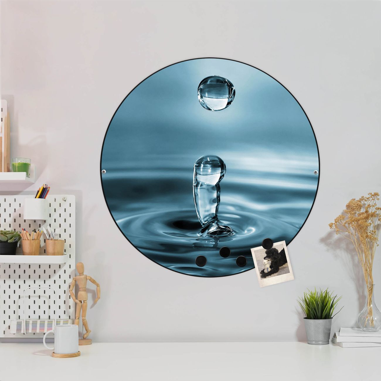FUNKTION / DESIGN Die banjado Magnettafel mit dem Motiv Motiv Wassertropfen bringt Ordnung in Ihr Zettelchaos. Fotos, Termine, Notizen oder Rezepte lassen Sich hier stilvoll mit Magneten ordnen, Sie behalten alles im Blick. Die Design Magnetwand ist beschreibbar und wieder abwischbar. Mit dieser Pinnwand haben Sie auch ohne Notizen und Magneten ein schönes Dekoelement. Das Format bietet Ihnen ausreichend Platz um alle wichtigen Informationen im Blick zu behalten. DETAILS / NUTZEN Die magnetische Metall Pinnwand besteht aus schwarz lackiertem Stahl. Sie hat einen Durchmesser von 47cm. Es befinden sich an den Seiten zwei vorgefertigte Löcher die eine schnelle und unkomplizierte Anbringung ermöglichen. Das Motiv ist mit einem seidenmatten Laminat versehen und schützt so zusätzlich vor Kratzern. Es halten alle handelsüblichen Magneten daran. Wir sind ein kleines Team aus dem Herzen von Sachsen. Wir fertigen alle Artikel von Hand für Sie an, Sie erhalten keine preiswerte Importware. Auf Wunsch können Sie auch Ihr eigenes Foto auf die Magnettafel aufbringen, schreiben Sie uns an.