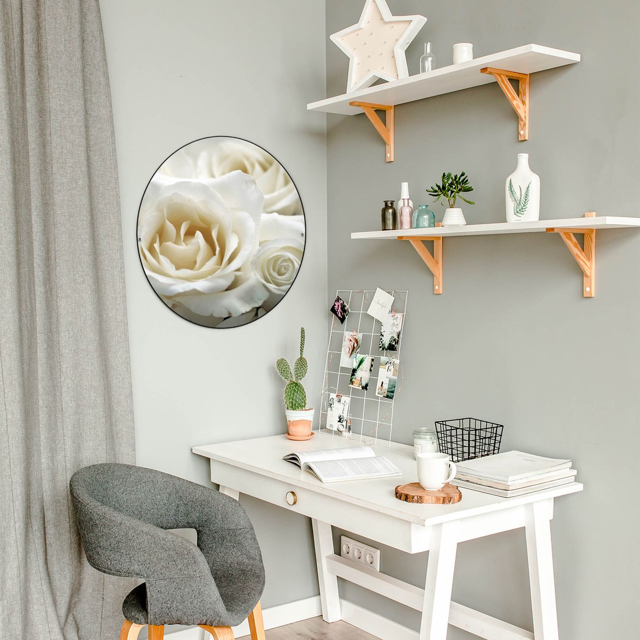 FUNKTION / DESIGN Die banjado Magnettafel mit dem Motiv Motiv White Roses bringt Ordnung in Ihr Zettelchaos. Fotos, Termine, Notizen oder Rezepte lassen Sich hier stilvoll mit Magneten ordnen, Sie behalten alles im Blick. Die Design Magnetwand ist beschreibbar und wieder abwischbar. Mit dieser Pinnwand haben Sie auch ohne Notizen und Magneten ein schönes Dekoelement. Das Format bietet Ihnen ausreichend Platz um alle wichtigen Informationen im Blick zu behalten. DETAILS / NUTZEN Die magnetische Metall Pinnwand besteht aus schwarz lackiertem Stahl. Sie hat einen Durchmesser von 47cm. Es befinden sich an den Seiten zwei vorgefertigte Löcher die eine schnelle und unkomplizierte Anbringung ermöglichen. Das Motiv ist mit einem seidenmatten Laminat versehen und schützt so zusätzlich vor Kratzern. Es halten alle handelsüblichen Magneten daran. Wir sind ein kleines Team aus dem Herzen von Sachsen. Wir fertigen alle Artikel von Hand für Sie an, Sie erhalten keine preiswerte Importware. Auf Wunsch können Sie auch Ihr eigenes Foto auf die Magnettafel aufbringen, schreiben Sie uns an.