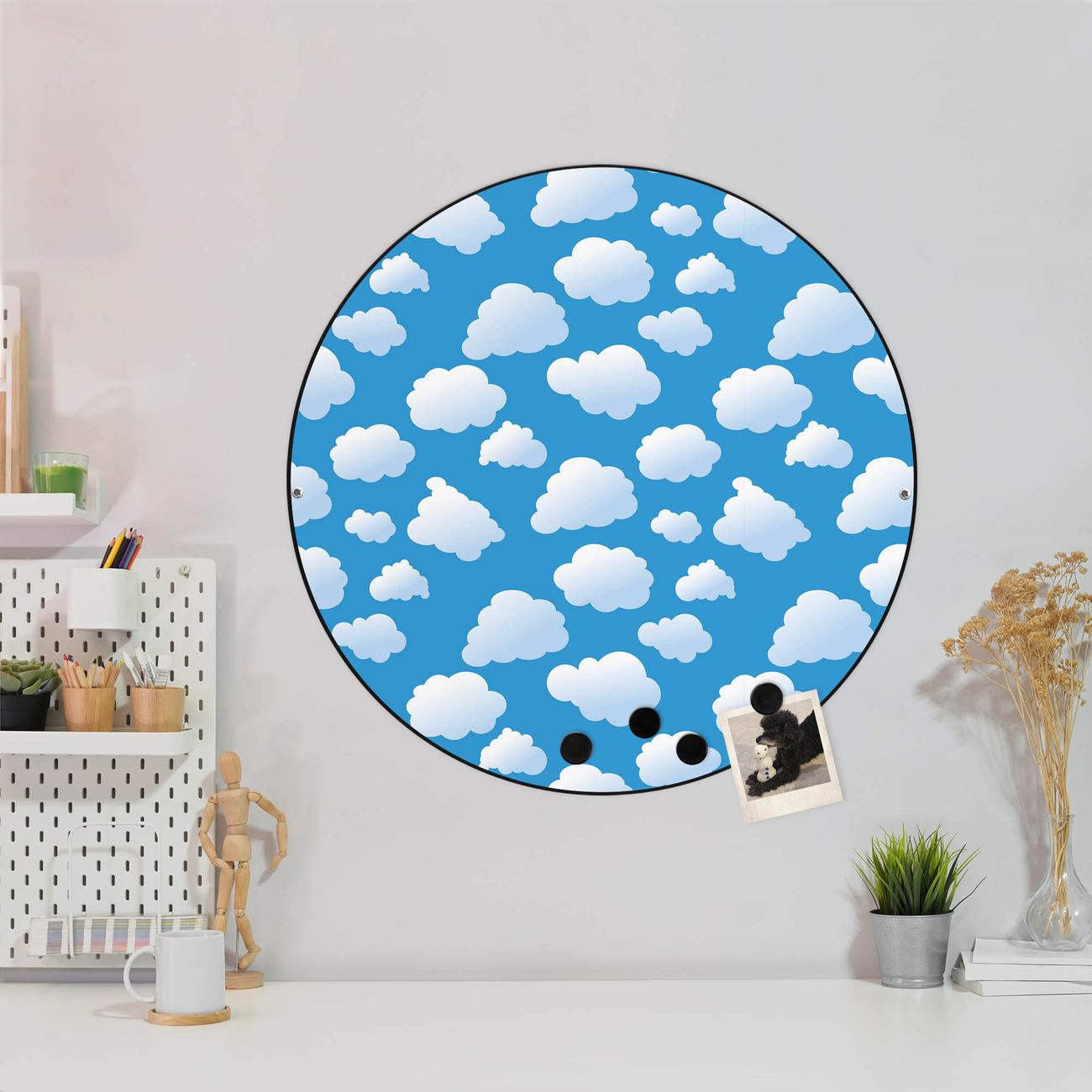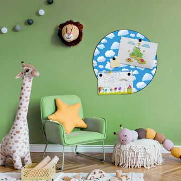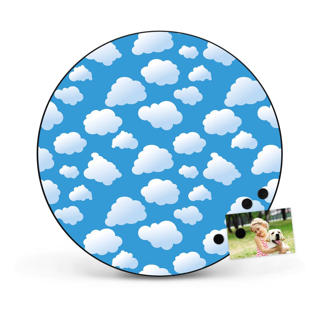 FUNKTION / DESIGN Die banjado Magnettafel mit dem Motiv Motiv Wölkchen bringt Ordnung in Ihr Zettelchaos. Fotos, Termine, Notizen oder Rezepte lassen Sich hier stilvoll mit Magneten ordnen, Sie behalten alles im Blick. Die Design Magnetwand ist beschreibbar und wieder abwischbar. Mit dieser Pinnwand haben Sie auch ohne Notizen und Magneten ein schönes Dekoelement. Das Format bietet Ihnen ausreichend Platz um alle wichtigen Informationen im Blick zu behalten. DETAILS / NUTZEN Die magnetische Metall Pinnwand besteht aus schwarz lackiertem Stahl. Sie hat einen Durchmesser von 47cm. Es befinden sich an den Seiten zwei vorgefertigte Löcher die eine schnelle und unkomplizierte Anbringung ermöglichen. Das Motiv ist mit einem seidenmatten Laminat versehen und schützt so zusätzlich vor Kratzern. Es halten alle handelsüblichen Magneten daran. Wir sind ein kleines Team aus dem Herzen von Sachsen. Wir fertigen alle Artikel von Hand für Sie an, Sie erhalten keine preiswerte Importware. Auf Wunsch können Sie auch Ihr eigenes Foto auf die Magnettafel aufbringen, schreiben Sie uns an.