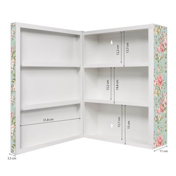 Der Medizinschrank ist gesamt 35x46x15cm groß und wiegt ca. 3900g. Der Türanschlag ist links und kann nicht verändert werden, die Fronttür öffnet ca. 115°. Die Folierung befindet sich auf der Front und den Seiten. Das Gehäuse ist zeitlos weiß und aus Stahl gefertigt. Die innenliegenden Fächer haben verschiedene Größen für unterschiedliche Aufbewahrungsmöglichkeiten, in der Innentür können ebenfalls Dinge abgelegt werden. Befestigt wird der Medizinschrank an 4 Stellen auf der Rückseite, Sie erhalten 3 Schlüssel.