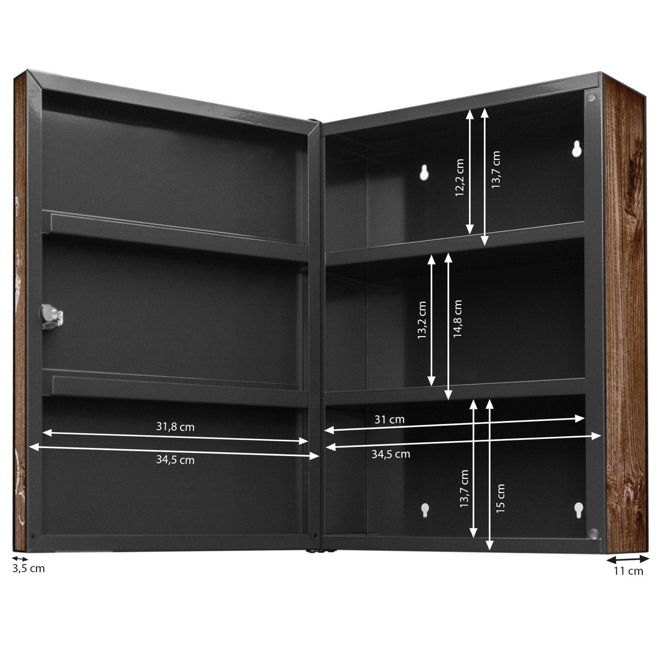 Der Medizinschrank ist gesamt 35x46x15cm groß und wiegt ca. 3900g. Der Türanschlag ist links und kann nicht verändert werden, die Fronttür öffnet ca. 115°. Die Folierung befindet sich auf der Front und den Seiten. Das Gehäuse ist zeitlos anthrazit und aus Stahl gefertigt. Die innenliegenden Fächer haben verschiedene Größen für unterschiedliche Aufbewahrungsmöglichkeiten, in der Innentür können ebenfalls Dinge abgelegt werden. Befestigt wird der Medizinschrank an 4 Stellen auf der Rückseite, Sie erhalten 3 Schlüssel.