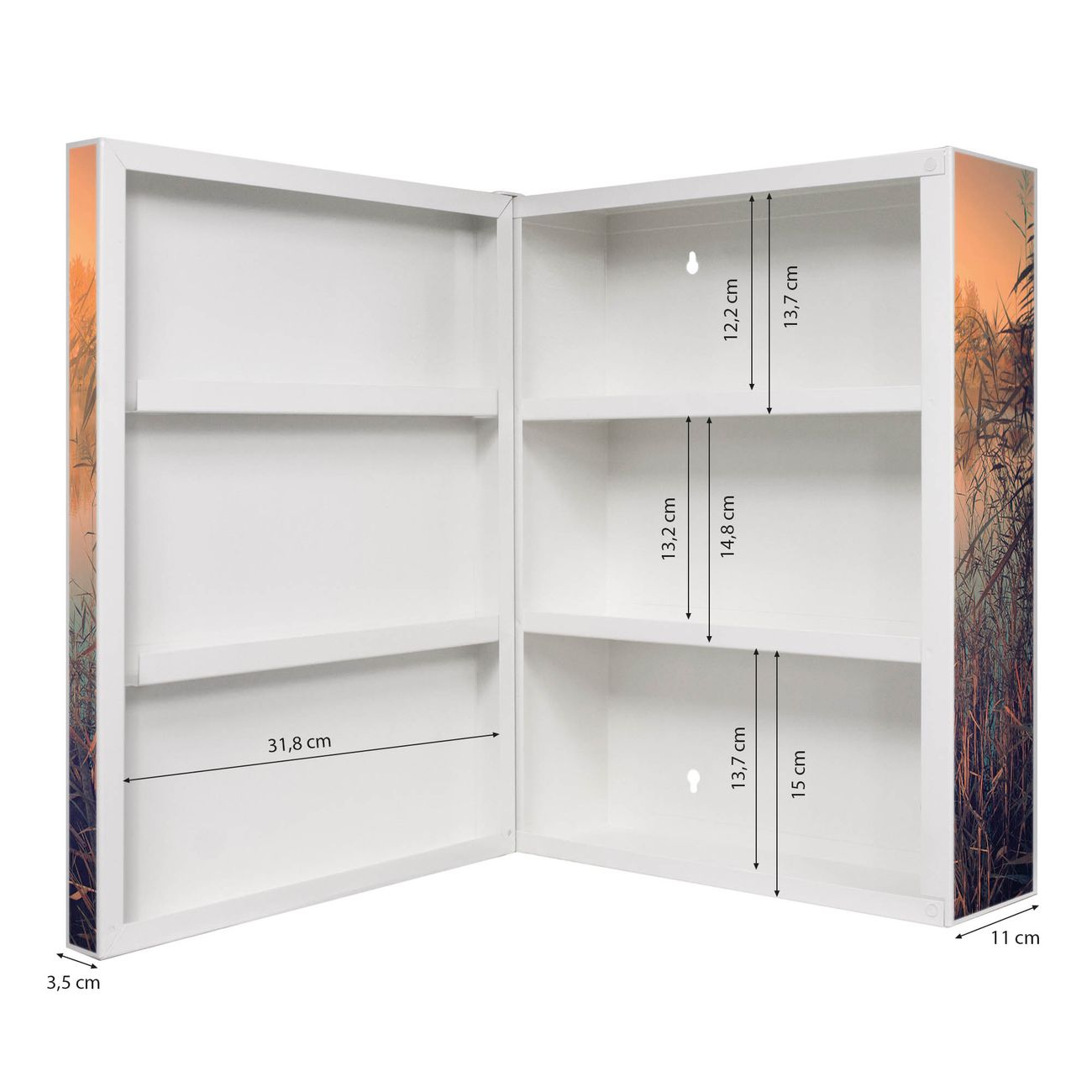 Der Medizinschrank ist gesamt 35x46x15cm groß und wiegt ca. 3900g. Der Türanschlag ist links und kann nicht verändert werden, die Fronttür öffnet ca. 115°. Die Folierung befindet sich auf der Front und den Seiten. Das Gehäuse ist zeitlos weiß und aus Stahl gefertigt. Die innenliegenden Fächer haben verschiedene Größen für unterschiedliche Aufbewahrungsmöglichkeiten, in der Innentür können ebenfalls Dinge abgelegt werden. Befestigt wird der Medizinschrank an 4 Stellen auf der Rückseite, Sie erhalten 3 Schlüssel.