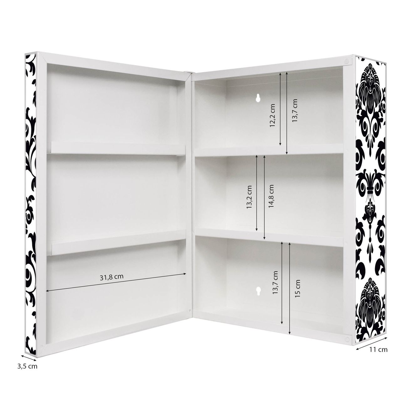 Der Medizinschrank ist gesamt 35x46x15cm groß und wiegt ca. 3900g. Der Türanschlag ist links und kann nicht verändert werden, die Fronttür öffnet ca. 115°. Die Folierung befindet sich auf der Front und den Seiten. Das Gehäuse ist zeitlos weiß und aus Stahl gefertigt. Die innenliegenden Fächer haben verschiedene Größen für unterschiedliche Aufbewahrungsmöglichkeiten, in der Innentür können ebenfalls Dinge abgelegt werden. Befestigt wird der Medizinschrank an 4 Stellen auf der Rückseite, Sie erhalten 3 Schlüssel.