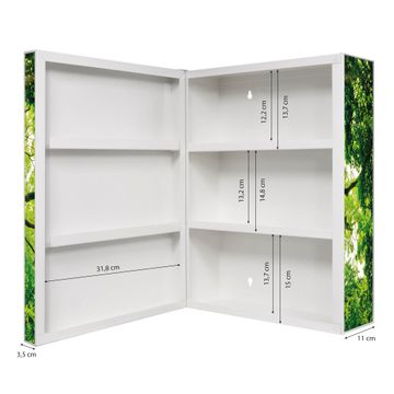 Der Medizinschrank ist gesamt 35x46x15cm groß und wiegt ca. 3900g. Der Türanschlag ist links und kann nicht verändert werden, die Fronttür öffnet ca. 115°. Die Folierung befindet sich auf der Front und den Seiten. Das Gehäuse ist zeitlos weiß und aus Stahl gefertigt. Die innenliegenden Fächer haben verschiedene Größen für unterschiedliche Aufbewahrungsmöglichkeiten, in der Innentür können ebenfalls Dinge abgelegt werden. Befestigt wird der Medizinschrank an 4 Stellen auf der Rückseite, Sie erhalten 3 Schlüssel.