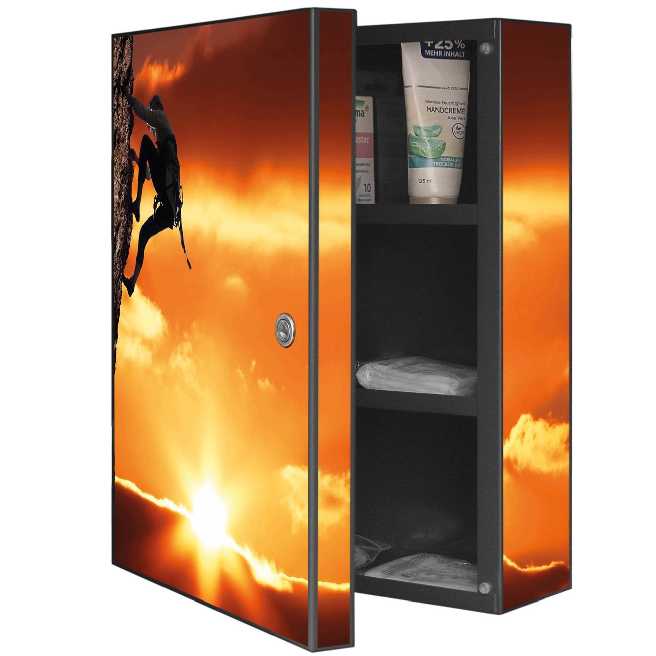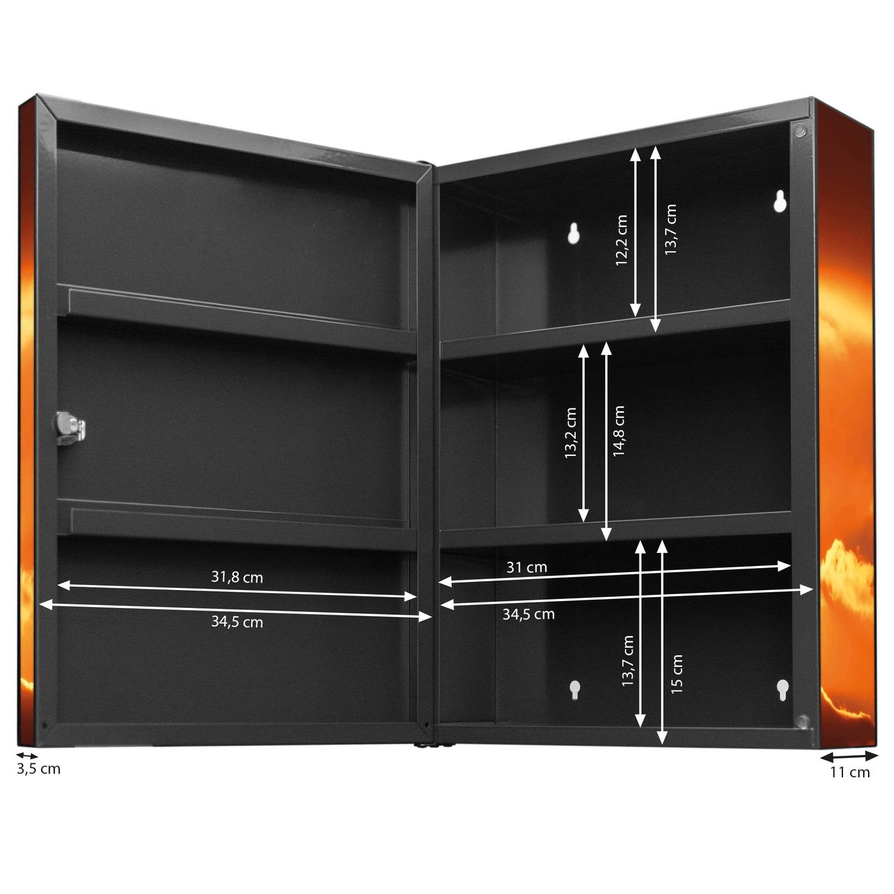 Der Medizinschrank ist gesamt 35x46x15cm groß und wiegt ca. 3900g. Der Türanschlag ist links und kann nicht verändert werden, die Fronttür öffnet ca. 115°. Die Folierung befindet sich auf der Front und den Seiten. Das Gehäuse ist zeitlos anthrazit und aus Stahl gefertigt. Die innenliegenden Fächer haben verschiedene Größen für unterschiedliche Aufbewahrungsmöglichkeiten, in der Innentür können ebenfalls Dinge abgelegt werden. Befestigt wird der Medizinschrank an 4 Stellen auf der Rückseite, Sie erhalten 3 Schlüssel.