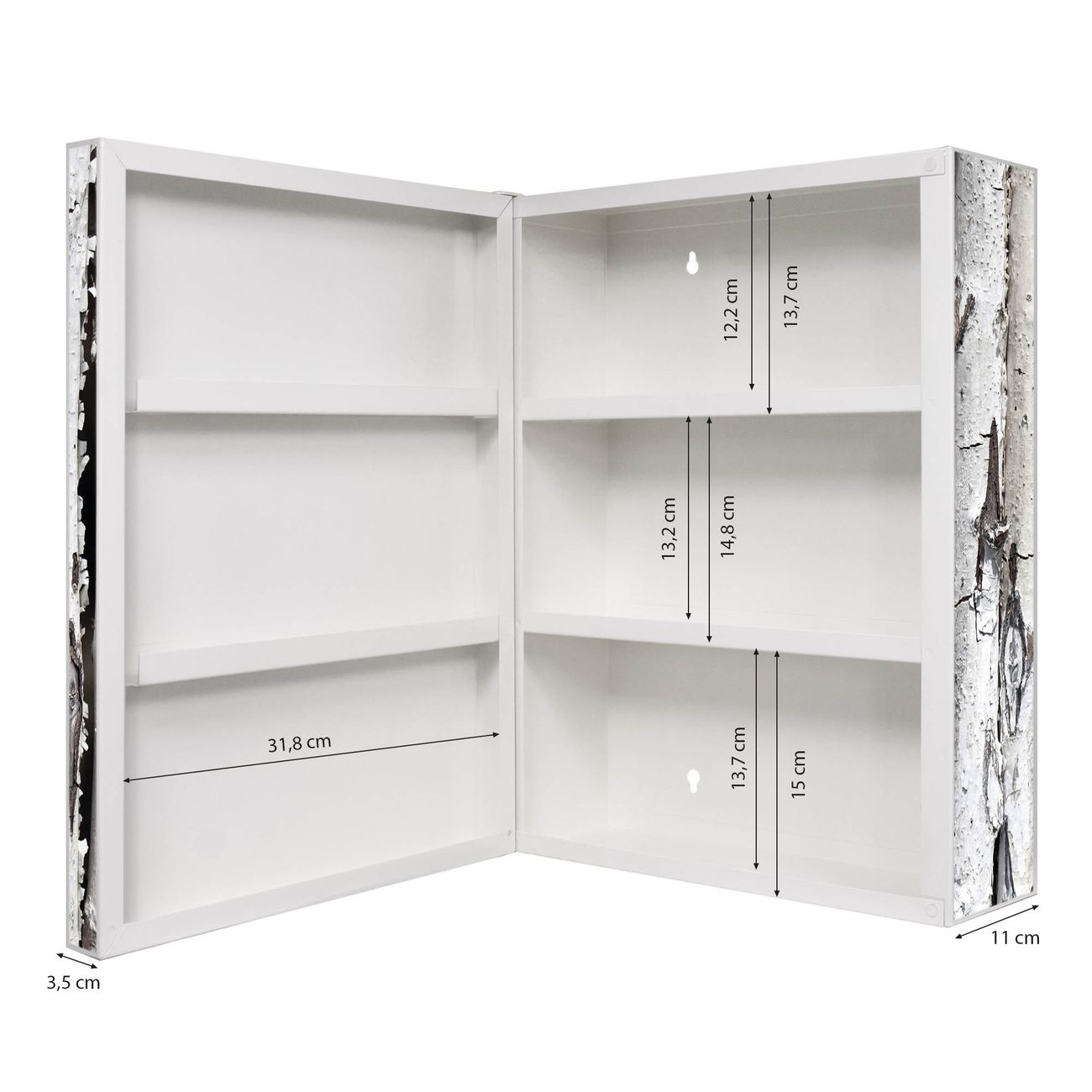 Der Medizinschrank ist gesamt 35x46x15cm groß und wiegt ca. 3900g. Der Türanschlag ist links und kann nicht verändert werden, die Fronttür öffnet ca. 115°. Die Folierung befindet sich auf der Front und den Seiten. Das Gehäuse ist zeitlos weiß und aus Stahl gefertigt. Die innenliegenden Fächer haben verschiedene Größen für unterschiedliche Aufbewahrungsmöglichkeiten, in der Innentür können ebenfalls Dinge abgelegt werden. Befestigt wird der Medizinschrank an 4 Stellen auf der Rückseite, Sie erhalten 3 Schlüssel.