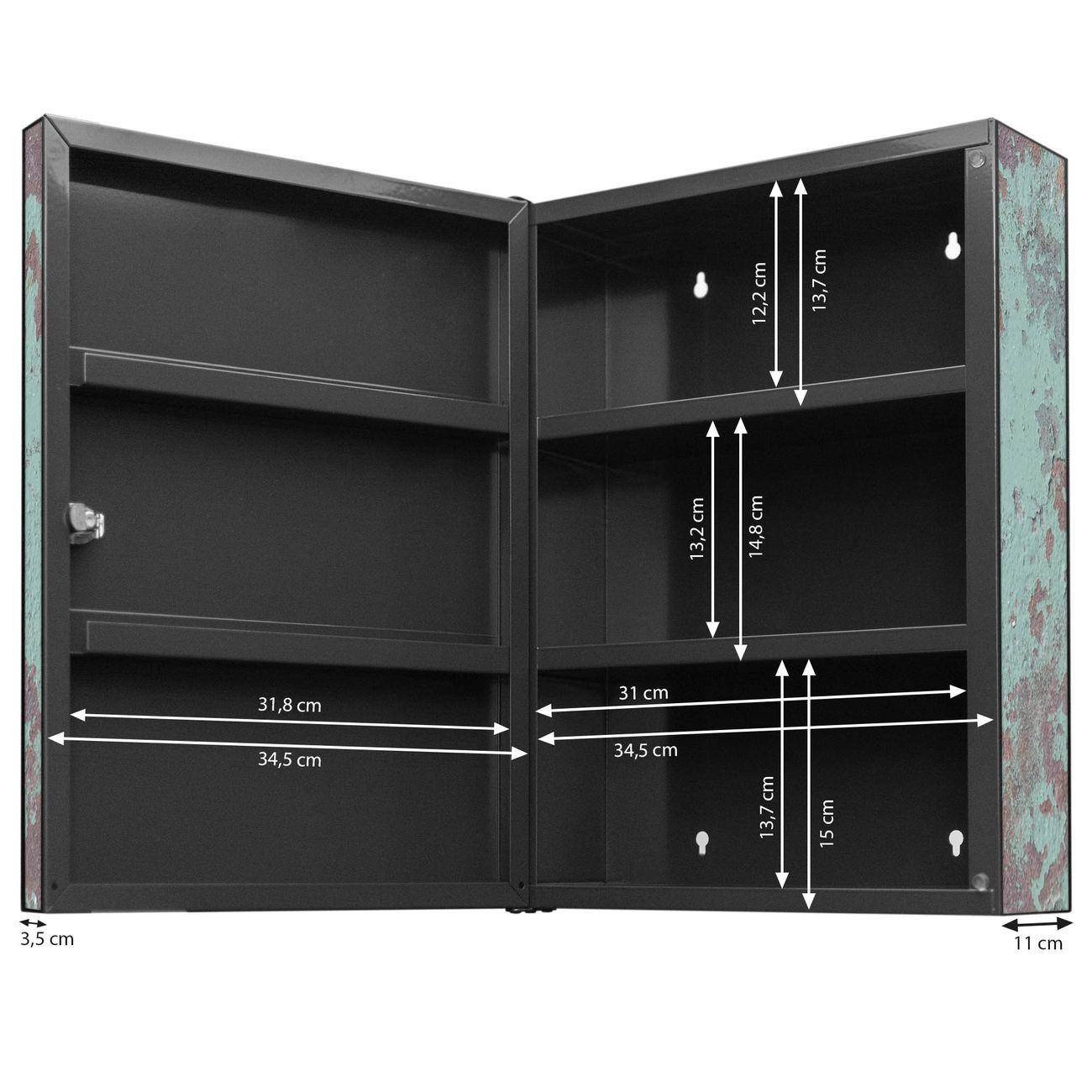 Der Medizinschrank ist gesamt 35x46x15cm groß und wiegt ca. 3900g. Der Türanschlag ist links und kann nicht verändert werden, die Fronttür öffnet ca. 115°. Die Folierung befindet sich auf der Front und den Seiten. Das Gehäuse ist zeitlos anthrazit und aus Stahl gefertigt. Die innenliegenden Fächer haben verschiedene Größen für unterschiedliche Aufbewahrungsmöglichkeiten, in der Innentür können ebenfalls Dinge abgelegt werden. Befestigt wird der Medizinschrank an 4 Stellen auf der Rückseite, Sie erhalten 3 Schlüssel.