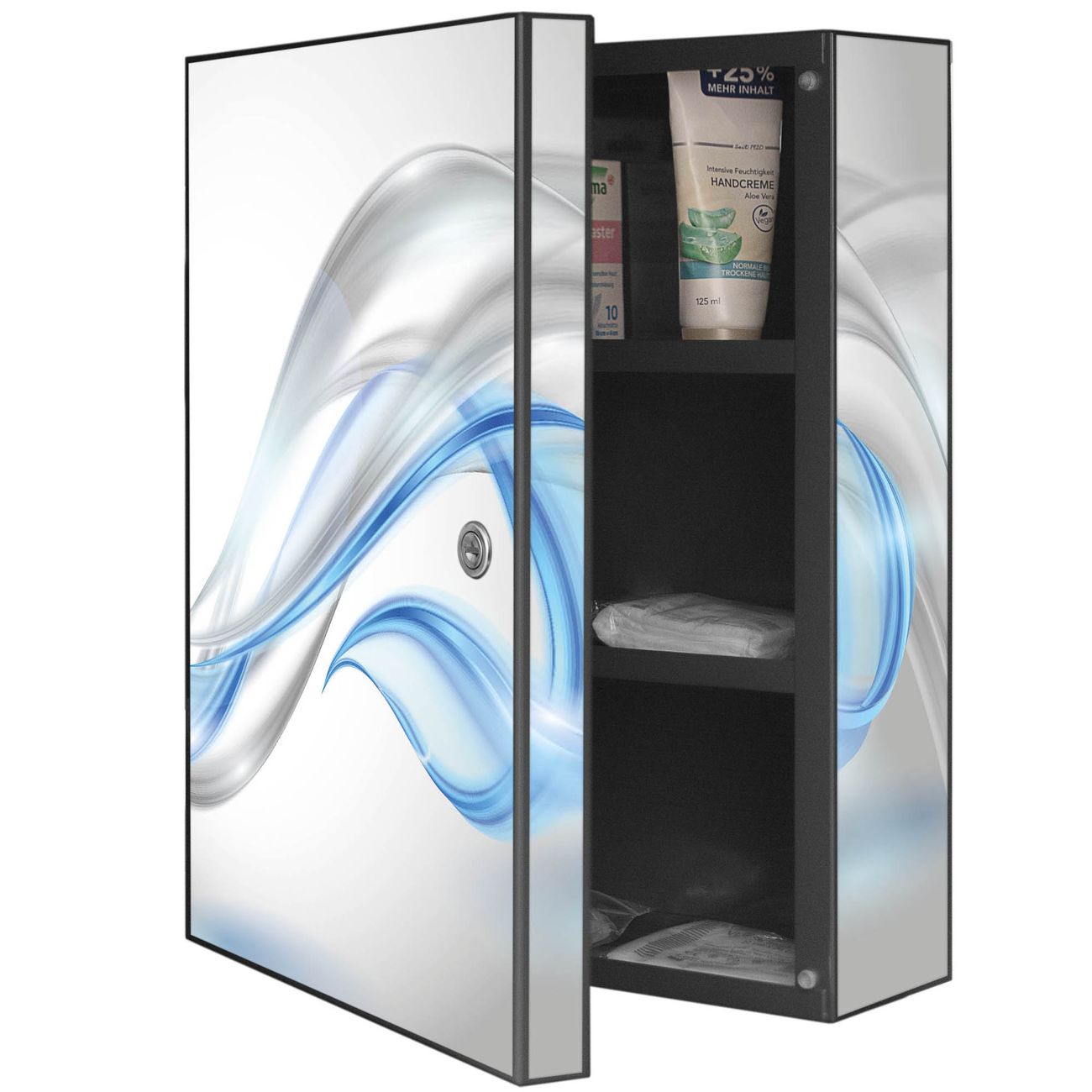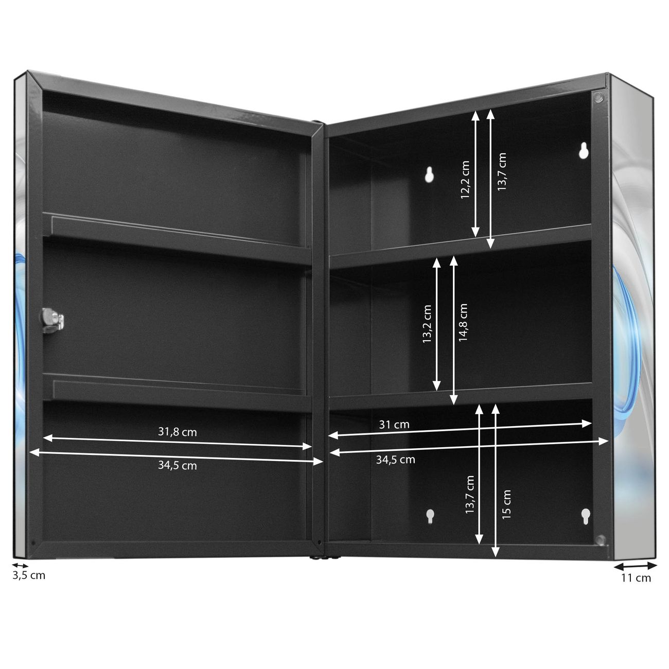 Der Medizinschrank ist gesamt 35x46x15cm groß und wiegt ca. 3900g. Der Türanschlag ist links und kann nicht verändert werden, die Fronttür öffnet ca. 115°. Die Folierung befindet sich auf der Front und den Seiten. Das Gehäuse ist zeitlos anthrazit und aus Stahl gefertigt. Die innenliegenden Fächer haben verschiedene Größen für unterschiedliche Aufbewahrungsmöglichkeiten, in der Innentür können ebenfalls Dinge abgelegt werden. Befestigt wird der Medizinschrank an 4 Stellen auf der Rückseite, Sie erhalten 3 Schlüssel.
