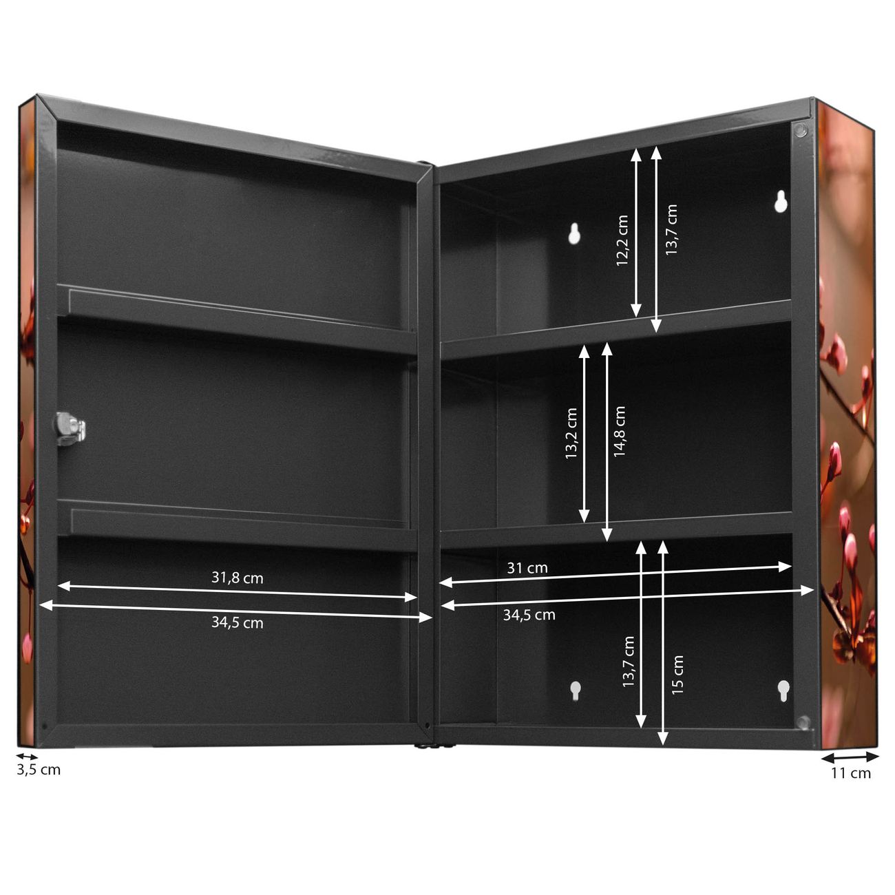 Der Medizinschrank ist gesamt 35x46x15cm groß und wiegt ca. 3900g. Der Türanschlag ist links und kann nicht verändert werden, die Fronttür öffnet ca. 115°. Die Folierung befindet sich auf der Front und den Seiten. Das Gehäuse ist zeitlos anthrazit und aus Stahl gefertigt. Die innenliegenden Fächer haben verschiedene Größen für unterschiedliche Aufbewahrungsmöglichkeiten, in der Innentür können ebenfalls Dinge abgelegt werden. Befestigt wird der Medizinschrank an 4 Stellen auf der Rückseite, Sie erhalten 3 Schlüssel.
