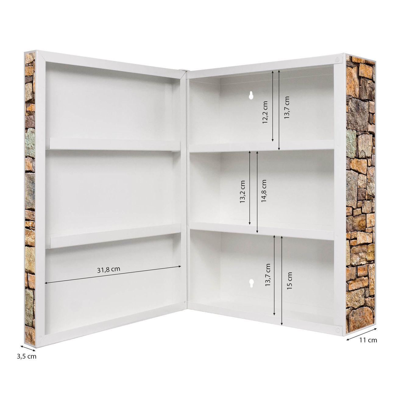 Der Medizinschrank ist gesamt 35x46x15cm groß und wiegt ca. 3900g. Der Türanschlag ist links und kann nicht verändert werden, die Fronttür öffnet ca. 115°. Die Folierung befindet sich auf der Front und den Seiten. Das Gehäuse ist zeitlos weiß und aus Stahl gefertigt. Die innenliegenden Fächer haben verschiedene Größen für unterschiedliche Aufbewahrungsmöglichkeiten, in der Innentür können ebenfalls Dinge abgelegt werden. Befestigt wird der Medizinschrank an 4 Stellen auf der Rückseite, Sie erhalten 3 Schlüssel.