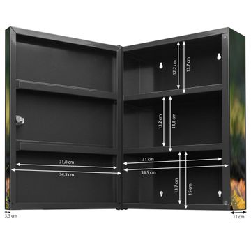 Der Medizinschrank ist gesamt 35x46x15cm groß und wiegt ca. 3900g. Der Türanschlag ist links und kann nicht verändert werden, die Fronttür öffnet ca. 115°. Die Folierung befindet sich auf der Front und den Seiten. Das Gehäuse ist zeitlos anthrazit und aus Stahl gefertigt. Die innenliegenden Fächer haben verschiedene Größen für unterschiedliche Aufbewahrungsmöglichkeiten, in der Innentür können ebenfalls Dinge abgelegt werden. Befestigt wird der Medizinschrank an 4 Stellen auf der Rückseite, Sie erhalten 3 Schlüssel.
