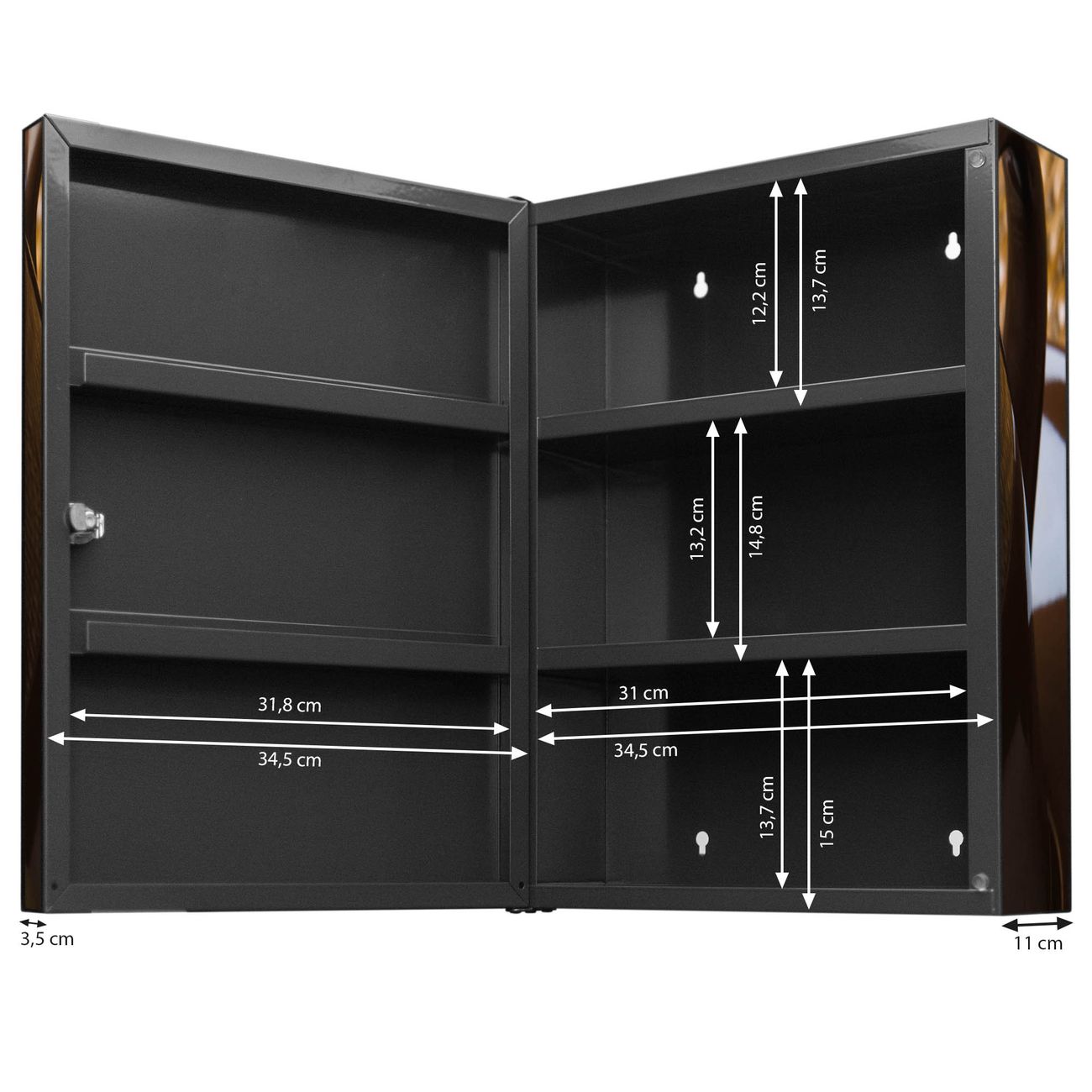 Der Medizinschrank ist gesamt 35x46x15cm groß und wiegt ca. 3900g. Der Türanschlag ist links und kann nicht verändert werden, die Fronttür öffnet ca. 115°. Die Folierung befindet sich auf der Front und den Seiten. Das Gehäuse ist zeitlos anthrazit und aus Stahl gefertigt. Die innenliegenden Fächer haben verschiedene Größen für unterschiedliche Aufbewahrungsmöglichkeiten, in der Innentür können ebenfalls Dinge abgelegt werden. Befestigt wird der Medizinschrank an 4 Stellen auf der Rückseite, Sie erhalten 3 Schlüssel.