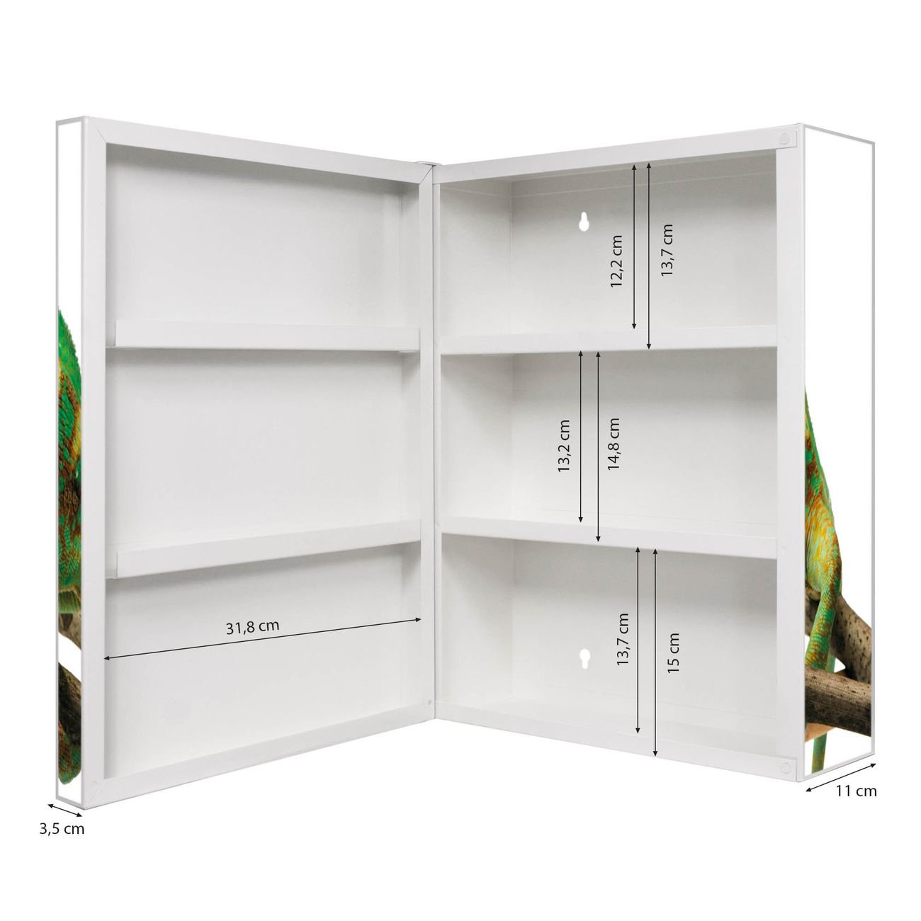 Der Medizinschrank ist gesamt 35x46x15cm groß und wiegt ca. 3900g. Der Türanschlag ist links und kann nicht verändert werden, die Fronttür öffnet ca. 115°. Die Folierung befindet sich auf der Front und den Seiten. Das Gehäuse ist zeitlos weiß und aus Stahl gefertigt. Die innenliegenden Fächer haben verschiedene Größen für unterschiedliche Aufbewahrungsmöglichkeiten, in der Innentür können ebenfalls Dinge abgelegt werden. Befestigt wird der Medizinschrank an 4 Stellen auf der Rückseite, Sie erhalten 3 Schlüssel.