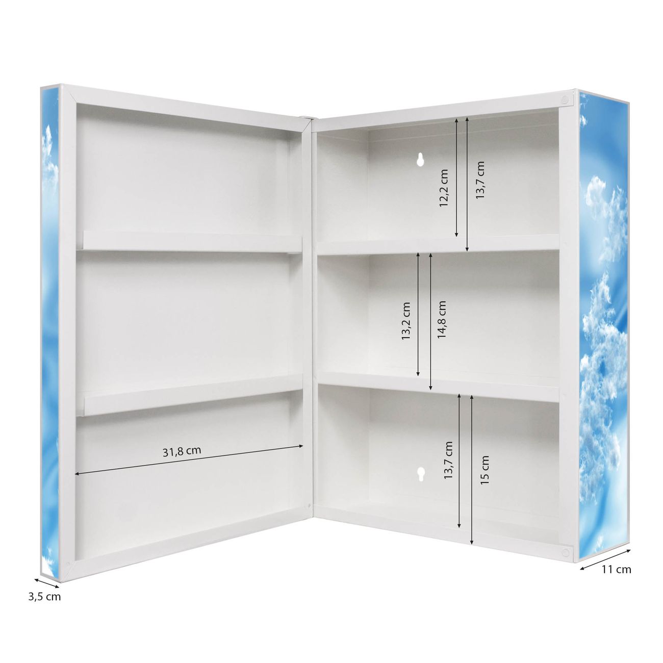 Der Medizinschrank ist gesamt 35x46x15cm groß und wiegt ca. 3900g. Der Türanschlag ist links und kann nicht verändert werden, die Fronttür öffnet ca. 115°. Die Folierung befindet sich auf der Front und den Seiten. Das Gehäuse ist zeitlos weiß und aus Stahl gefertigt. Die innenliegenden Fächer haben verschiedene Größen für unterschiedliche Aufbewahrungsmöglichkeiten, in der Innentür können ebenfalls Dinge abgelegt werden. Befestigt wird der Medizinschrank an 4 Stellen auf der Rückseite, Sie erhalten 3 Schlüssel.