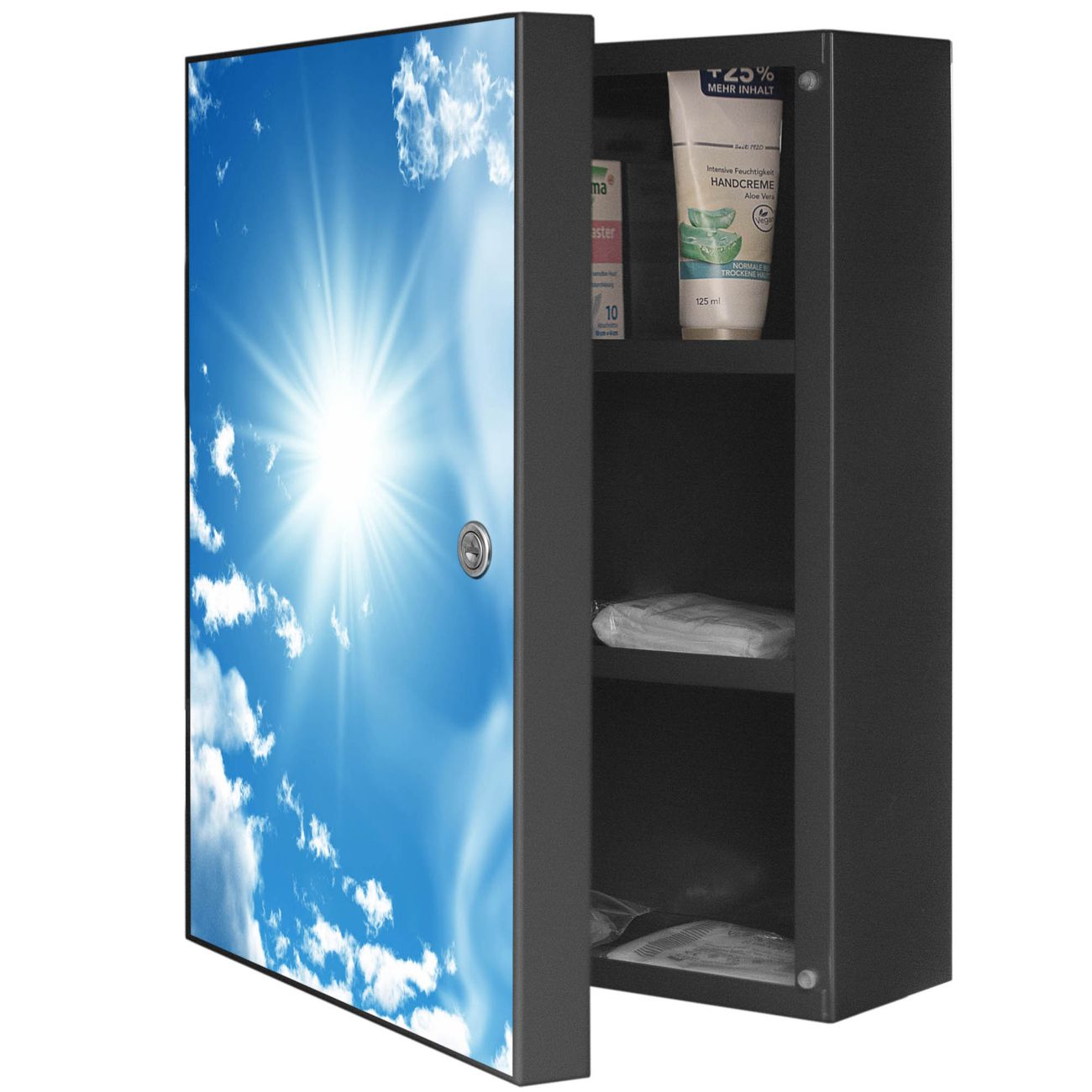 Der Medizinschrank ist gesamt 35x46x15cm groß und wiegt ca. 3900g. Der Türanschlag ist links und kann nicht verändert werden, die Fronttür öffnet ca. 115°. Die Folierung befindet sich auf der Front. Das Gehäuse ist zeitlos anthrazit und aus Stahl gefertigt. Die innenliegenden Fächer haben verschiedene Größen für unterschiedliche Aufbewahrungsmöglichkeiten, in der Innentür können ebenfalls Dinge abgelegt werden. Befestigt wird der Medizinschrank an 4 Stellen auf der Rückseite, Sie erhalten 3 Schlüssel.