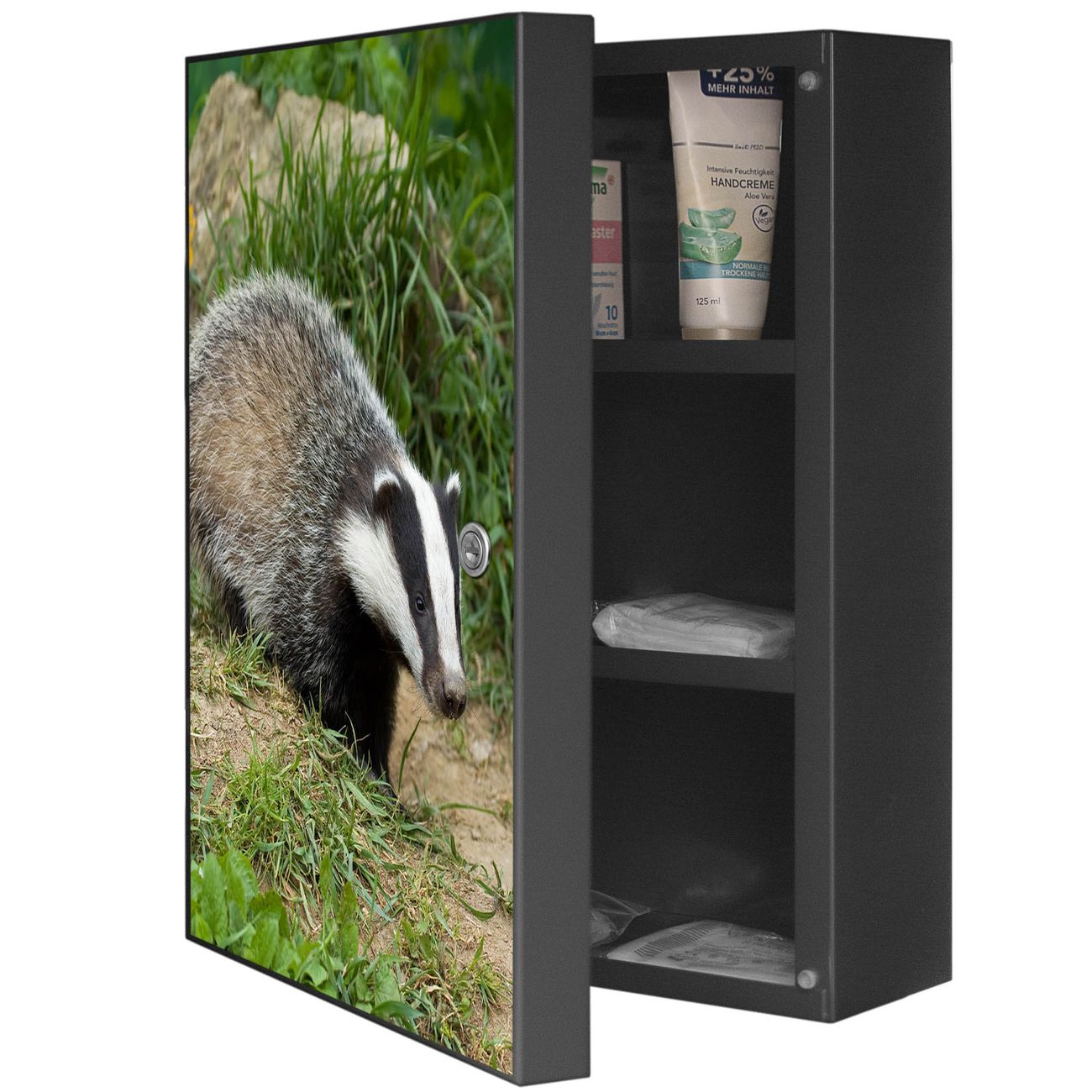 Der Medizinschrank ist gesamt 35x46x15cm groß und wiegt ca. 3900g. Der Türanschlag ist links und kann nicht verändert werden, die Fronttür öffnet ca. 115°. Die Folierung befindet sich auf der Front. Das Gehäuse ist zeitlos anthrazit und aus Stahl gefertigt. Die innenliegenden Fächer haben verschiedene Größen für unterschiedliche Aufbewahrungsmöglichkeiten, in der Innentür können ebenfalls Dinge abgelegt werden. Befestigt wird der Medizinschrank an 4 Stellen auf der Rückseite, Sie erhalten 3 Schlüssel.