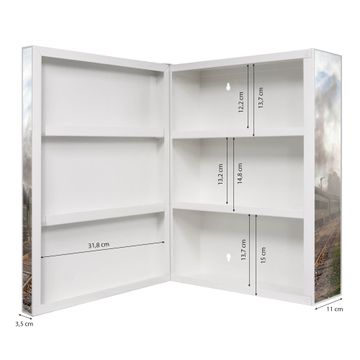 Der Medizinschrank ist gesamt 35x46x15cm groß und wiegt ca. 3900g. Der Türanschlag ist links und kann nicht verändert werden, die Fronttür öffnet ca. 115°. Die Folierung befindet sich auf der Front und den Seiten. Das Gehäuse ist zeitlos weiß und aus Stahl gefertigt. Die innenliegenden Fächer haben verschiedene Größen für unterschiedliche Aufbewahrungsmöglichkeiten, in der Innentür können ebenfalls Dinge abgelegt werden. Befestigt wird der Medizinschrank an 4 Stellen auf der Rückseite, Sie erhalten 3 Schlüssel.