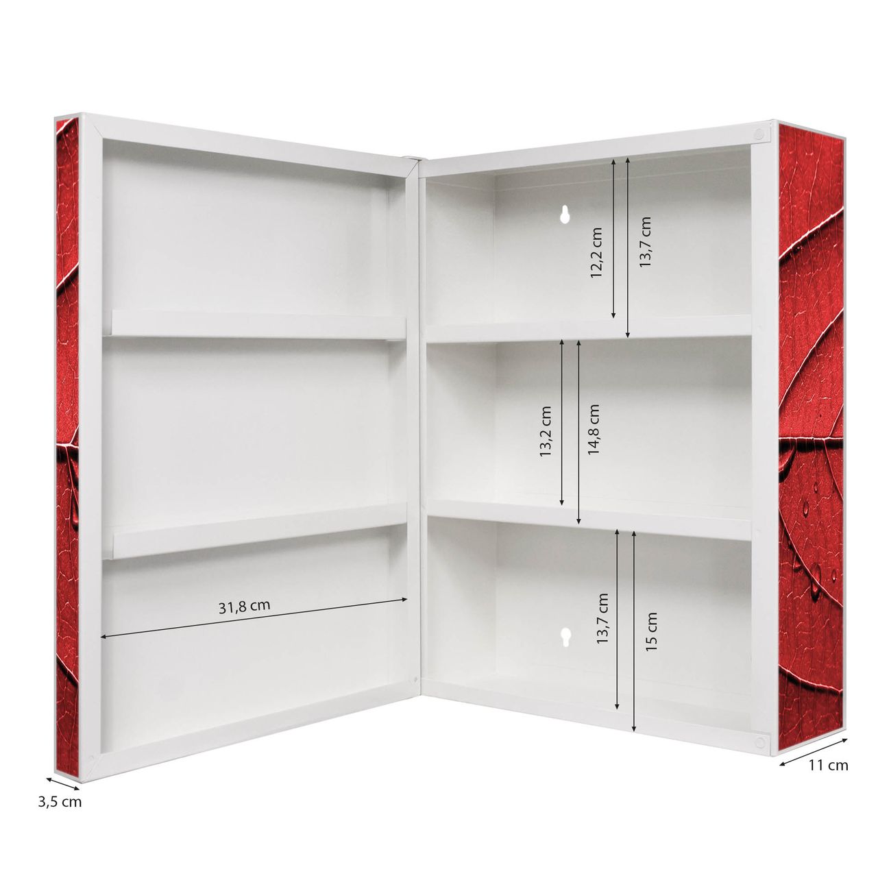 Der Medizinschrank ist gesamt 35x46x15cm groß und wiegt ca. 3900g. Der Türanschlag ist links und kann nicht verändert werden, die Fronttür öffnet ca. 115°. Die Folierung befindet sich auf der Front und den Seiten. Das Gehäuse ist zeitlos weiß und aus Stahl gefertigt. Die innenliegenden Fächer haben verschiedene Größen für unterschiedliche Aufbewahrungsmöglichkeiten, in der Innentür können ebenfalls Dinge abgelegt werden. Befestigt wird der Medizinschrank an 4 Stellen auf der Rückseite, Sie erhalten 3 Schlüssel.